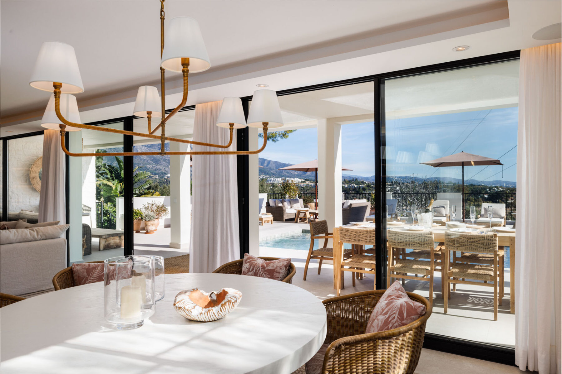 Inside, floor-to-ceiling glass opens to views of La Concha mountain top and a majestic pine tree spreads its branches beside the pool terrace, where elegant loungers and wide parasols create a comfortable spot to unwind.