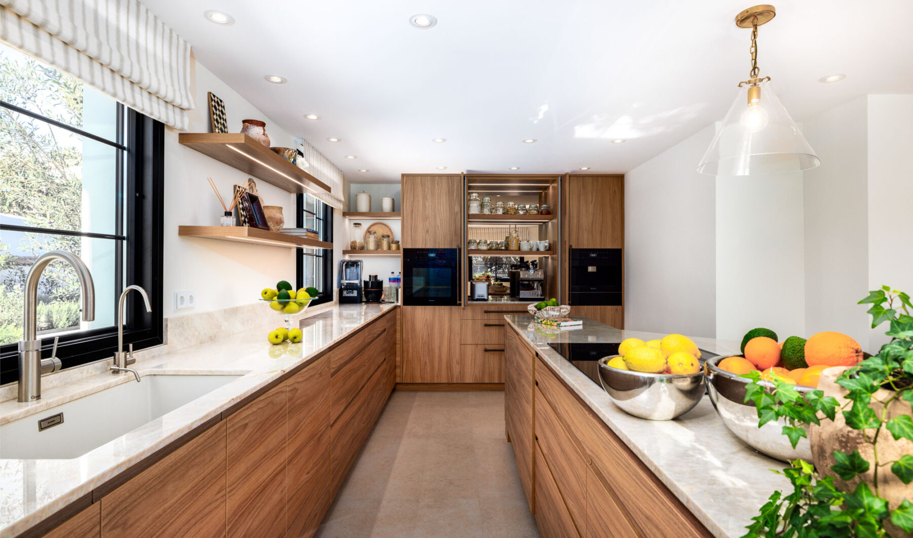 The kitchen’s design is modern and understated, with marble countertops and high-quality Miele and Siemens appliances, including an induction hob, hot water tap and water purifier.
