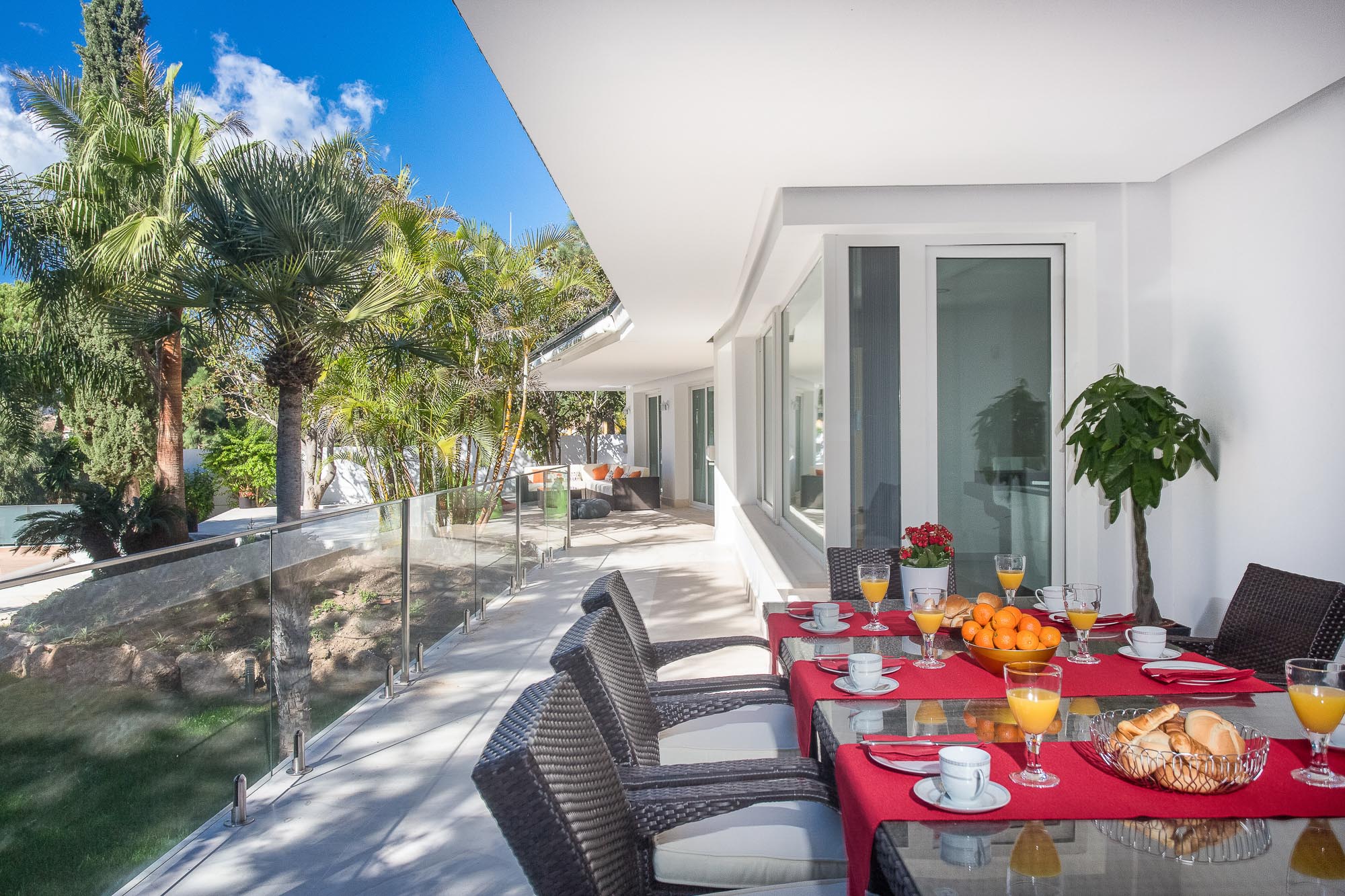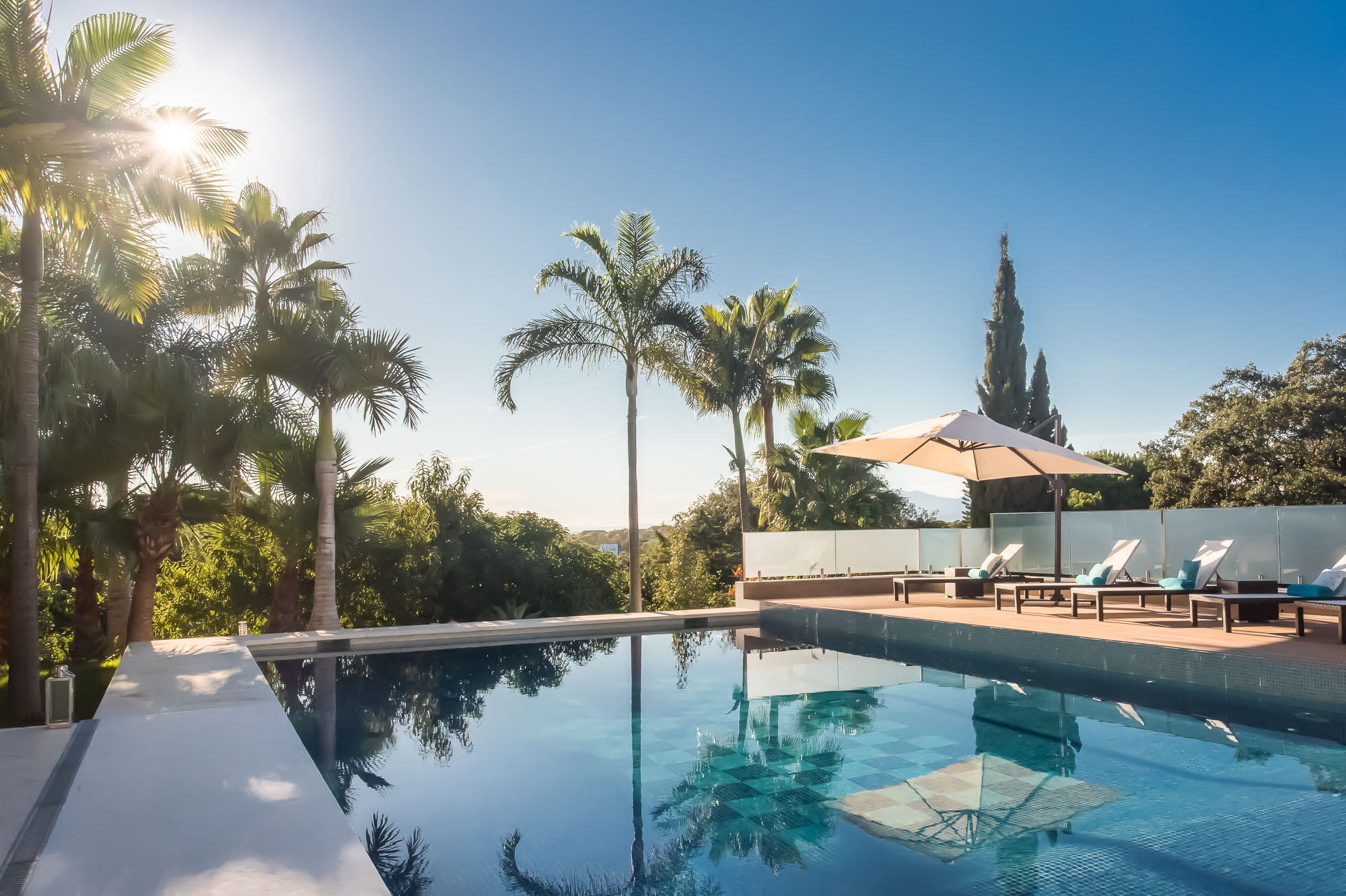 Villa Anja was designed for relaxation, both outdoors and in. Outside, beneath the warm Spanish sun and in view of Marbella and the Mediterranean, palms and sunbeds dot the spacious terrace and surround an unusually large pool – 16 metres (52.5 feet) long and perfect for swimming laps. Shaded areas offer lounger and sofa seating. There is dining for 8 at the pool and on the terrace.