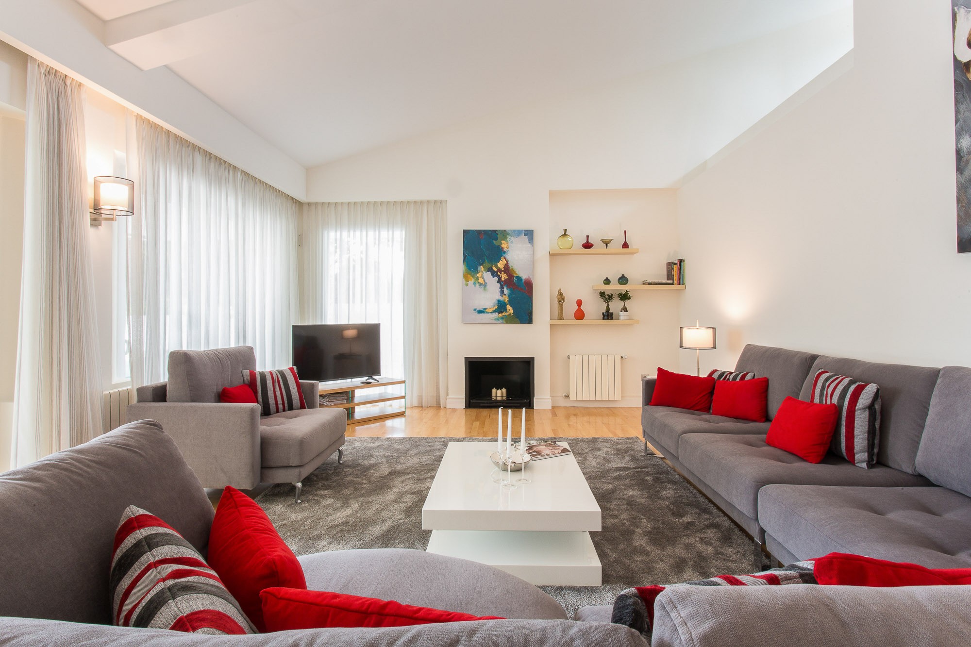 The focal point of the formal living is the real log fire, around which sit an oversized, overstuffed wraparound grey sofa and chair, complemented by designer red accent chairs, modern art, a contemporary coffee table, and a flat-screen television. A balcony overlooks the living room, and offers an office space perfect for catching up on your email.