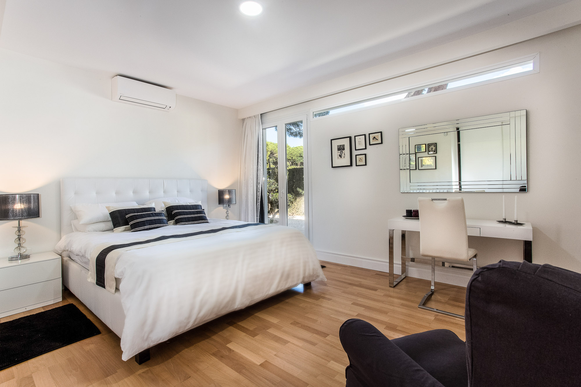 Guest Bedroom 1: Ground floor guest bedroom, black and white tones, super-king size bed, en-suite shower room. French doors to front garden.