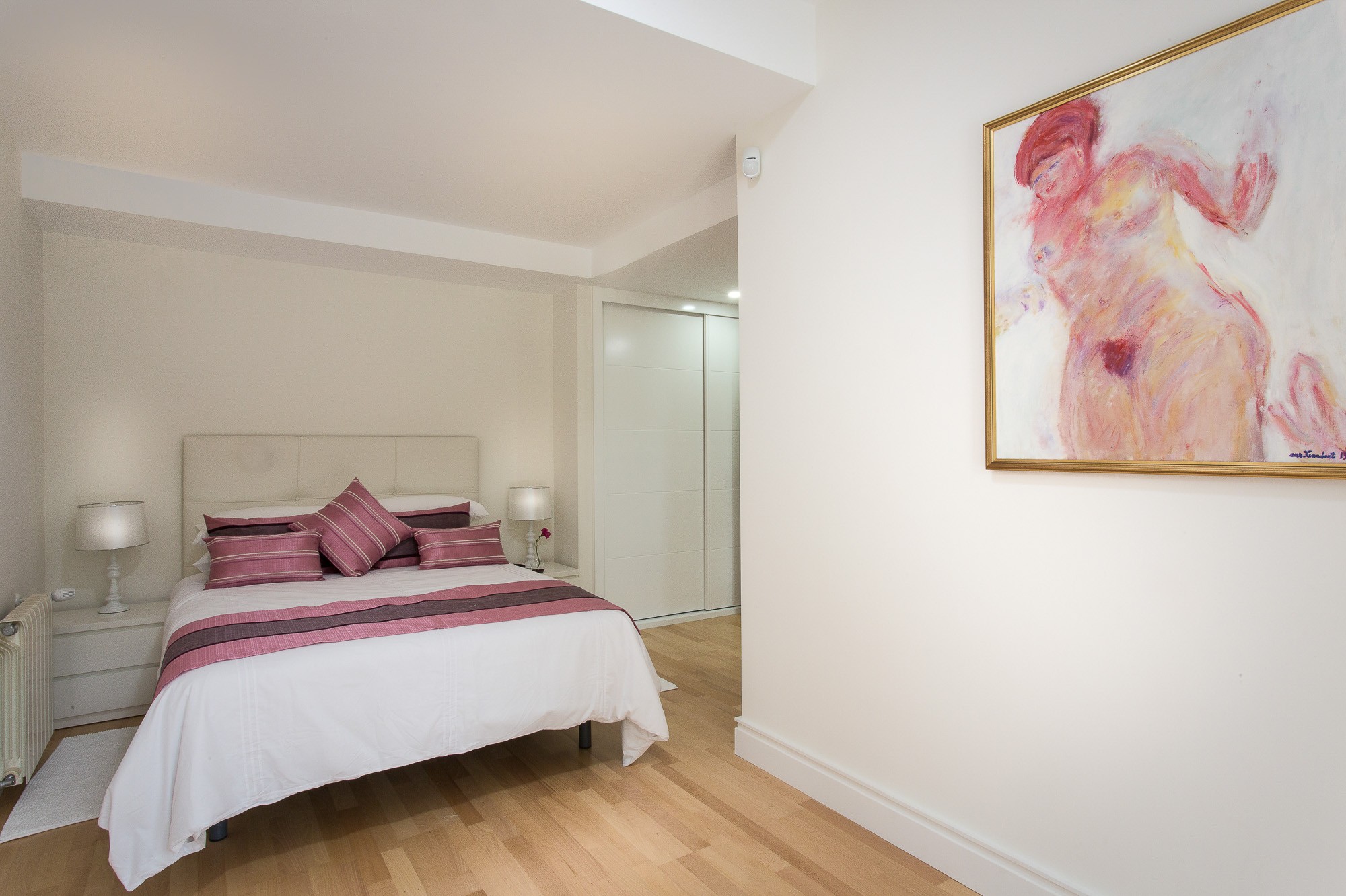 Guest Bedroom 2: Ground floor Guest Bedroom, dusky pink tones, king-size bed space for cot or foldaway bed for children, en-suite shower room, French doors to side garden leading to pool.