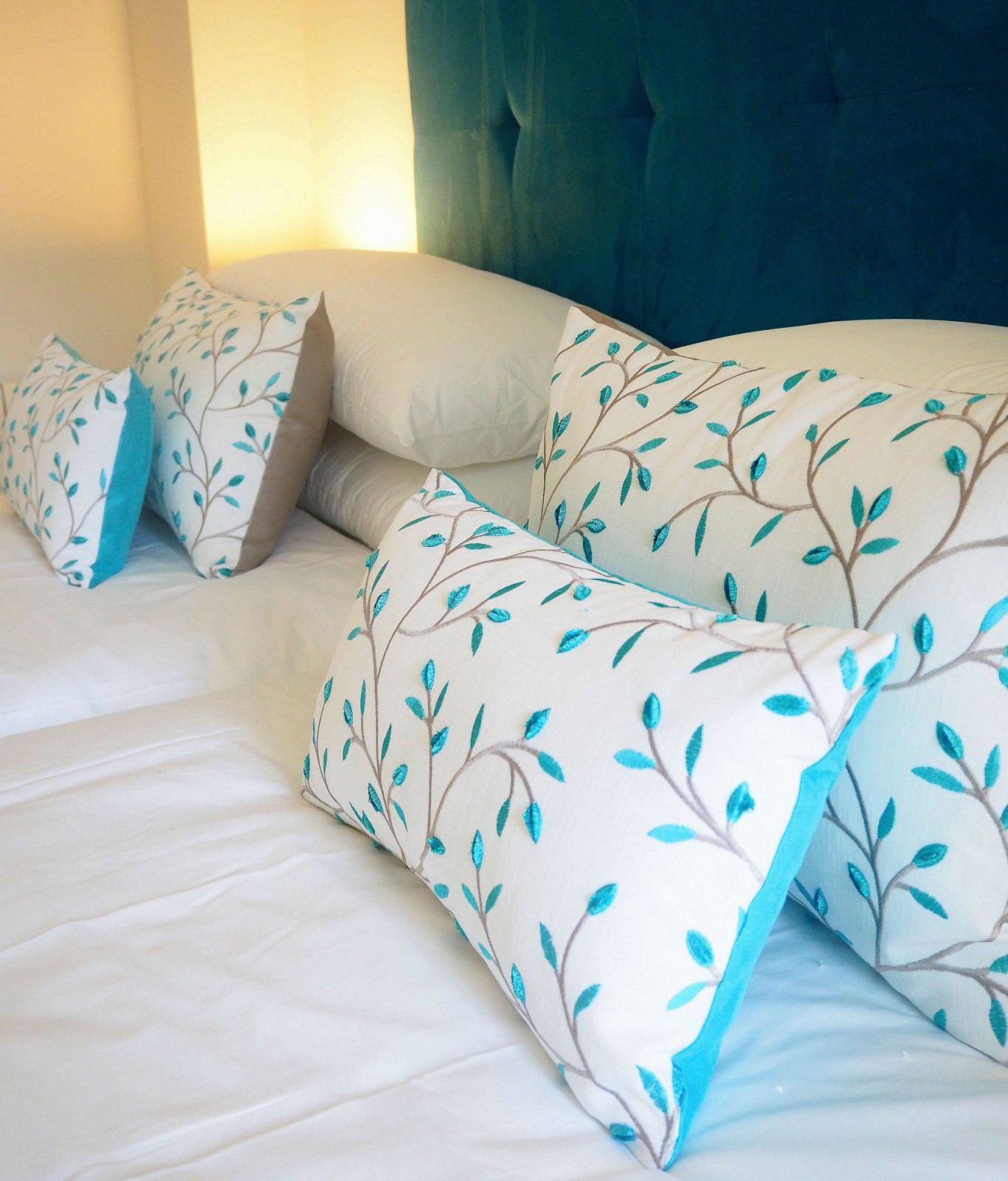 Guest Bedroom 4: Ground floor guest bedroom, twin beds, turquoise tones, French doors to front garden, shared family bathroom with spa bath and separate shower.