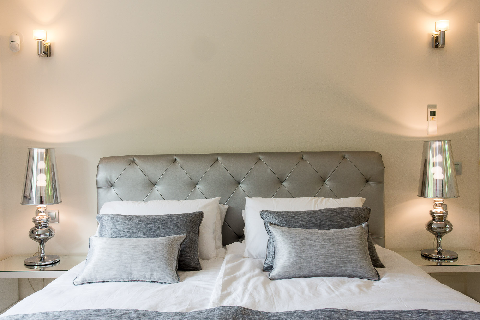 Guest Bedroom 3: Ground floor guest bedroom, king-size bed Scandinavian white and floral tones, integrated hotel-style shower room, French doors to front garden.