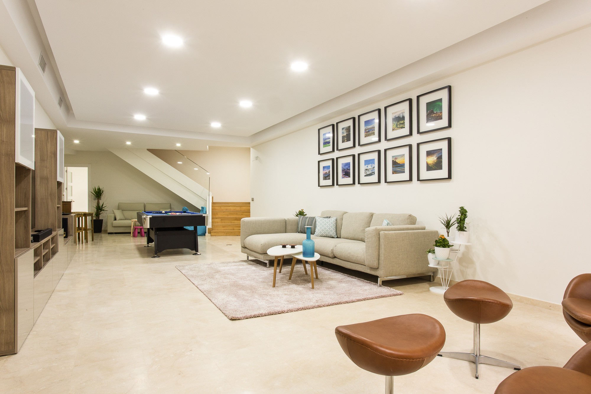 The hub for family fun is located in the basement-level entertainment room, which offers a pool table, as well as a large sofa, leather side chairs, and an entertainment area equipped with large-screen television and blackout blinds. Just adjacent, a cosy TV room offers its own sofa and comfortable bean bags.