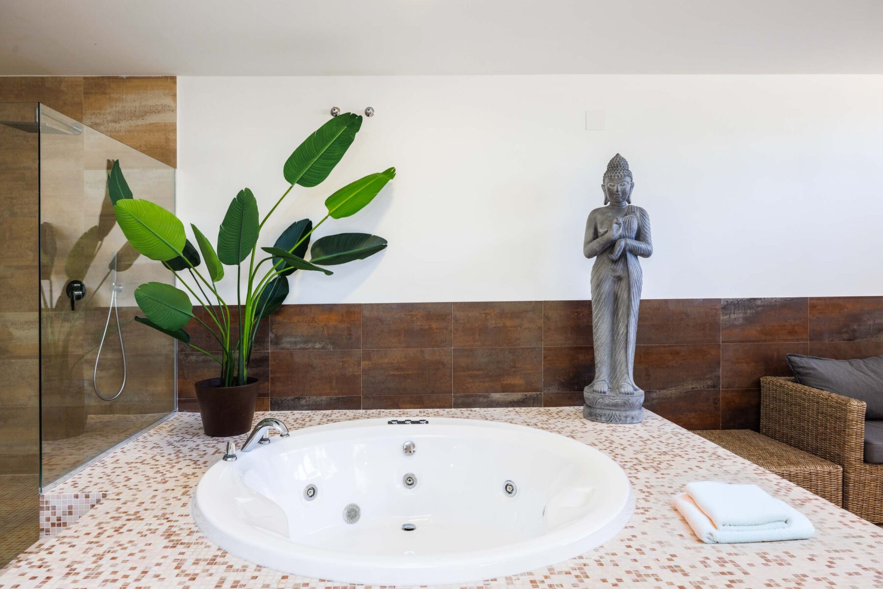Shifting indoors, Villa Anja is a spa-lover’s dream: Welcome to your own, private retreat, complete with a small heated pool, hot tub, his-and-hers shower and Swedish sauna. And, should you like to work up a sweat the hard way, there are also some exercise machines.