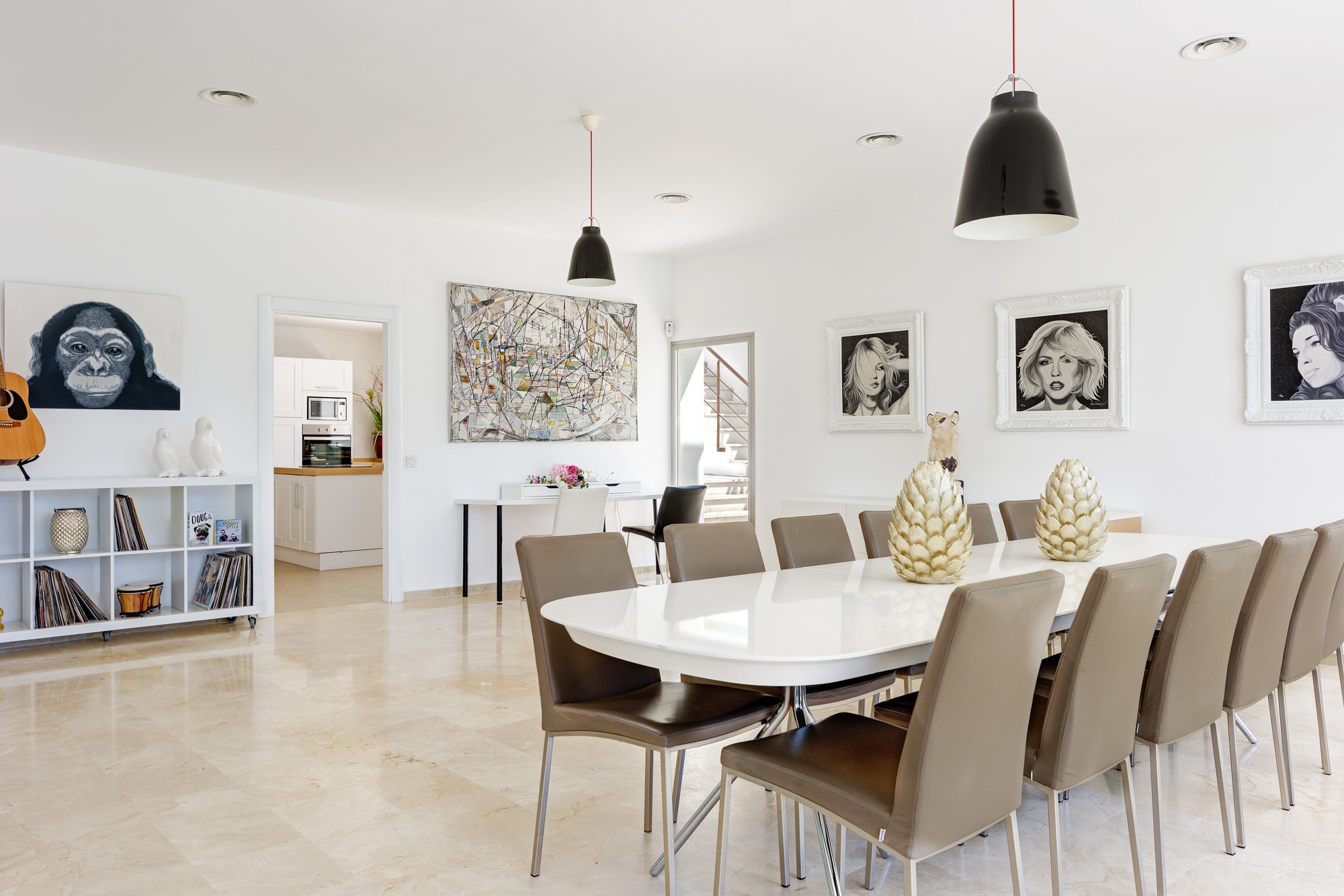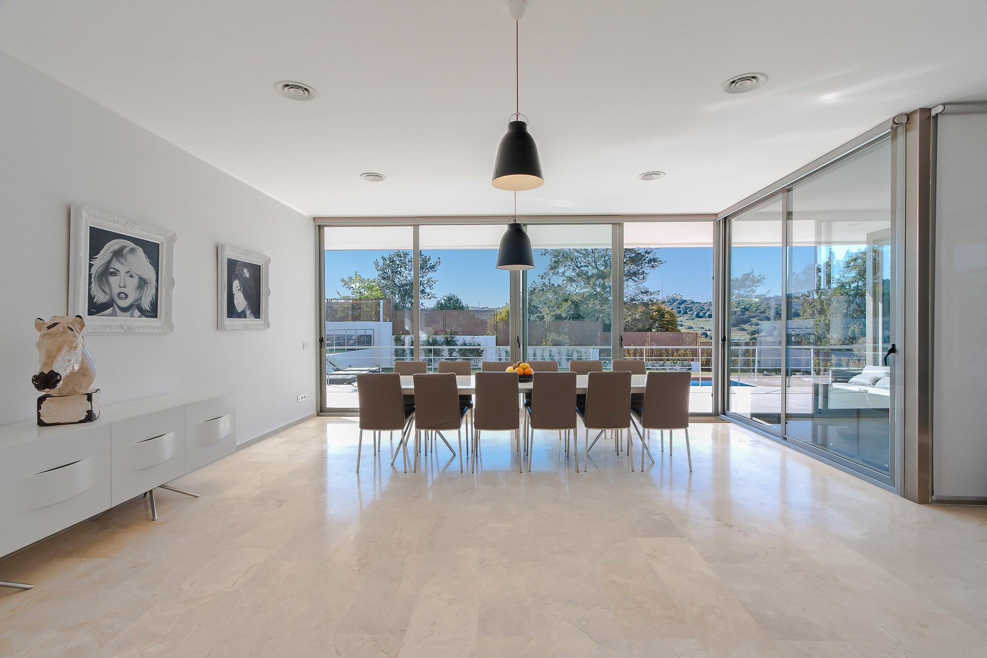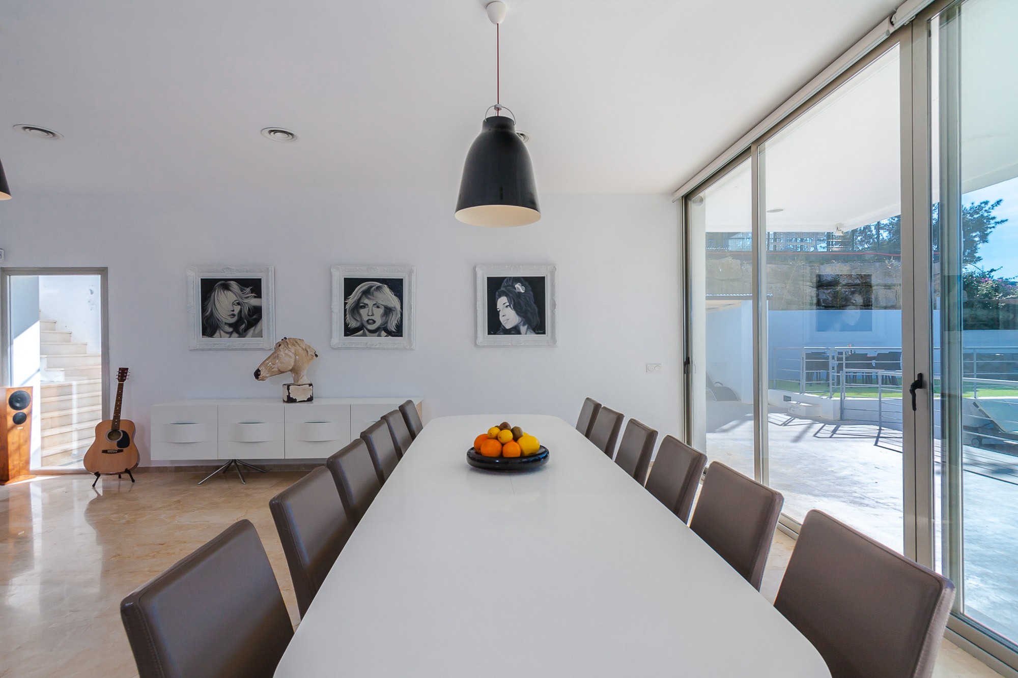 The centrepiece of Villa Artea’s feasting is the poolside dining: Glass walls open onto the pool and garden; white monochrome and pop art adorn the walls; and an industrial light fitting illuminates the modern dining table for 12.
