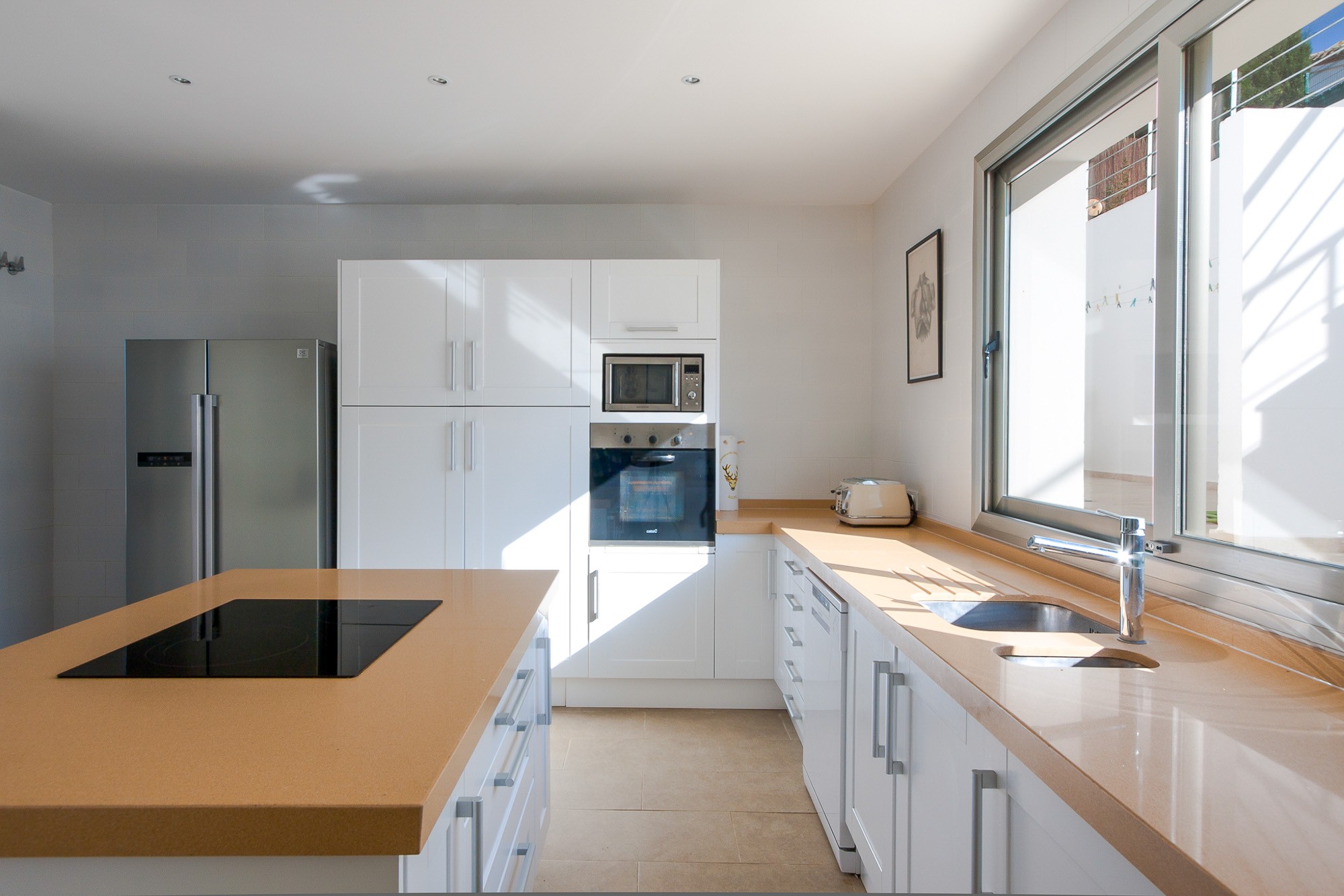 The light and bright, modern kitchen is a treat for both chefs and contemporary design aficionados: Sleek, white cabinetry extends throughout, accented by wood countertops, a spacious central island, and high quality appliances.