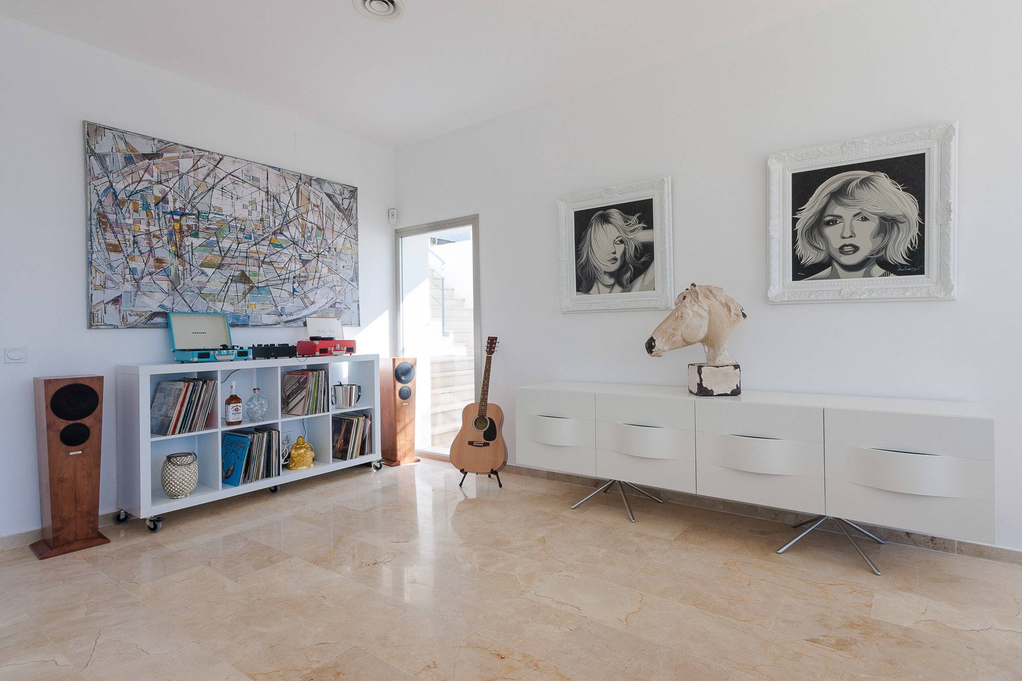 The main living room is located poolside, where light streams through floor-to-ceiling glass, bouncing from blonde travertine flooring to pop art, from contemporary furnishings to high-design accents. Both crisp and clean, at once comfortable and inviting, Villa Artea is a place for luxury living and plenty of laughter.