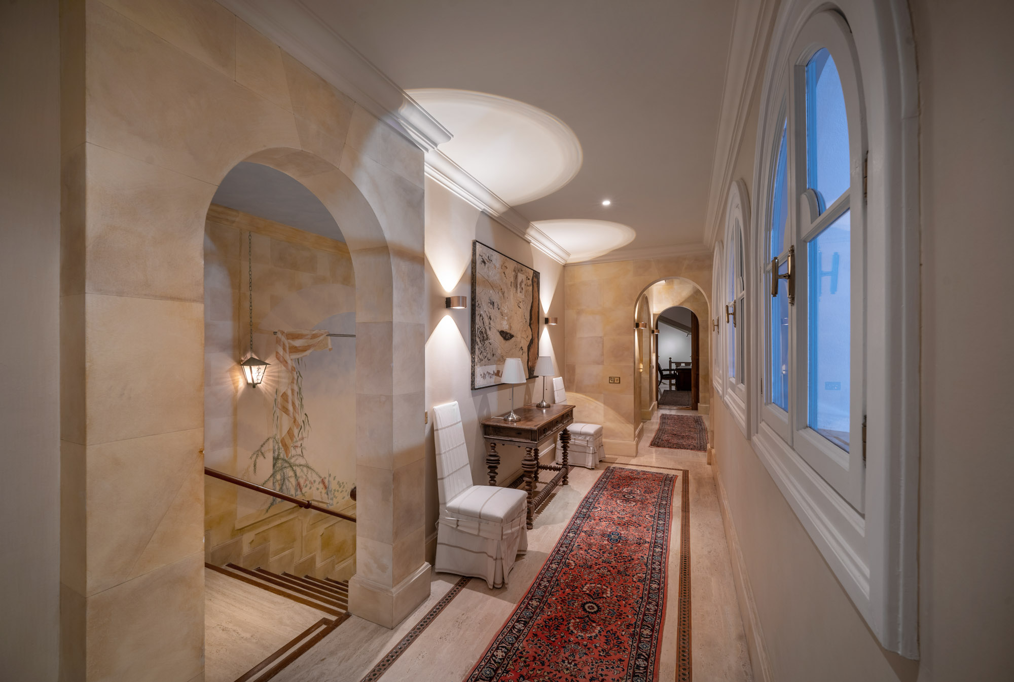 Walk through the doors of Villa Atenea and you are greeted by an opulent hallway with a domed ceiling, wall frescos and sculptures. The spacious interiors are brimming with art. The collection includes works from Armani and Versace, as well as luxurious designer furnishing throughout.