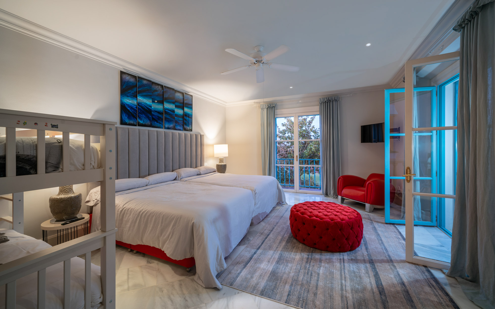 Bedroom 4: First floor bedroom set up as a family room with two small double 140 x 200cm beds and a bunk beds 90 x 190cm, and a wall of integrated wardrobes with a central dressing table/work space. Access to shared terrace.