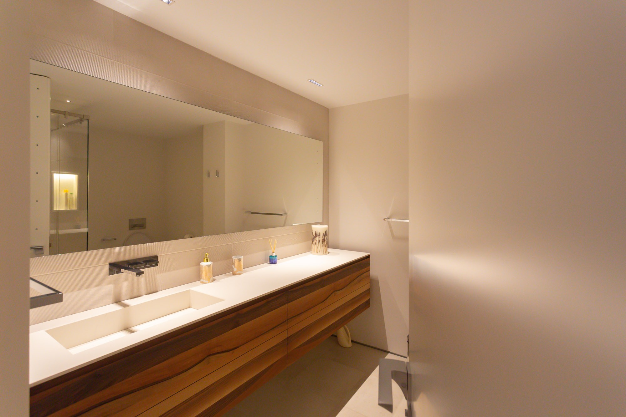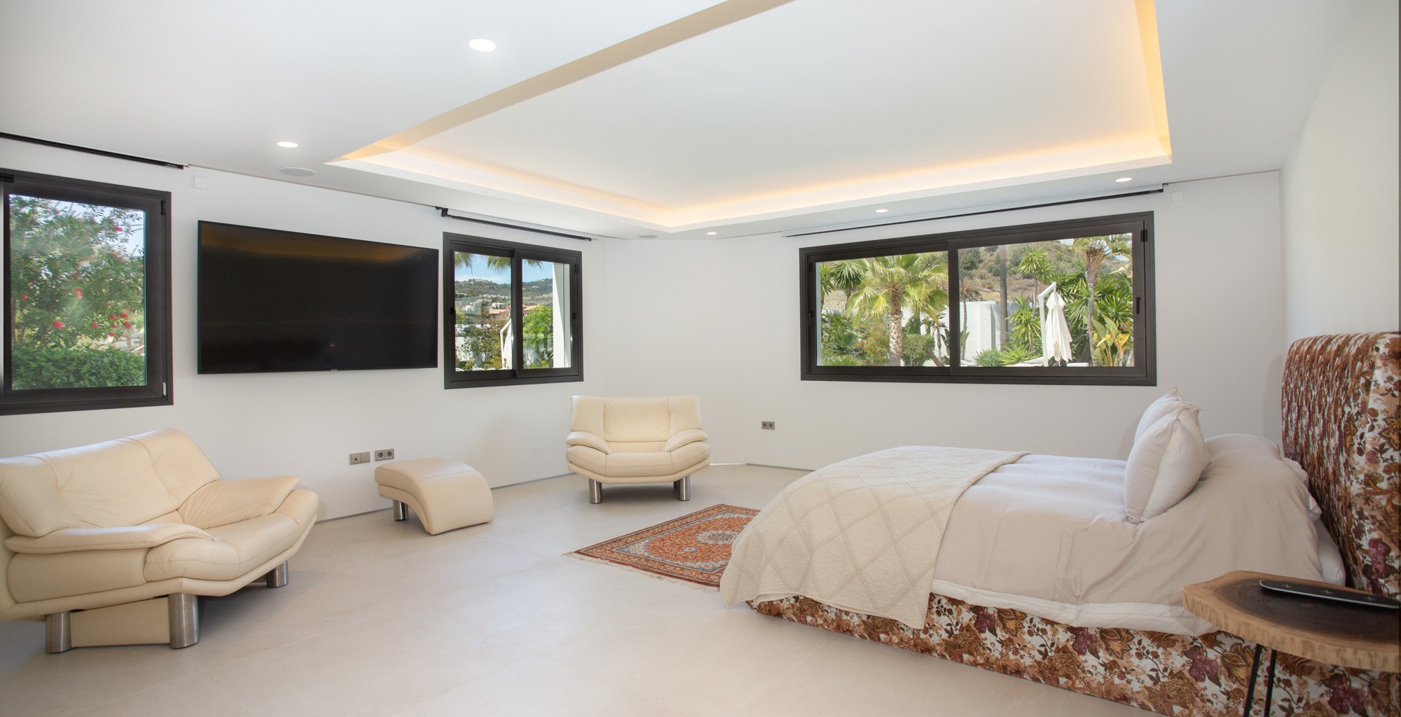 Bedroom 1: The master suite holds prime position on the top corner of the house with panoramic wrap-around views from the mountains to the sea. A King-size bed sits in the centre of the room to take in the views, with a comfortable TV lounge area and a bespoke walk-in closet. In the integrated bathroom, a fabulous stand-alone bath tub with panoramic views stands alongside a separate shower cubicle, sleek black marble vanity and toilet enclosure.