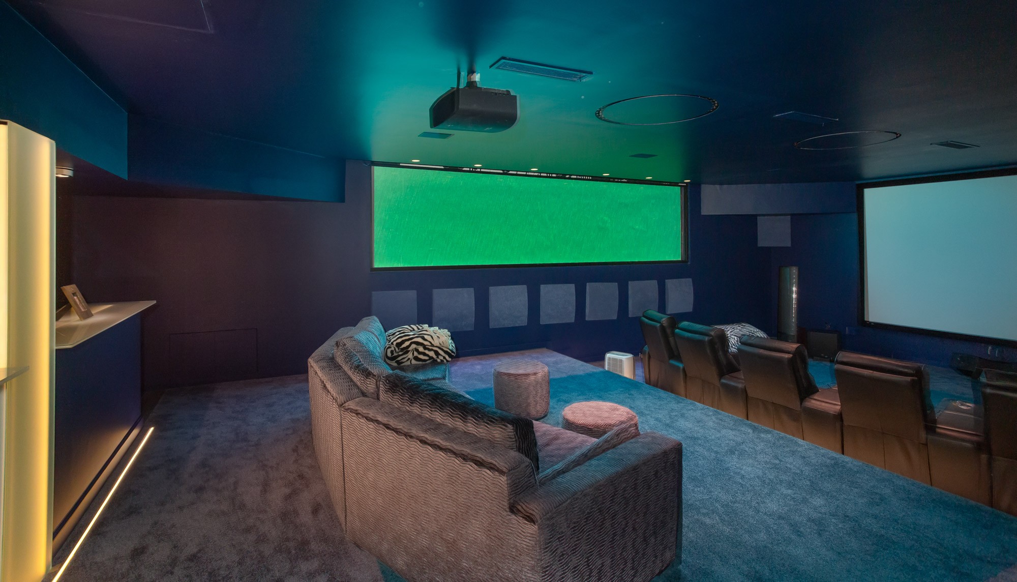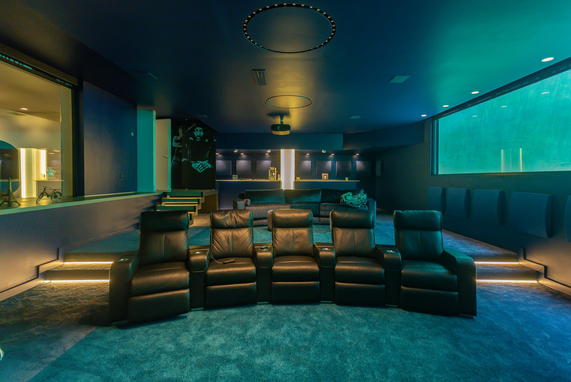 Home cinema room with popcorn machine and peek-through wall to the swimming pool
