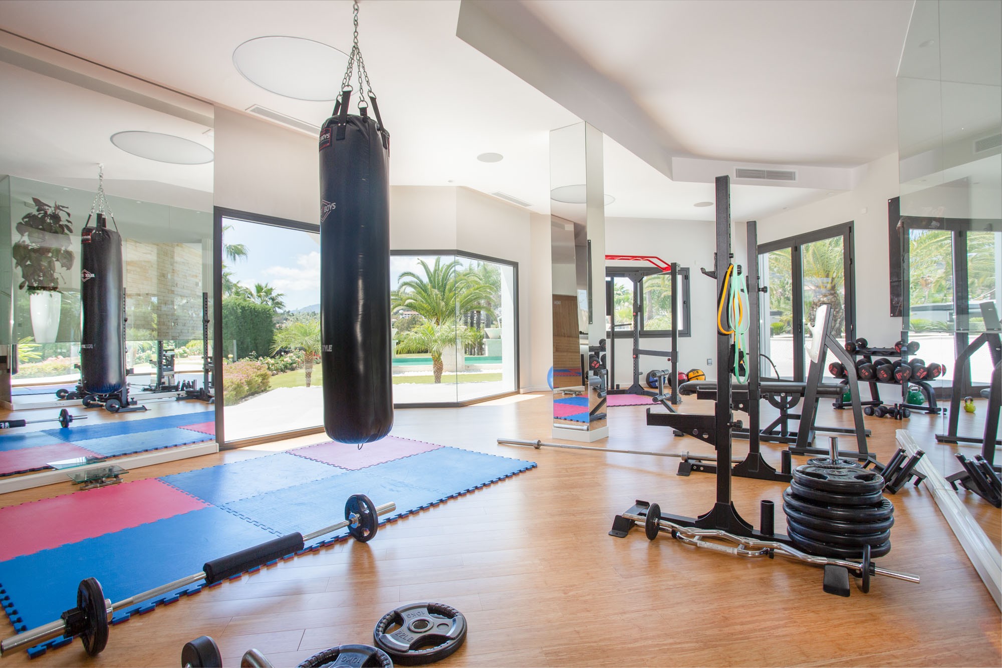 There’s a complete home gym at one end of the main floor of the house, containing all standard gym kit – multi-gym, free weights, an outdoor workout zone, treadmill, rowing machine, boxing, yoga mats, TV, steam room, Swedish sauna and its own shower room.
