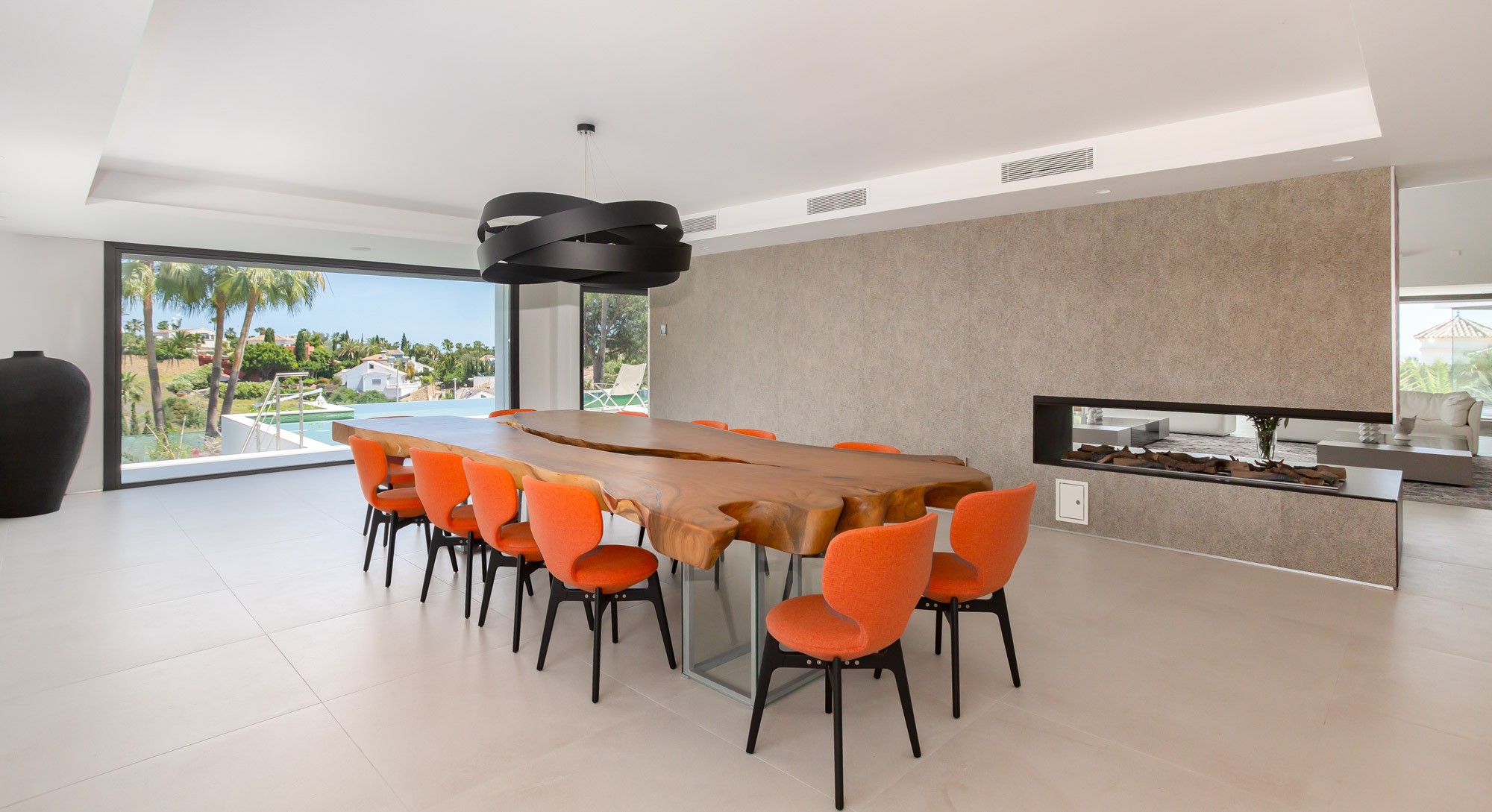 The main dining room is separated from the living room by an impressive modern fireplace and seats 12 people around a vast 1500kg living edge dining table made from a single trunk of tropical wood.