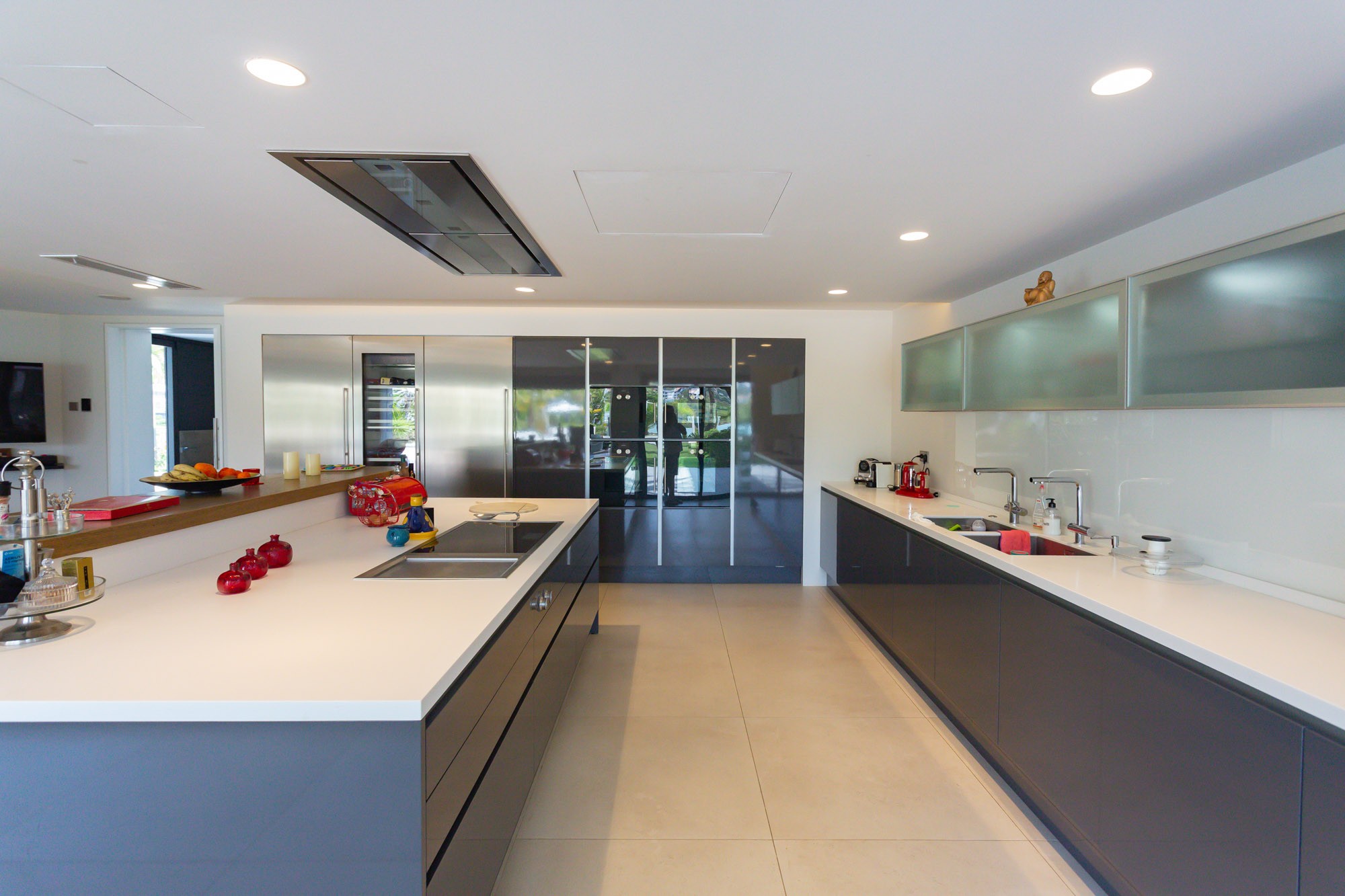 It looks for all the world like a Bond Villain’s lair on some far-flung tropical island. There are the same razor-sharp geometric forms in blinding white, and lots of gleaming, full-height glass windows; it’s also surrounded by lush lawns and palms swaying in the breeze. There’s even a subterranean lounge area with a full-length glass wall opening out onto the swimming pool – you wouldn’t be entirely surprised to see a shark floating around in the bottle-green waters.