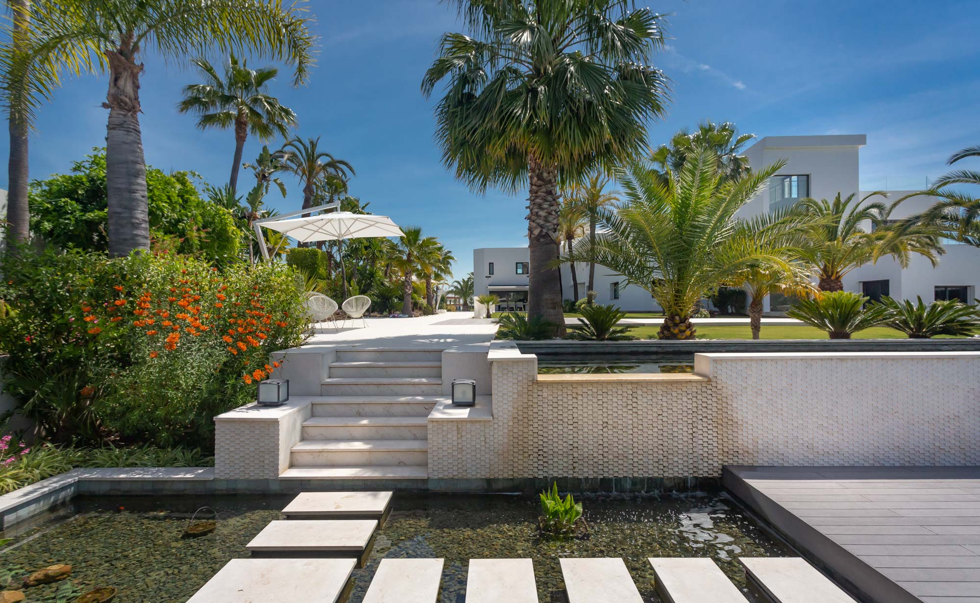 The surrounding outdoor space stretches across a staggering 8000m2 of immaculate landscaping, carefully curated flowering gardens full of tropical plants, cottage-style borders and statement trees and shrubs, a Japanese-style pebbled pond with floating steps and a BBQ area. There’s also a tennis court with a large viewing deck and seating alongside, in case you need someone to critique your service game.