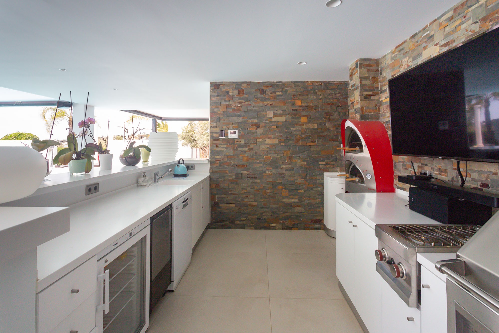Next to the main pool there’s an outdoor kitchen which is fully equipped with BBQ, hob, pizza oven and a wine cooler and an adjacent covered dining area seating 8 (with room, potentially, for more with a bit of imaginative re-arranging of the seating).