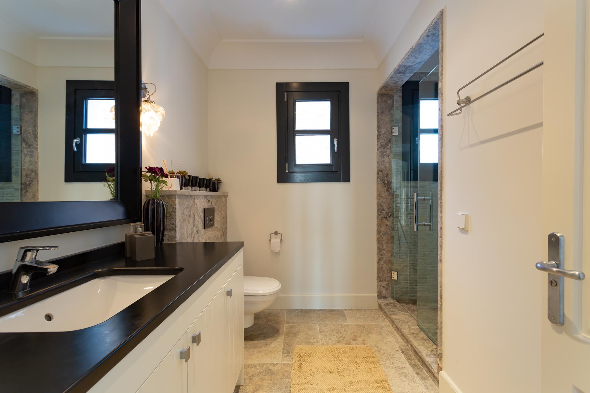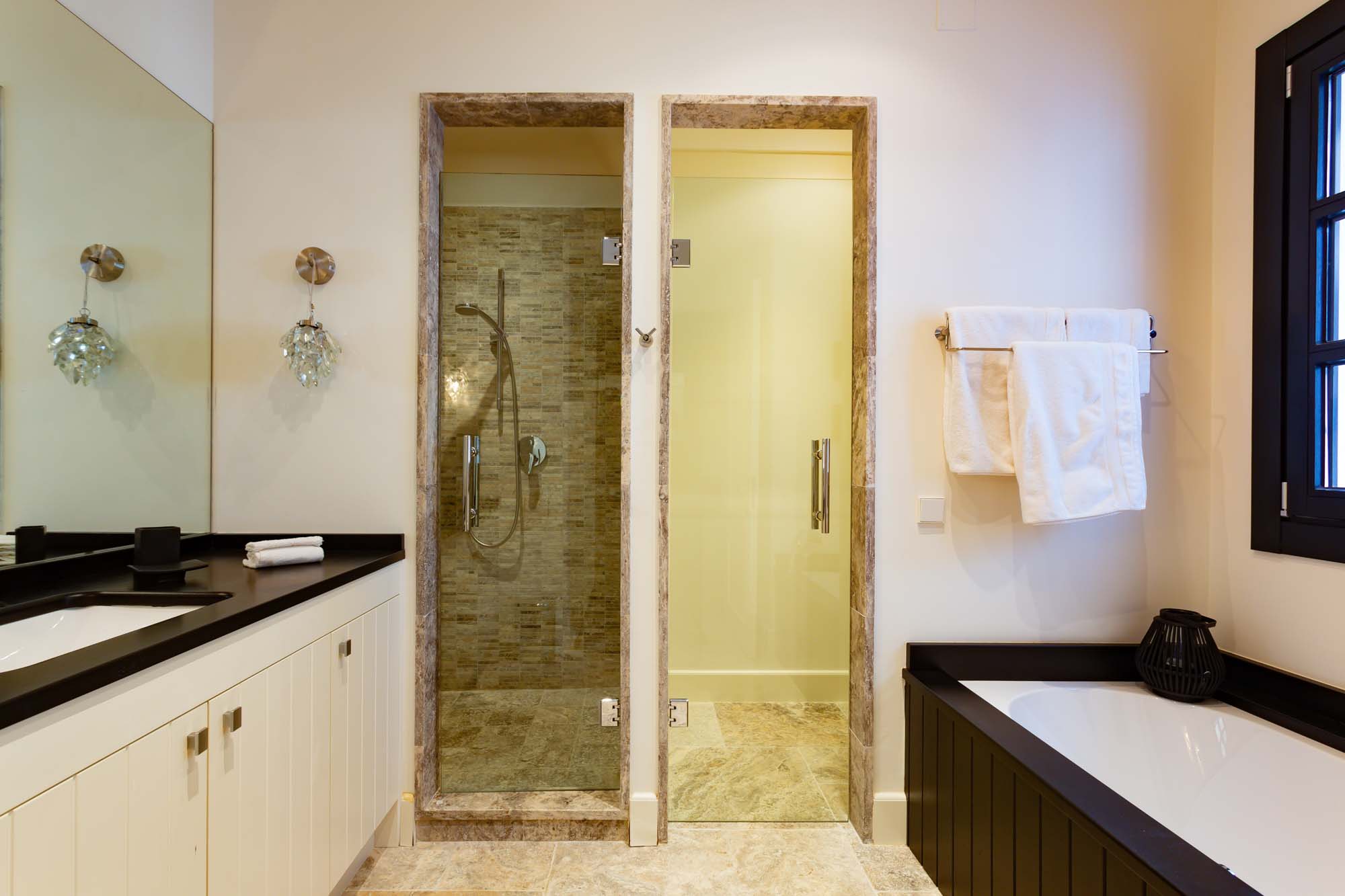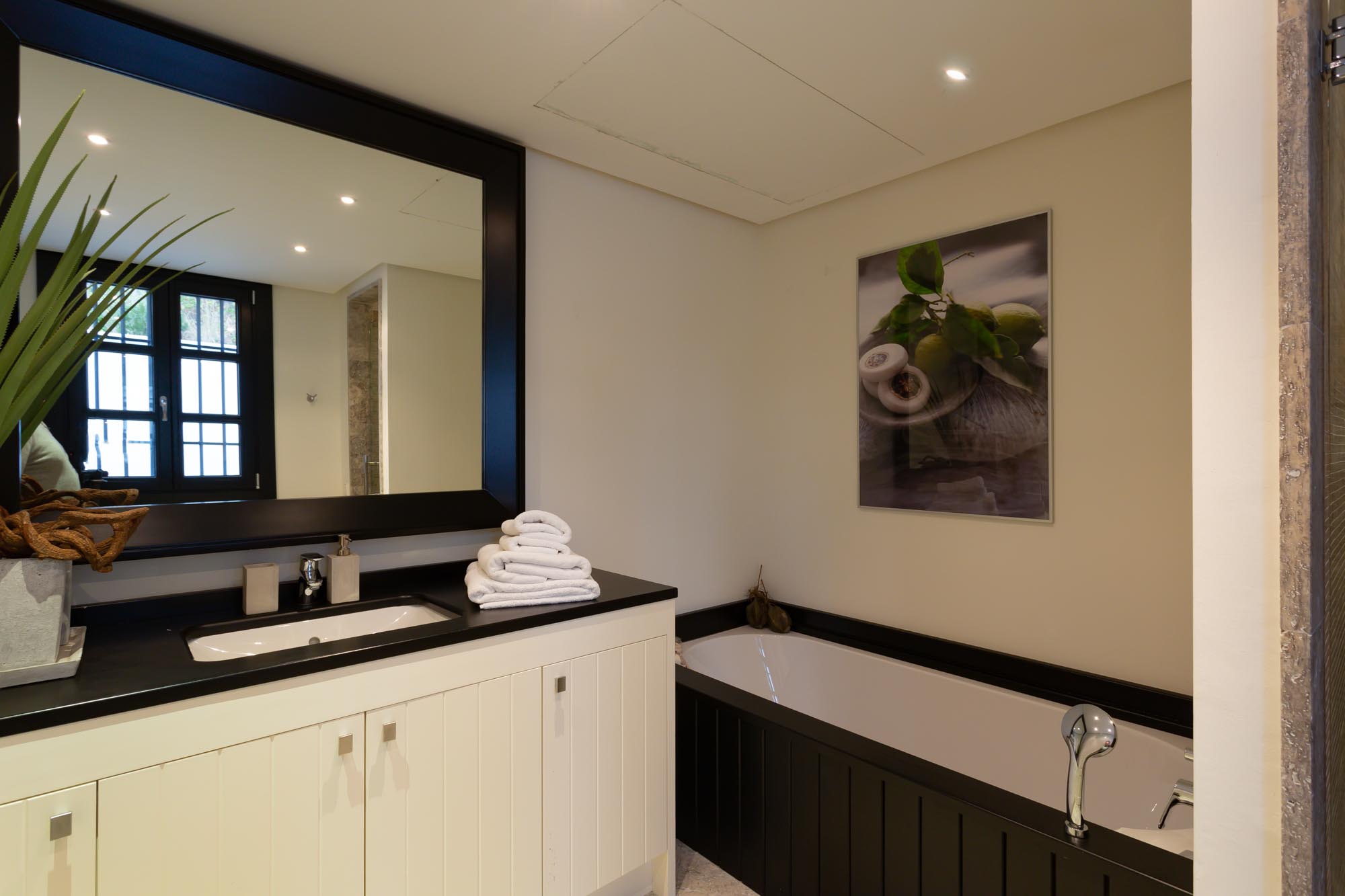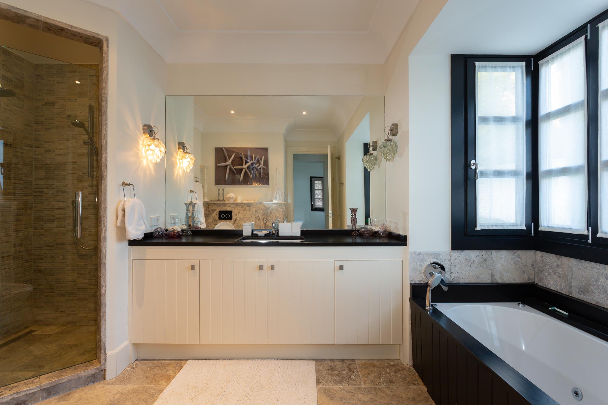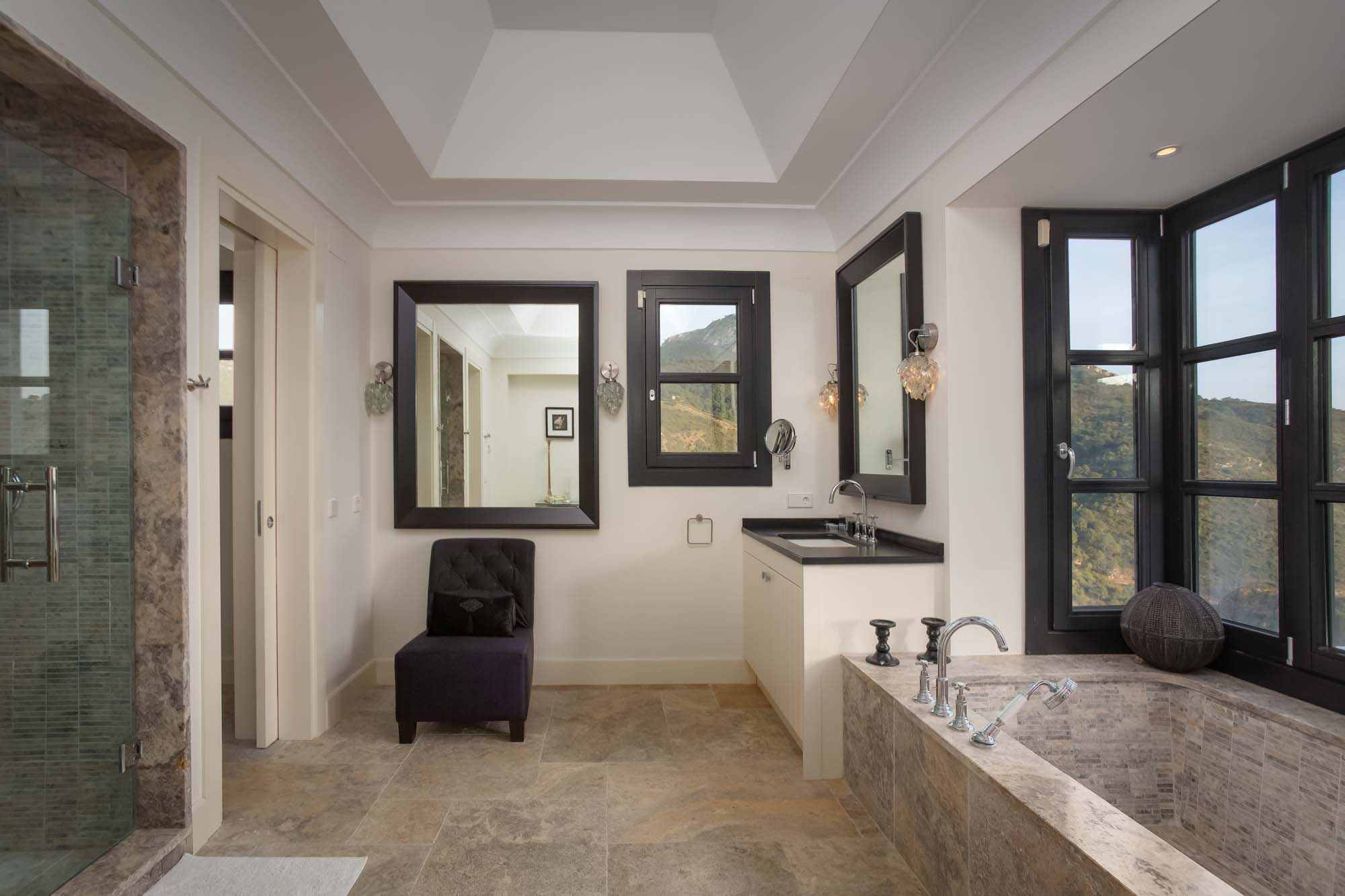 Bedroom 1: Top-floor, large principal suite with panoramic views from mountains to sea, viewable from the bed and private terrace. Striking black-and-white décor, black chandelier, TV and 180cm super-king bed. Doors to private terrace with seating and table. Walk-in dressing room and spacious en-suite bathroom with panoramic views, dual vanity units, a large sunken bath in travertine marble, large shower enclosure, and separate toilet.