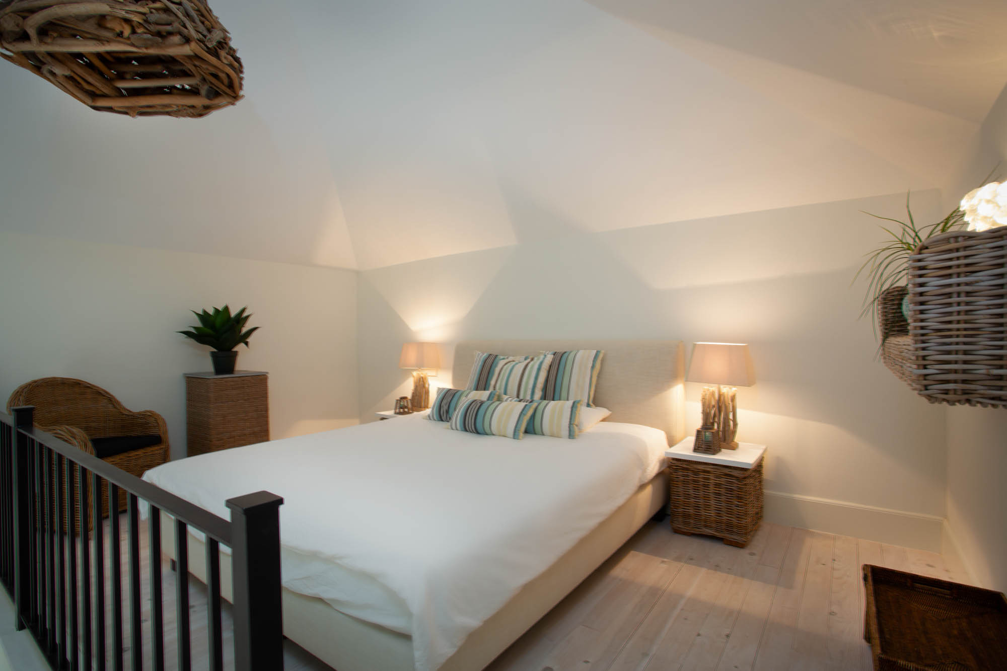 Bedroom 5: Located in the guest house, separate but just a few steps from the main house. Ground-floor living area and marble bathroom, with small bath tub and separate shower. Steps lead to a mezzanine bedroom with king-sized bed and modern, beachy colours in gentle blue and driftwood. Living room fitted with two oversized armchairs, a TV, and whitewashed floors. Not suitable for children.