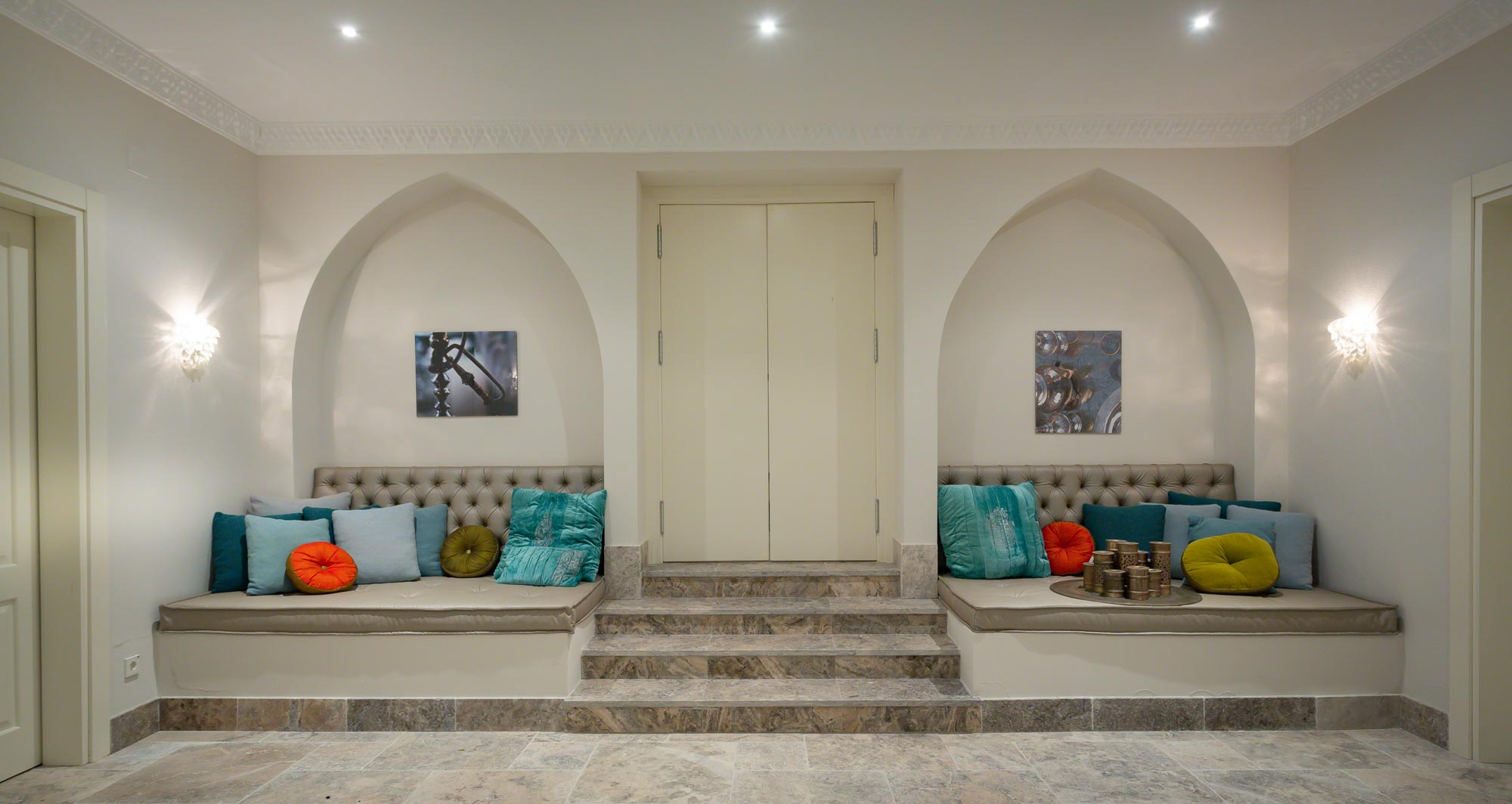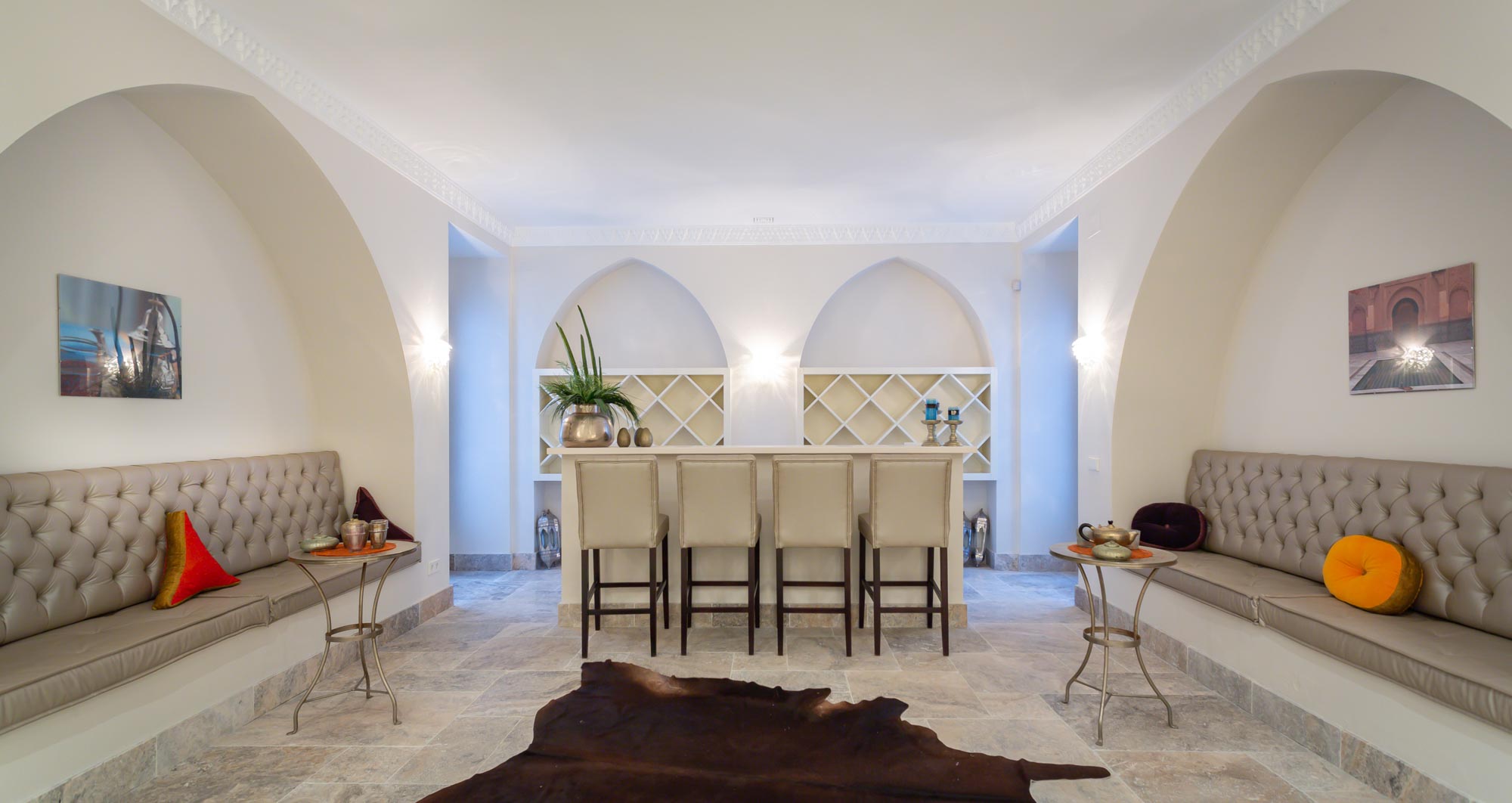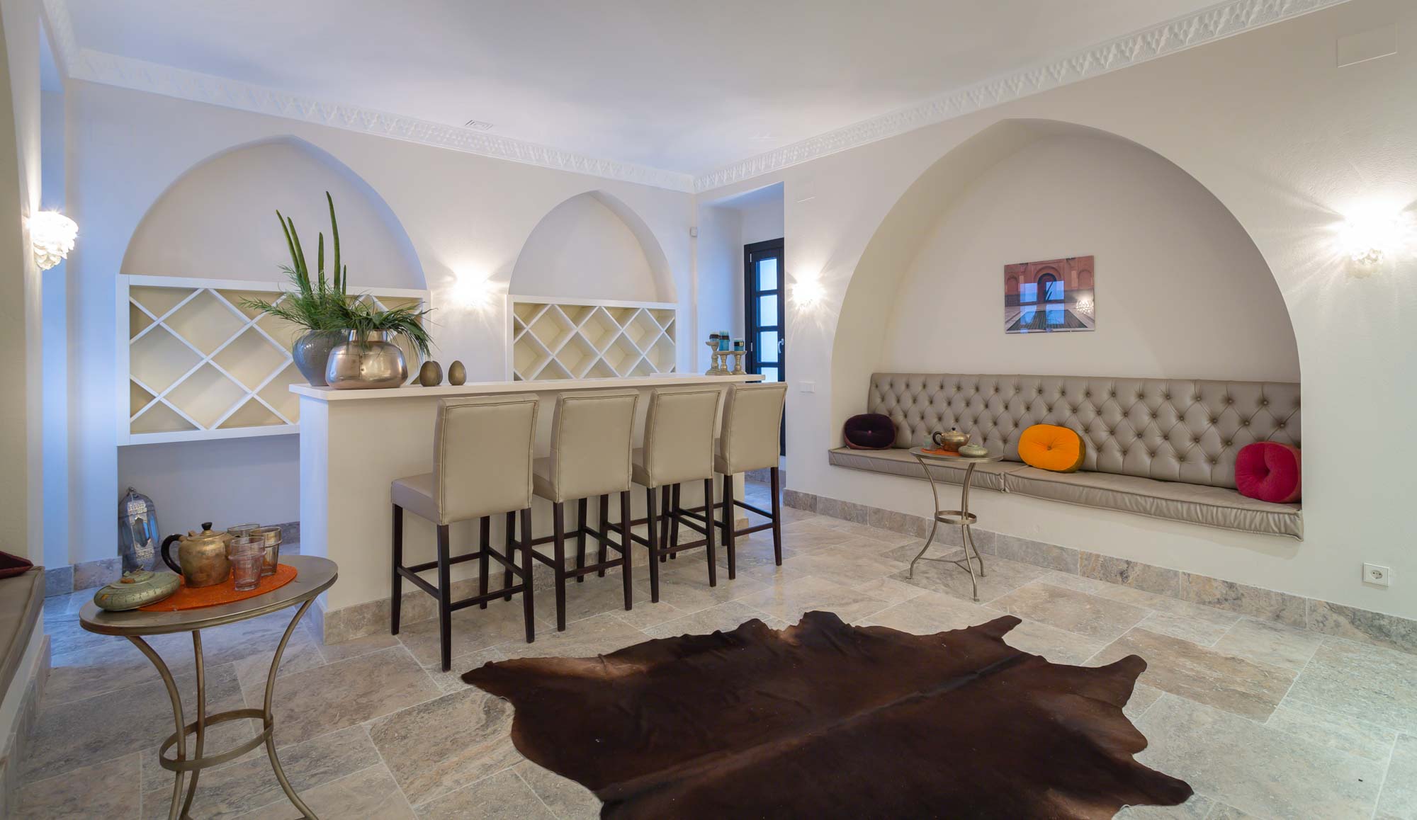 Inside, the lower ground floor of the villa offers a complete leisure zone; host a gathering in the smartly styled indoor bar-lounge with Moroccan-style seating and décor that echoes a modern Marrakesh style lounge. The indoor cocktail bar (includes sink and refrigerator) is well suited to any celebration or special occasion, even in off-season weather and for events up to 50 guests.