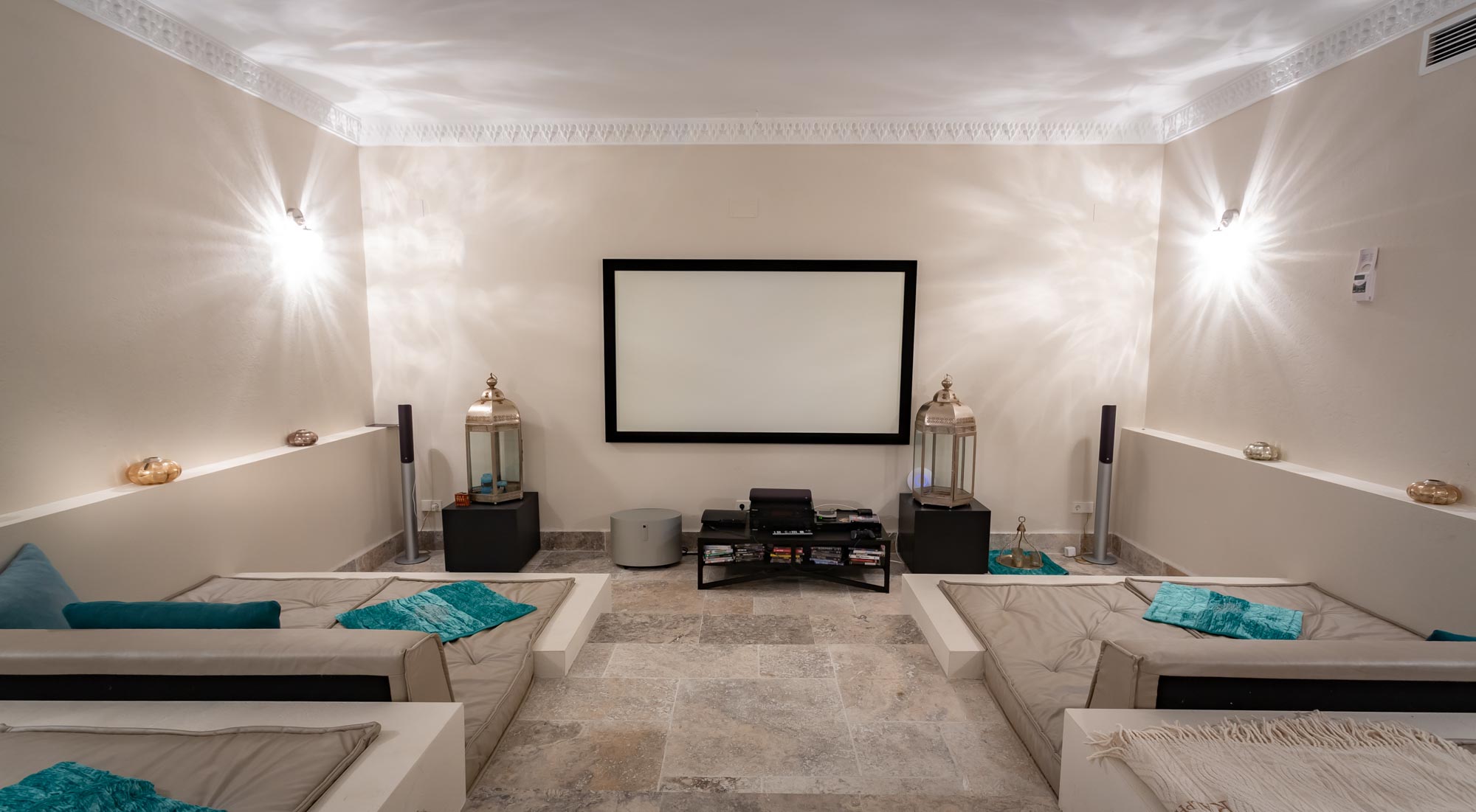 Through the cocktail lounge there is a multi-media entertainment room with cinema screen. The home cinema is connected to Apple TV and a Pioneer system, as well as a Keff surround-sound system with iPad control.