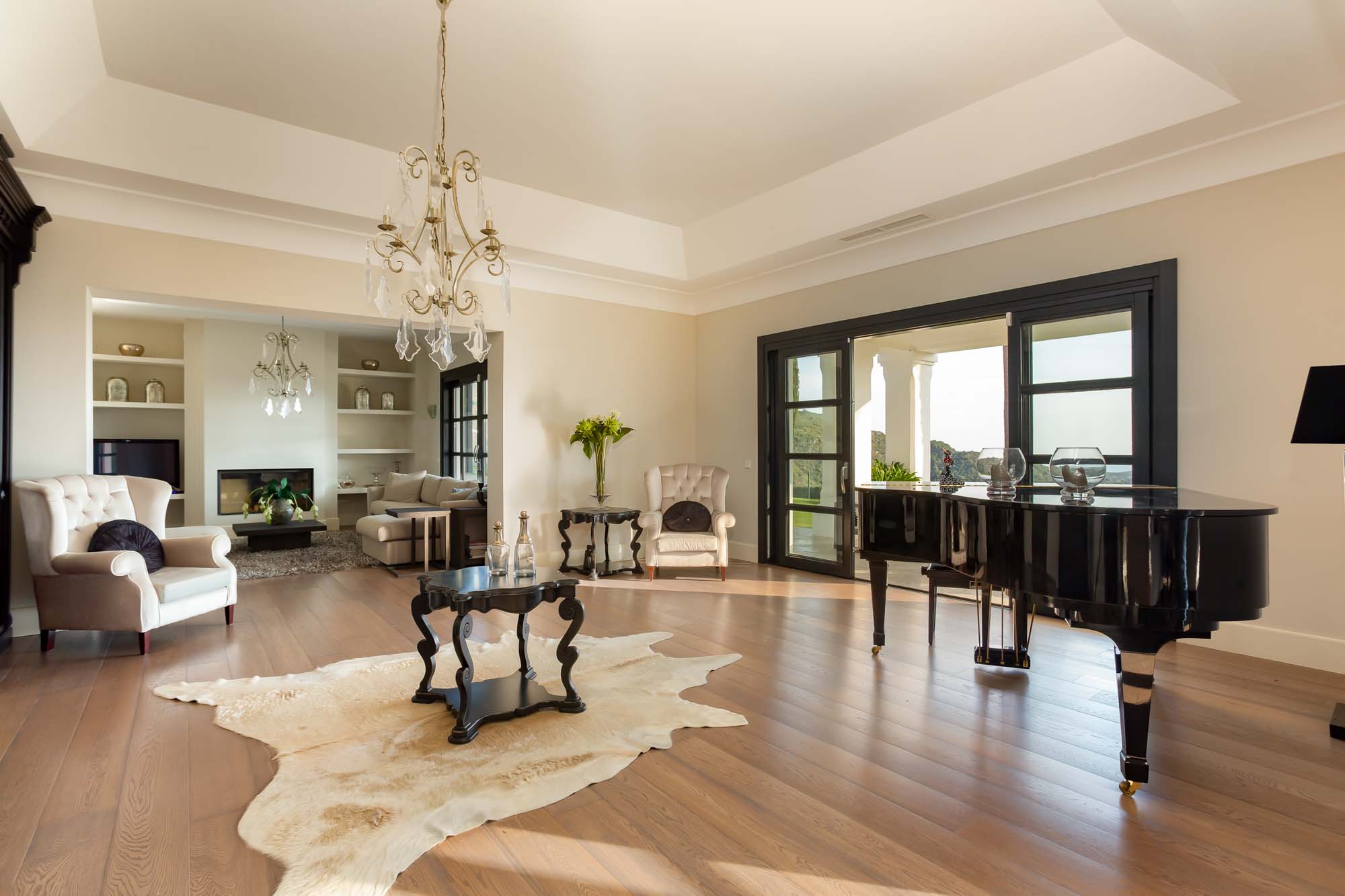 It’s a welcoming, open-plan space connecting to the piano room and dining room. 8-10 guests can gather on the sofas and French-style arm chairs around the open fire and TV. French windows look to the garden, pool, and expansive views of mountain and sea.
