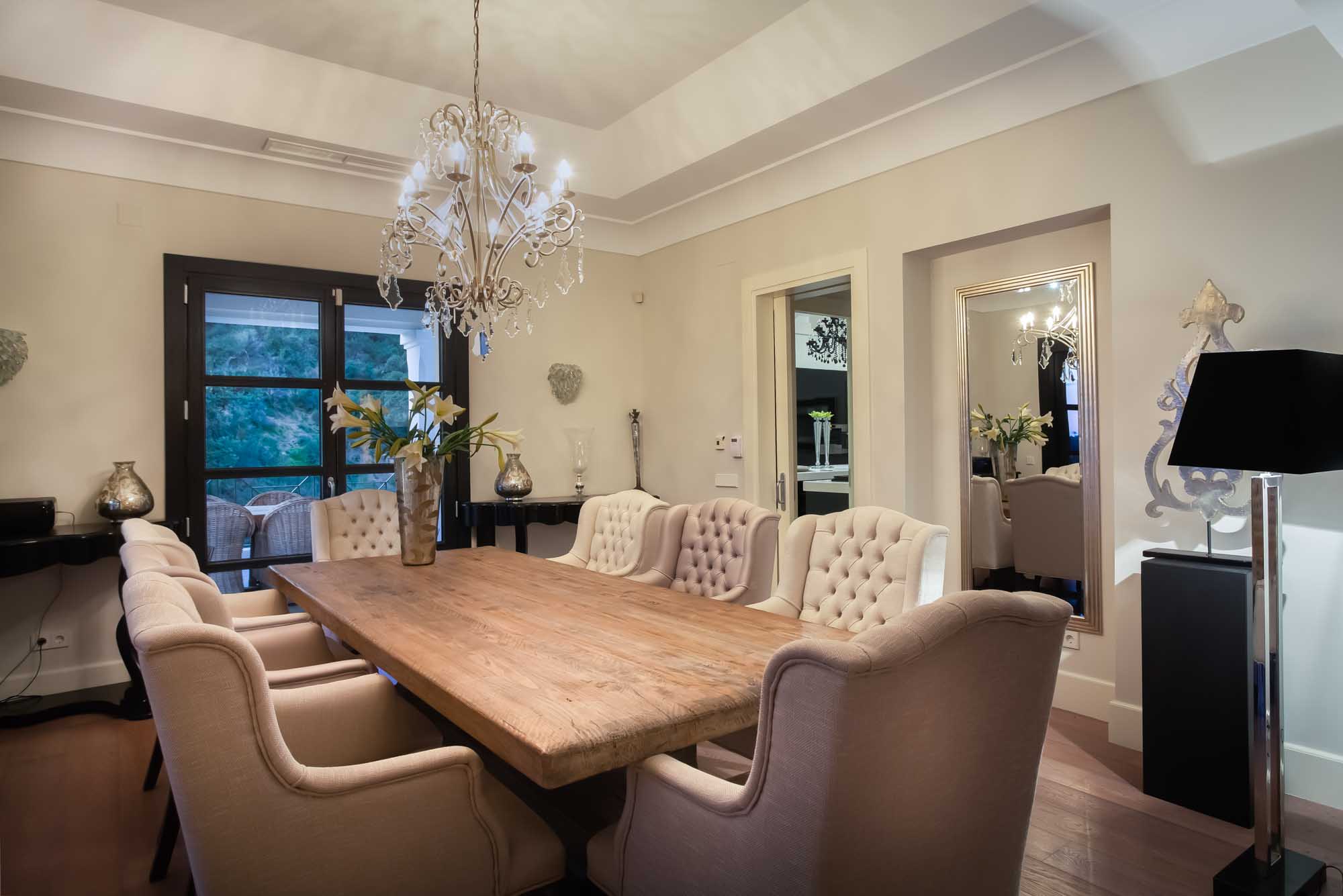 The elegant Parisian-style formal dining room is located on the main floor of the house, open-plan adjacent to the kitchen and main living area. The large oak table seating eight is crowned by a showpiece chandelier, while French doors open onto the outdoor terraces with further dining space and wrap-around views from mountains to sea.