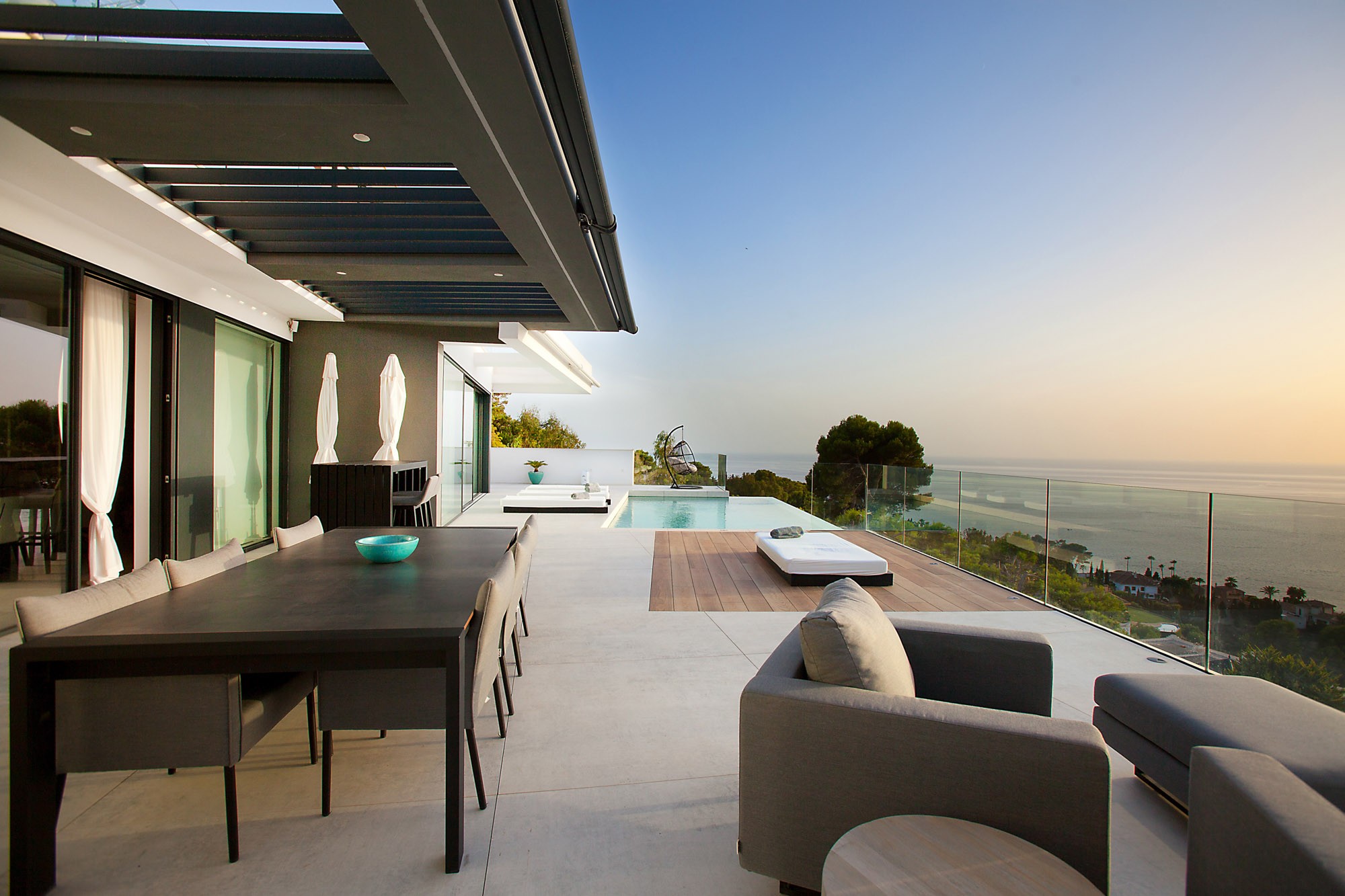 Automated, retractable shades cover much of the terrace ensuring there is always an escape from the direct sun if needed.