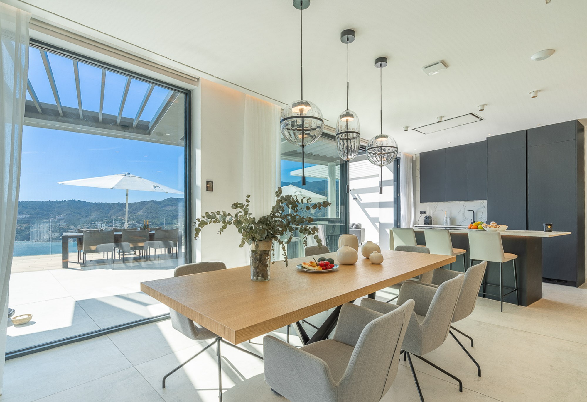 Slide the doors open and the refined interior spaces blend seamlessly with the equally stylish terraces, where the heated infinity pool appears at one with the Mediterranean Sea.