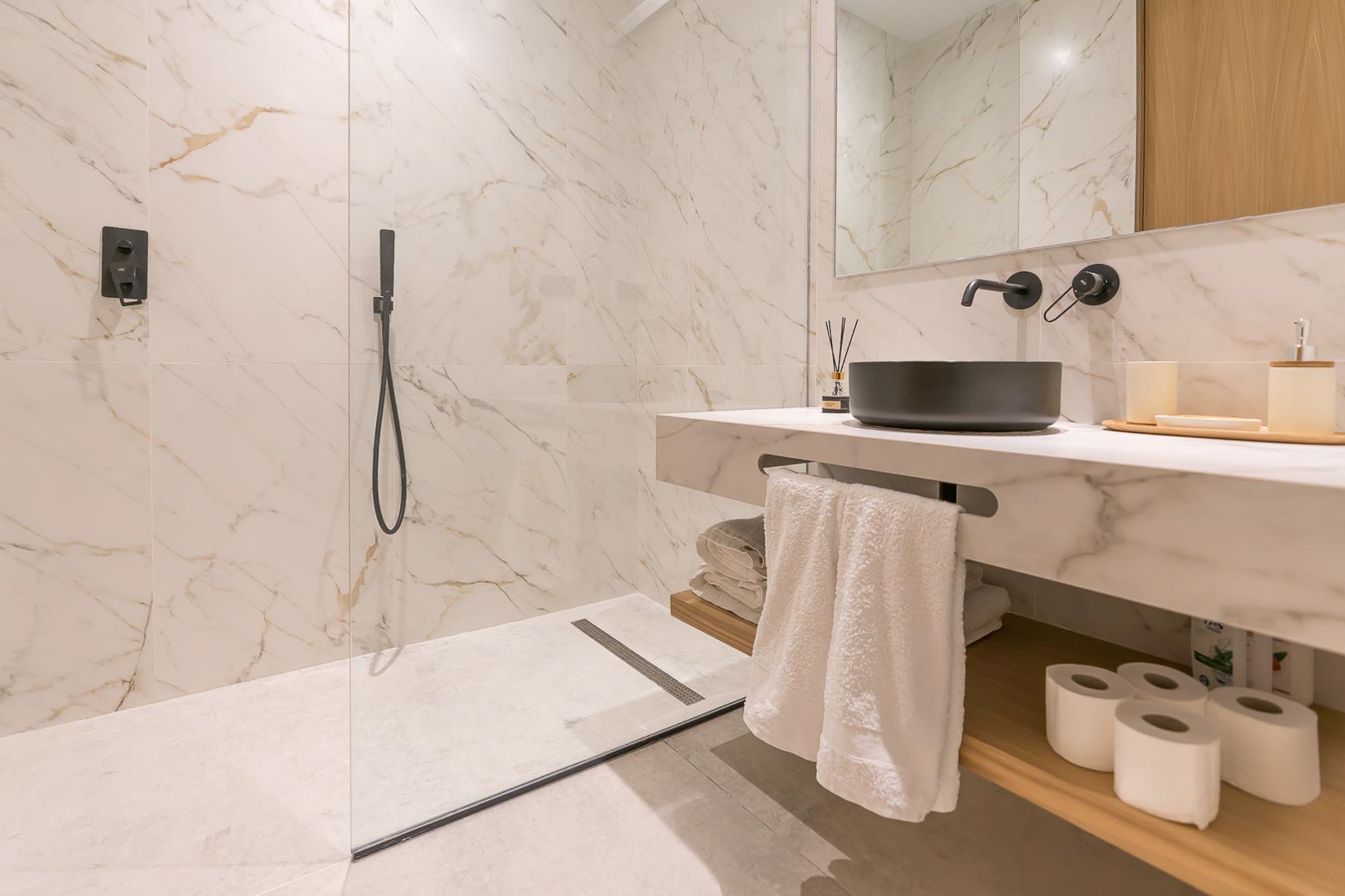 In the kitchen, high quality appliances are concealed by full-height matt black and natural wood cabinetry and there’s an island/breakfast bar with seating for three.