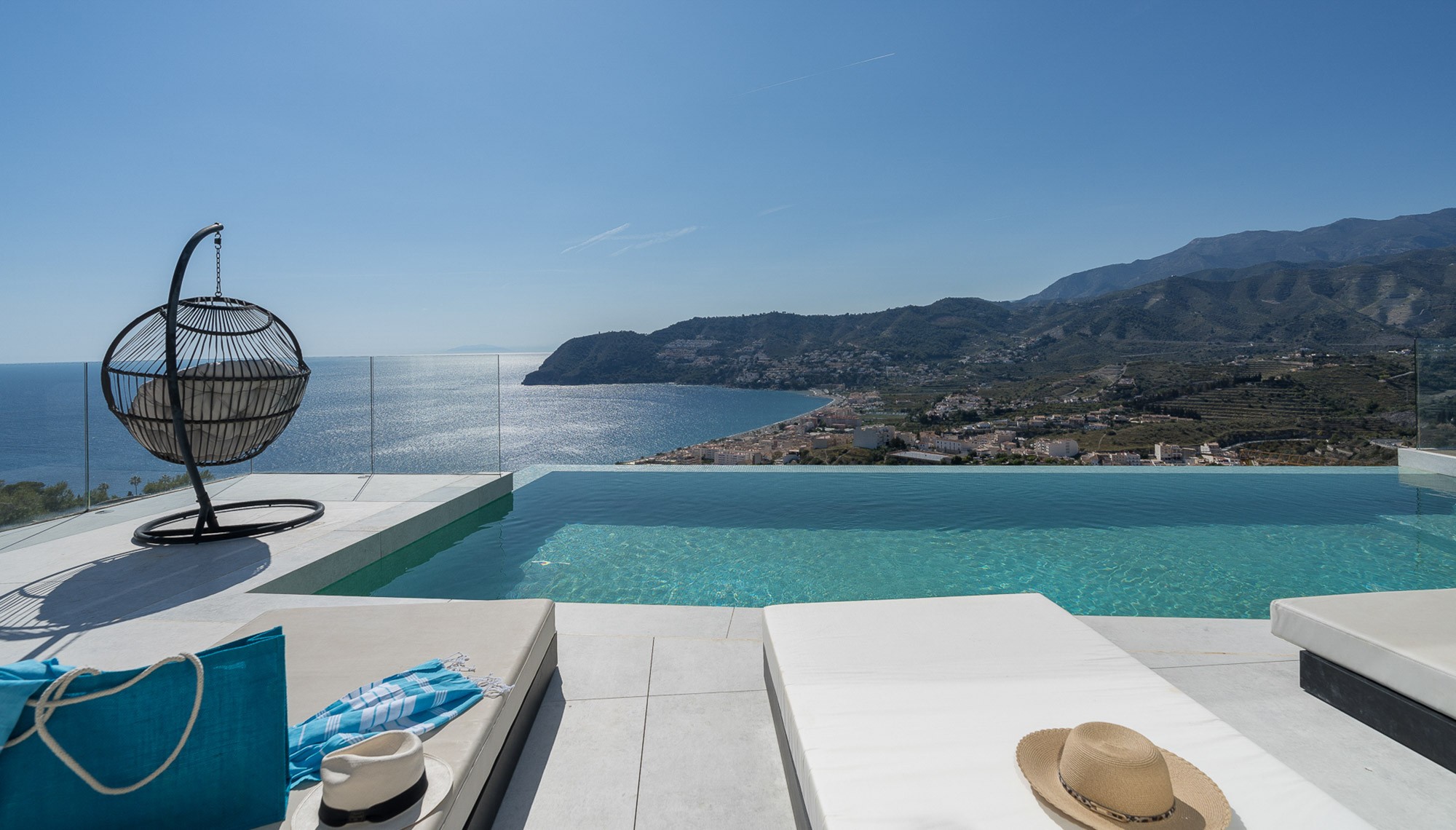 Villa Cielo is a 5-bedroom luxury villa in the picturesque bay of La Herradura, Granada. Floor-to-ceiling glass doors open from all main rooms to a sea-facing sundeck and show-stopping, heated infinity pool. The sunny terraces are quite the sight especially at sunset when the view over the sea and bay turns every hue of magenta.