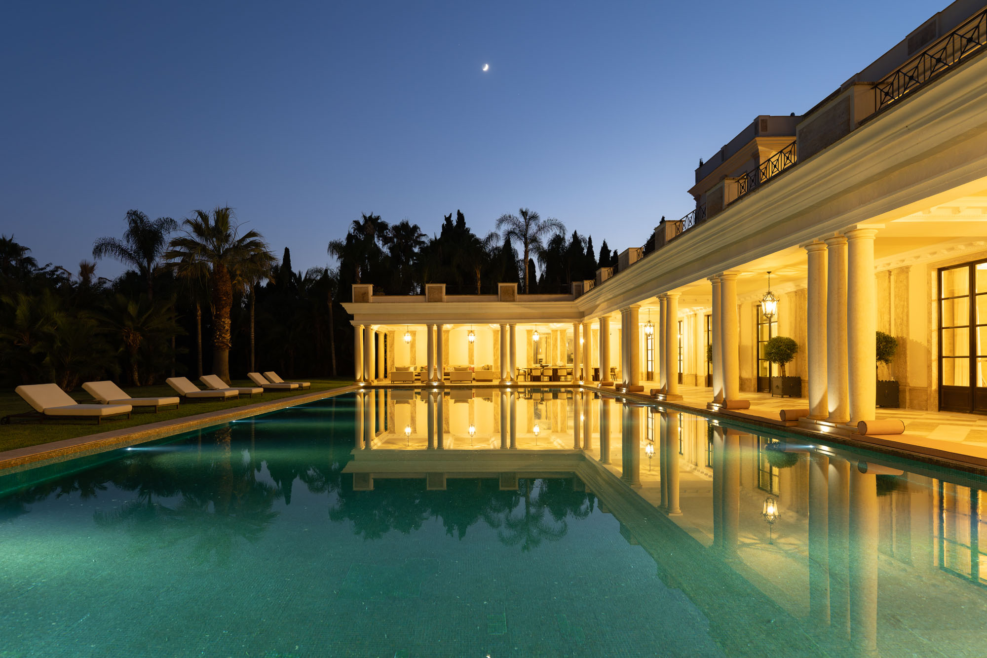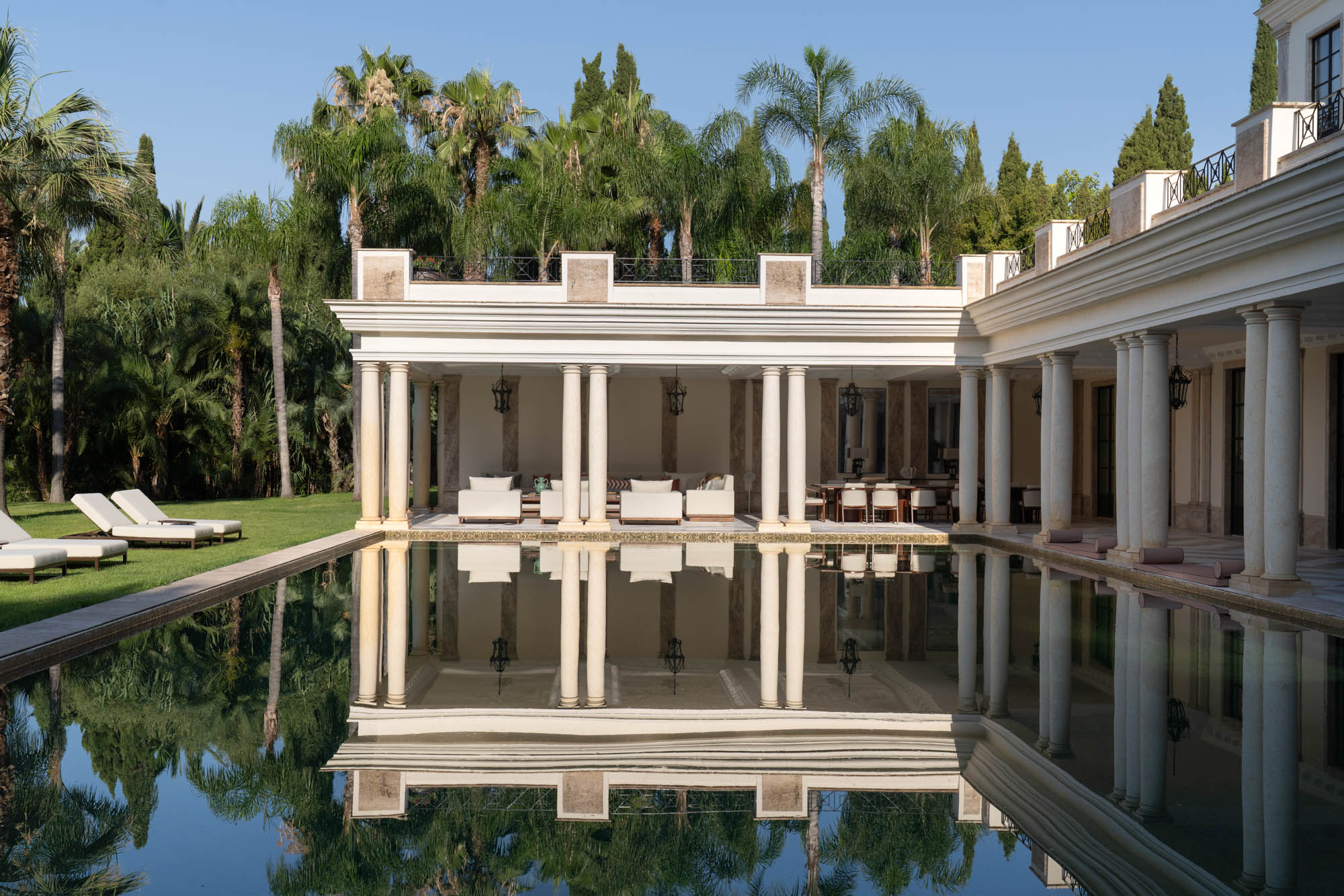 Taking pride of place at garden level is a 22m x 10m private pool, inlaid with glittering jade green and gold tiling and framed on all sides by elegantly zoned seating areas. Low-slung sofas and sculptural recliners are arranged for relaxed socialising, shaded afternoon reading, or poolside aperitifs as the sun begins to set.