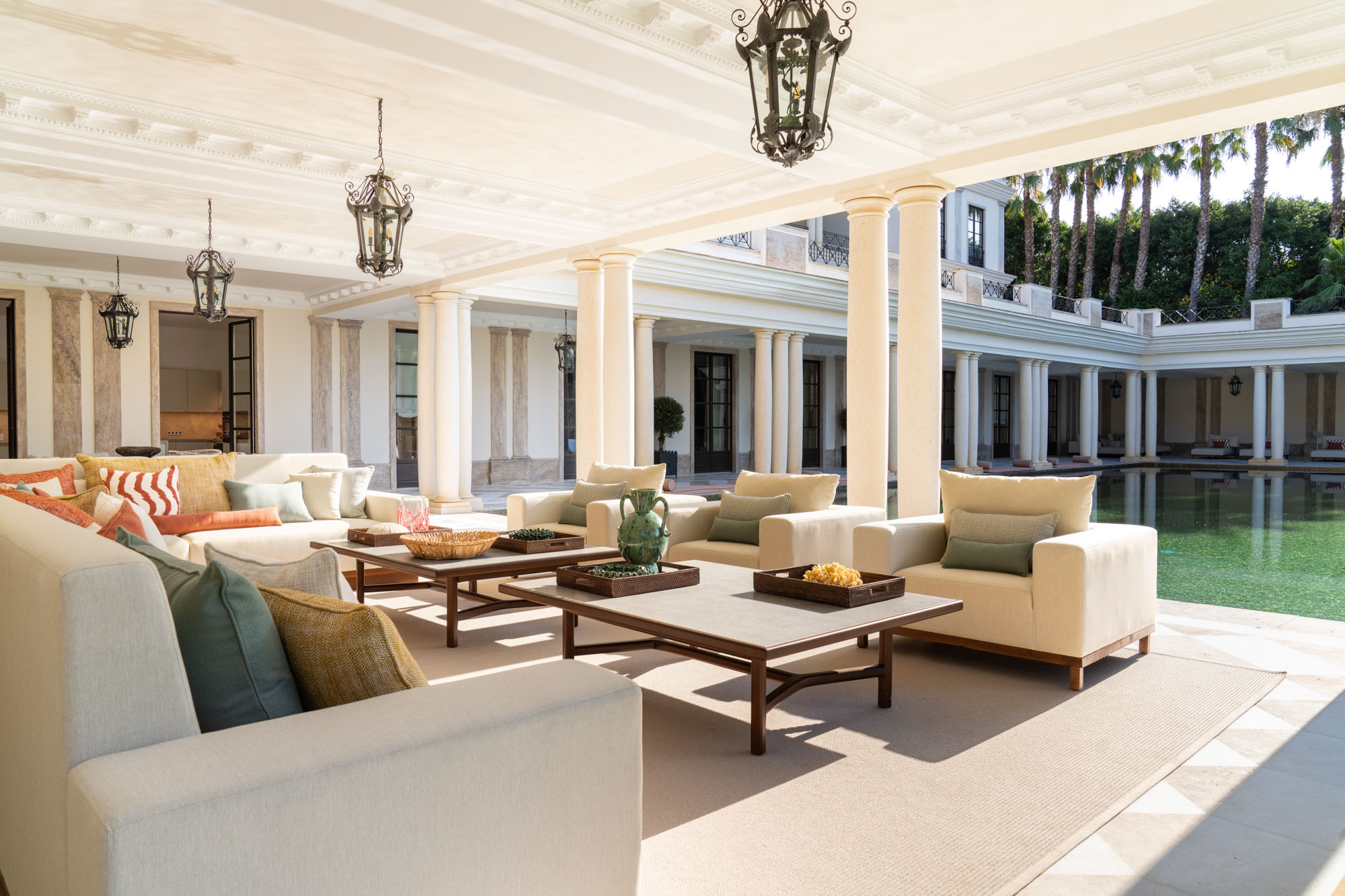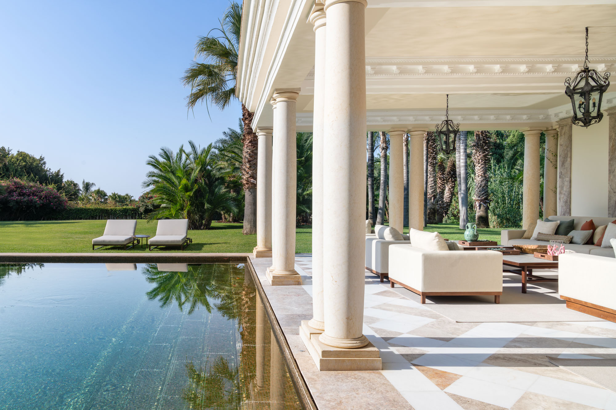 Outdoors, the large private pool is framed by palm-lined gardens and zoned seating areas, ideal for quiet reading or slow afternoons in the shade
