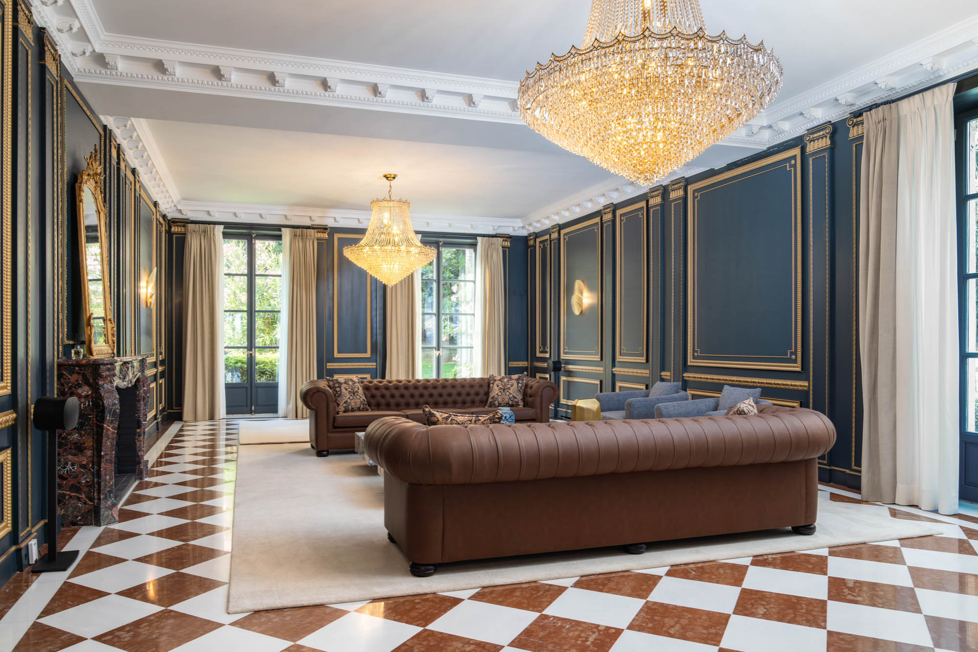 Sofas are deep and inviting, layered with throw cushions and paired with marble-topped coffee tables spread with curated art and fashion tomes. Just along the corridor, the gentleman’s lounge offers a more intimate setting. With dark leather seating, gold accents, and diamond-drop chandeliers, it’s a seductive space for evening entertaining.