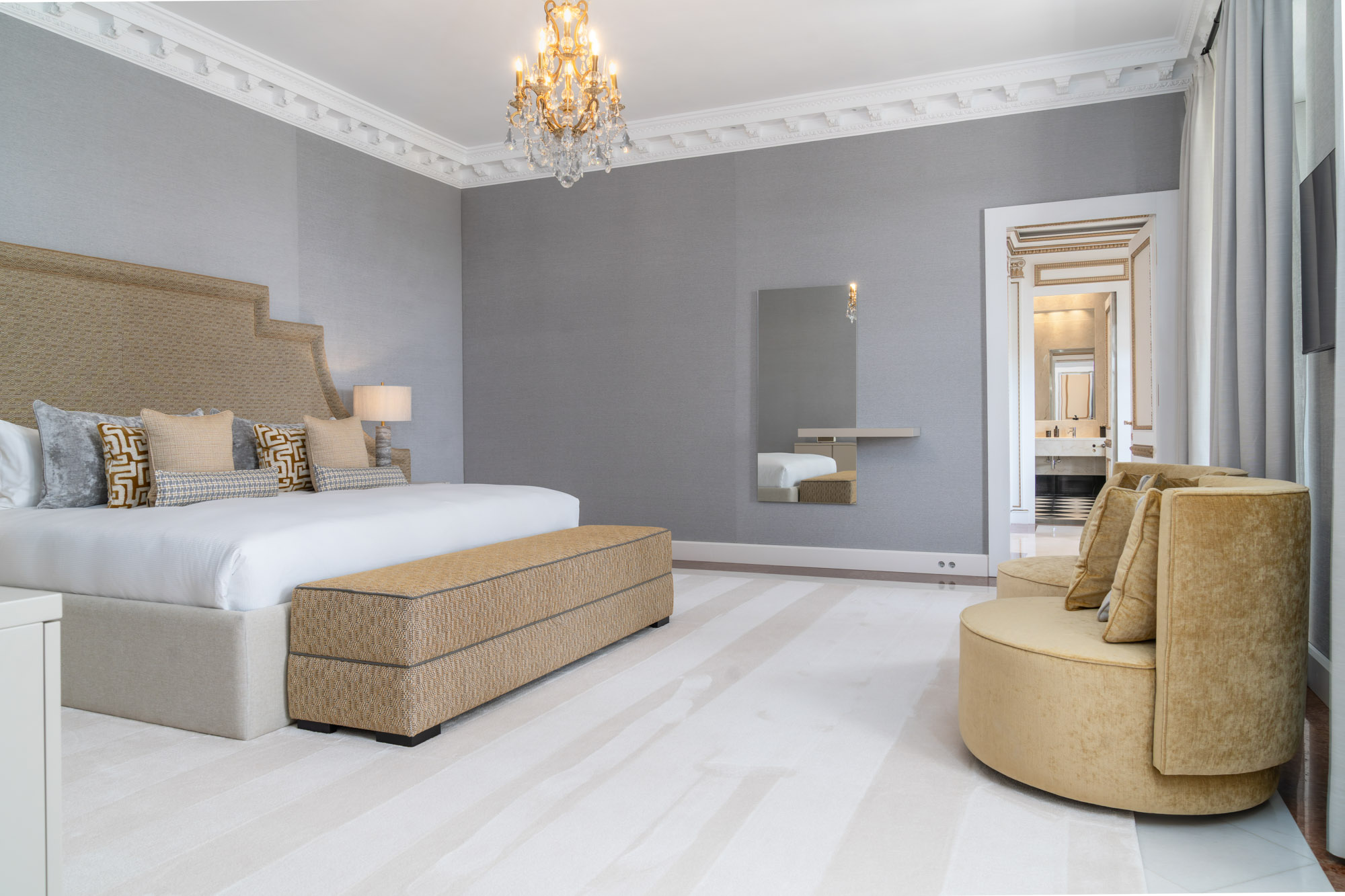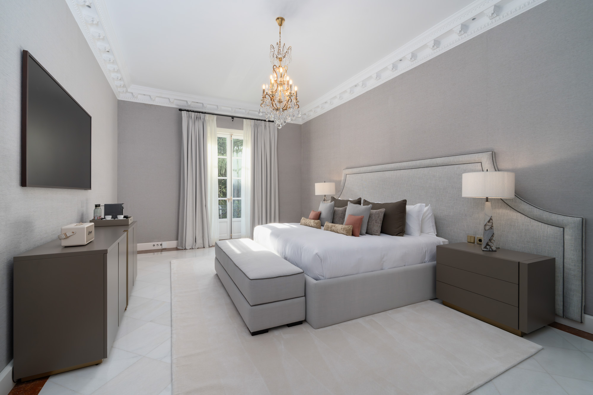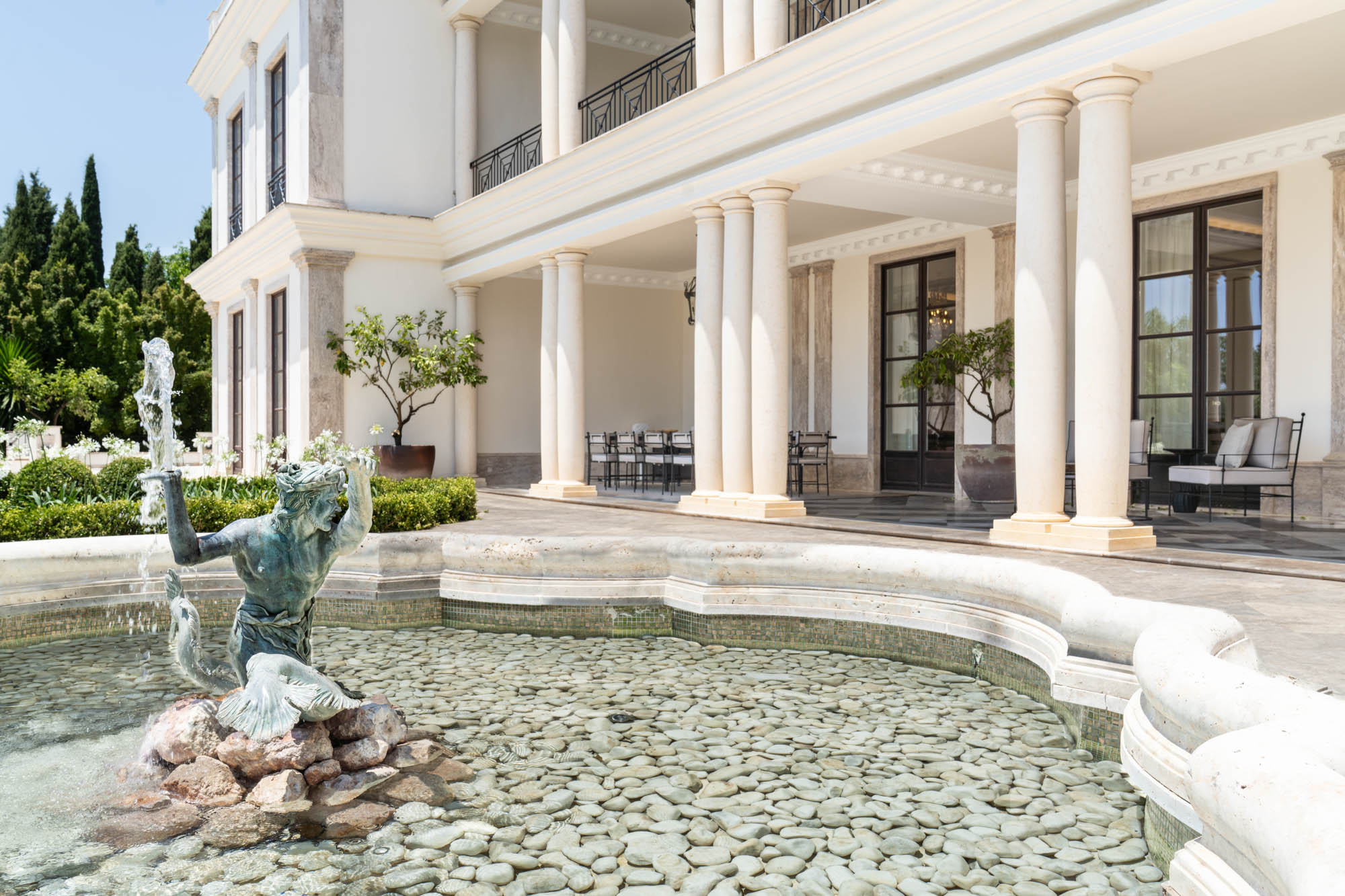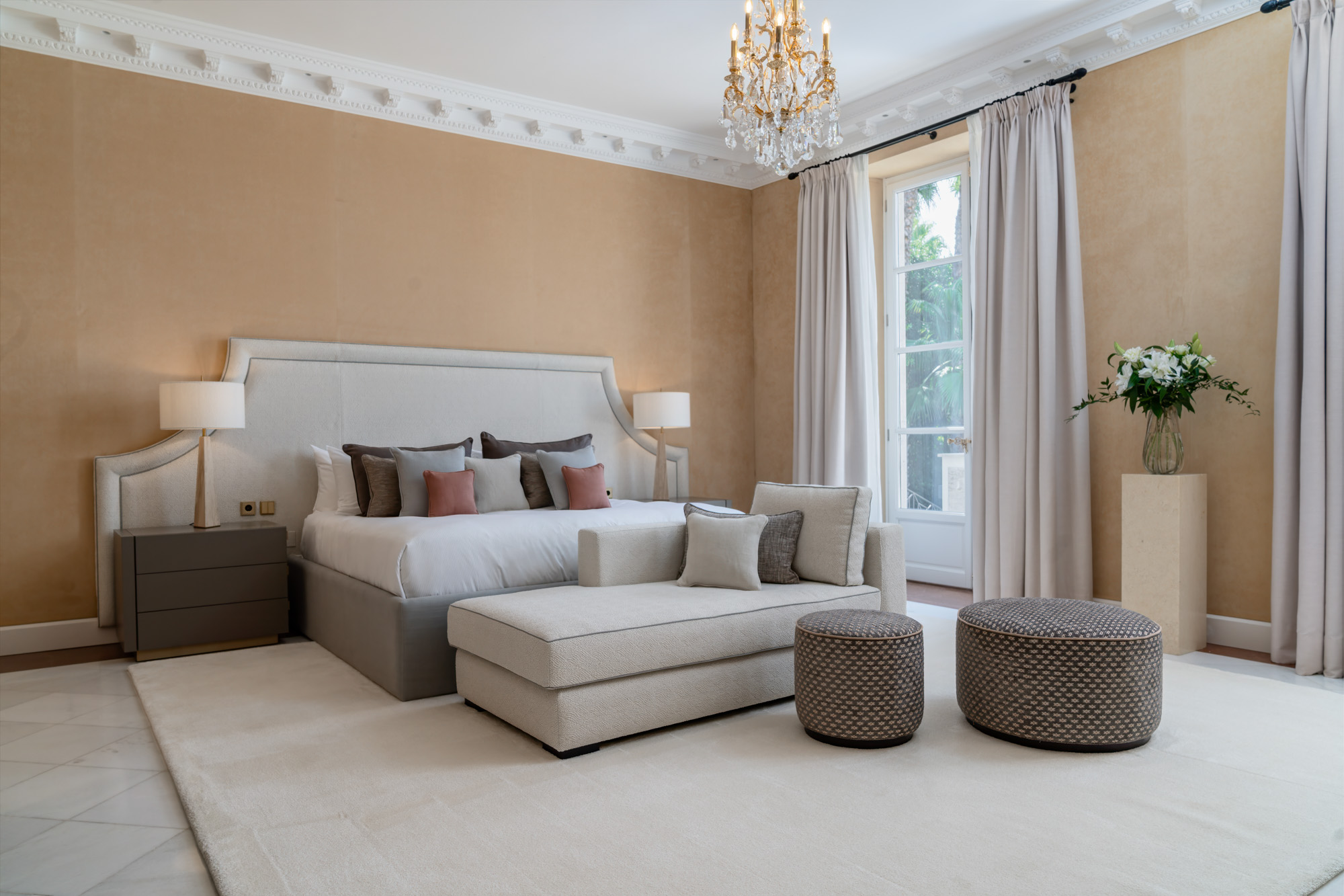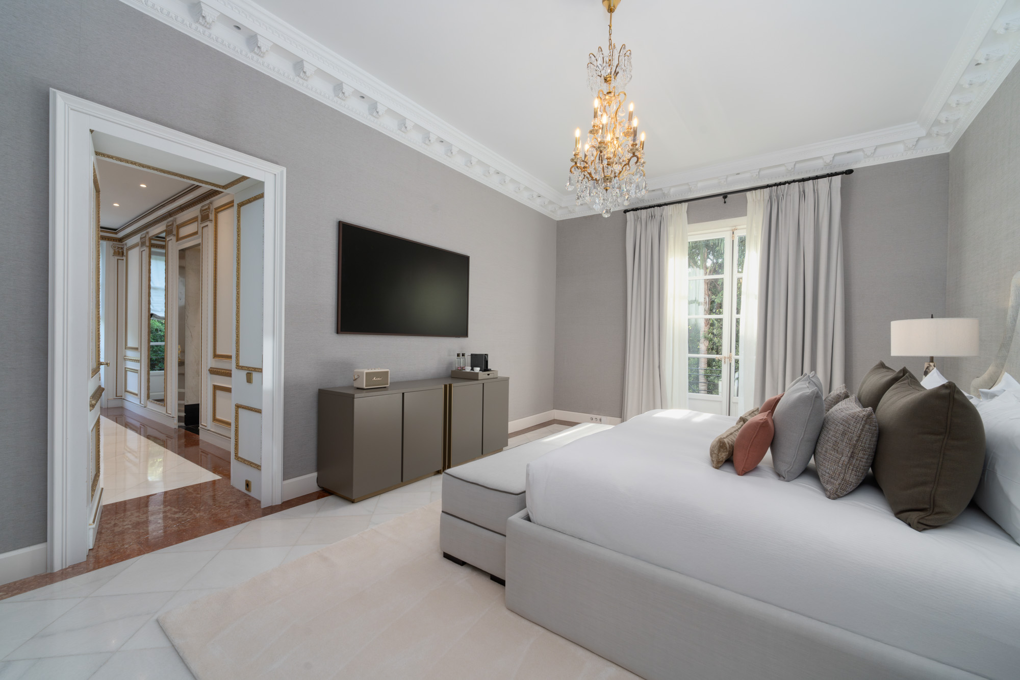 For seamless indoor-outdoor flow, these open directly onto a terrace lined with ornamental ponds, fountains and mature olive trees. While gold panelling and glittering chandeliers add a touch of opulence, the atmosphere remains calm – anchored by a soft palette of creams and dove greys.