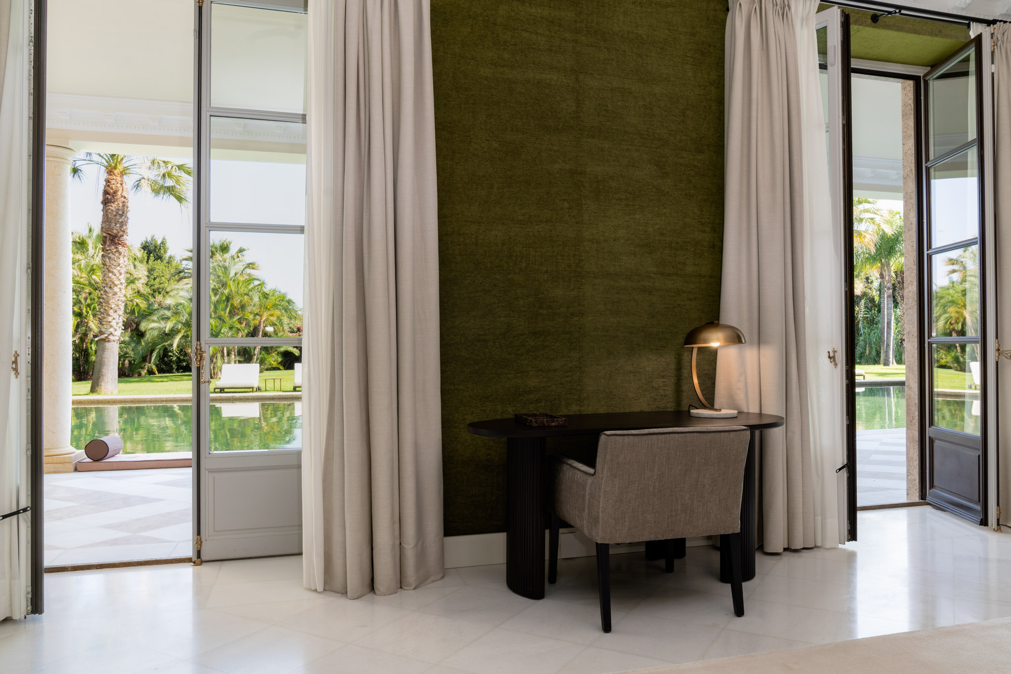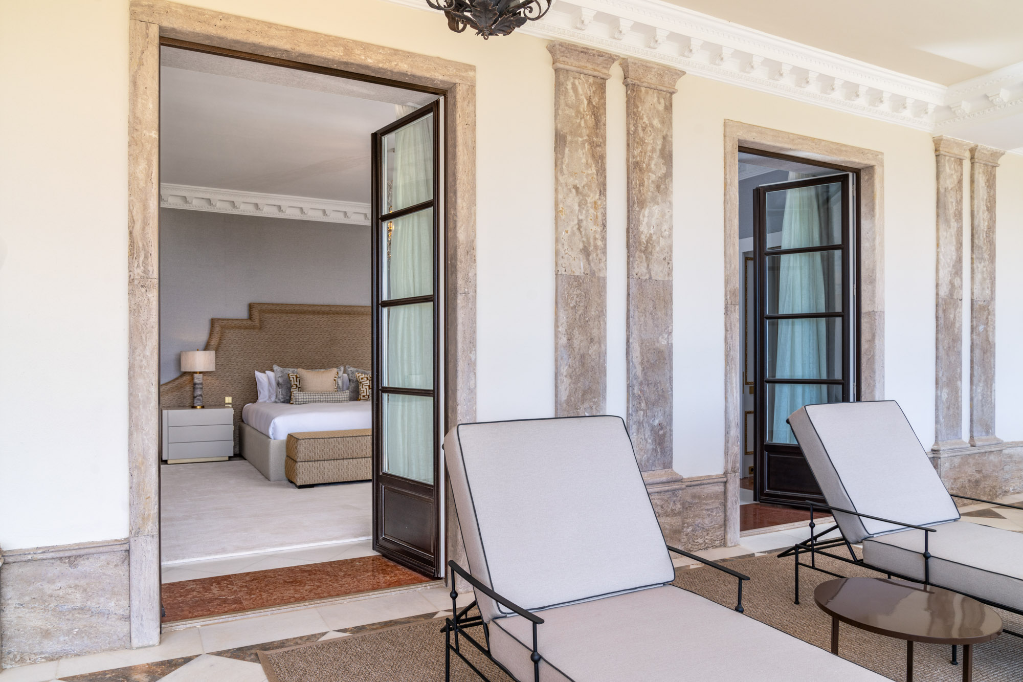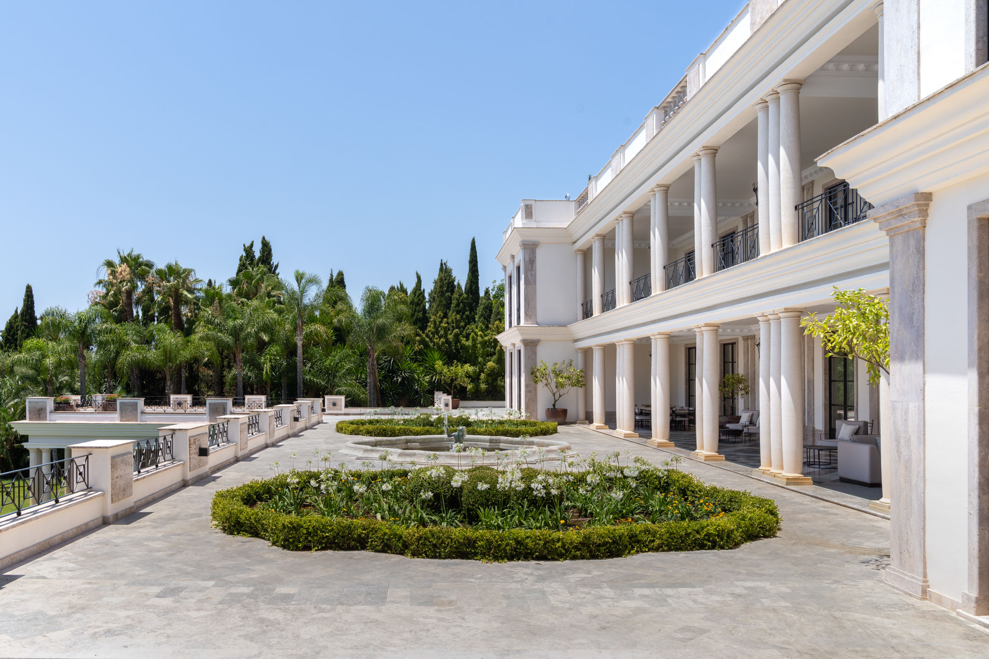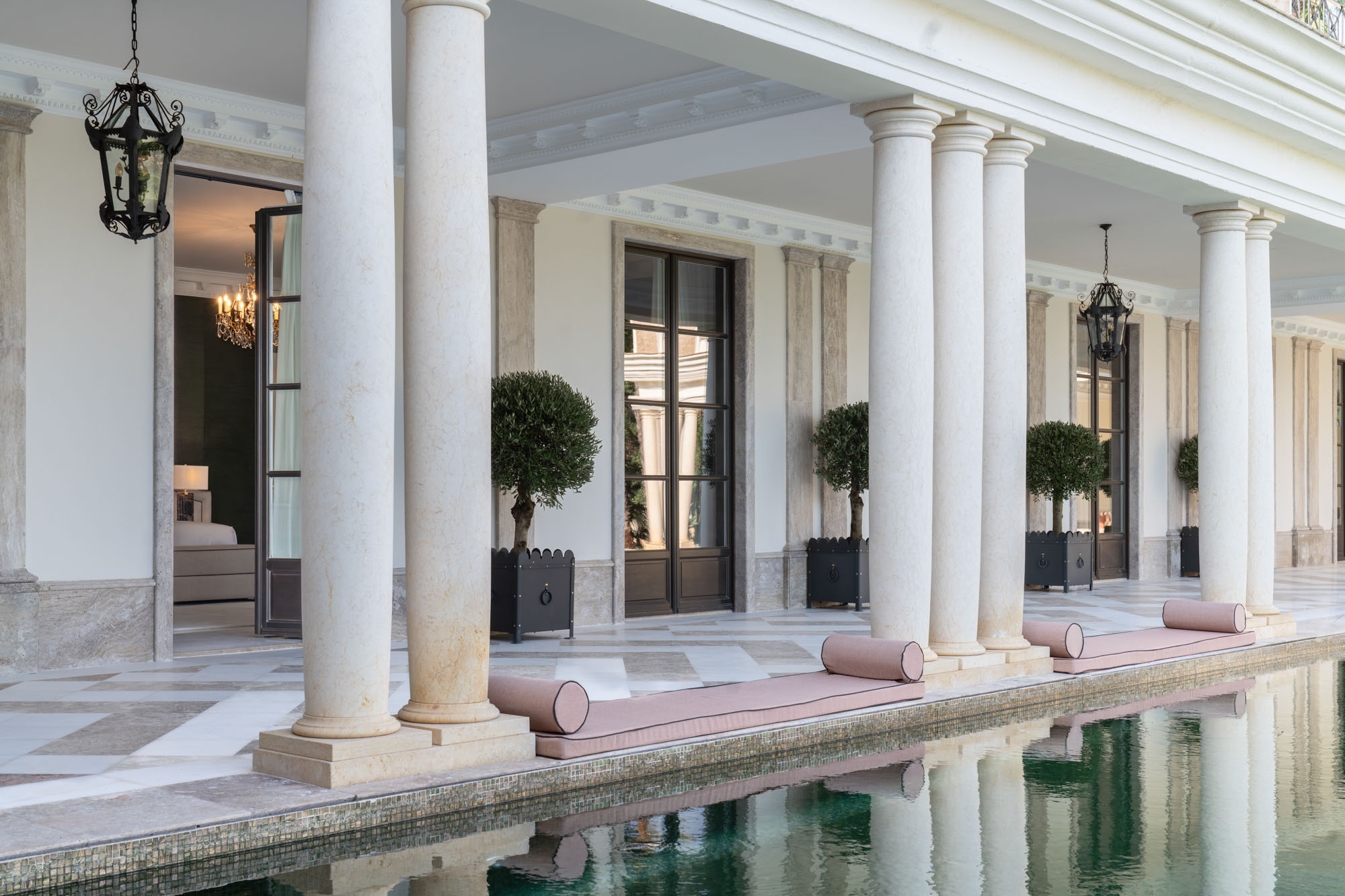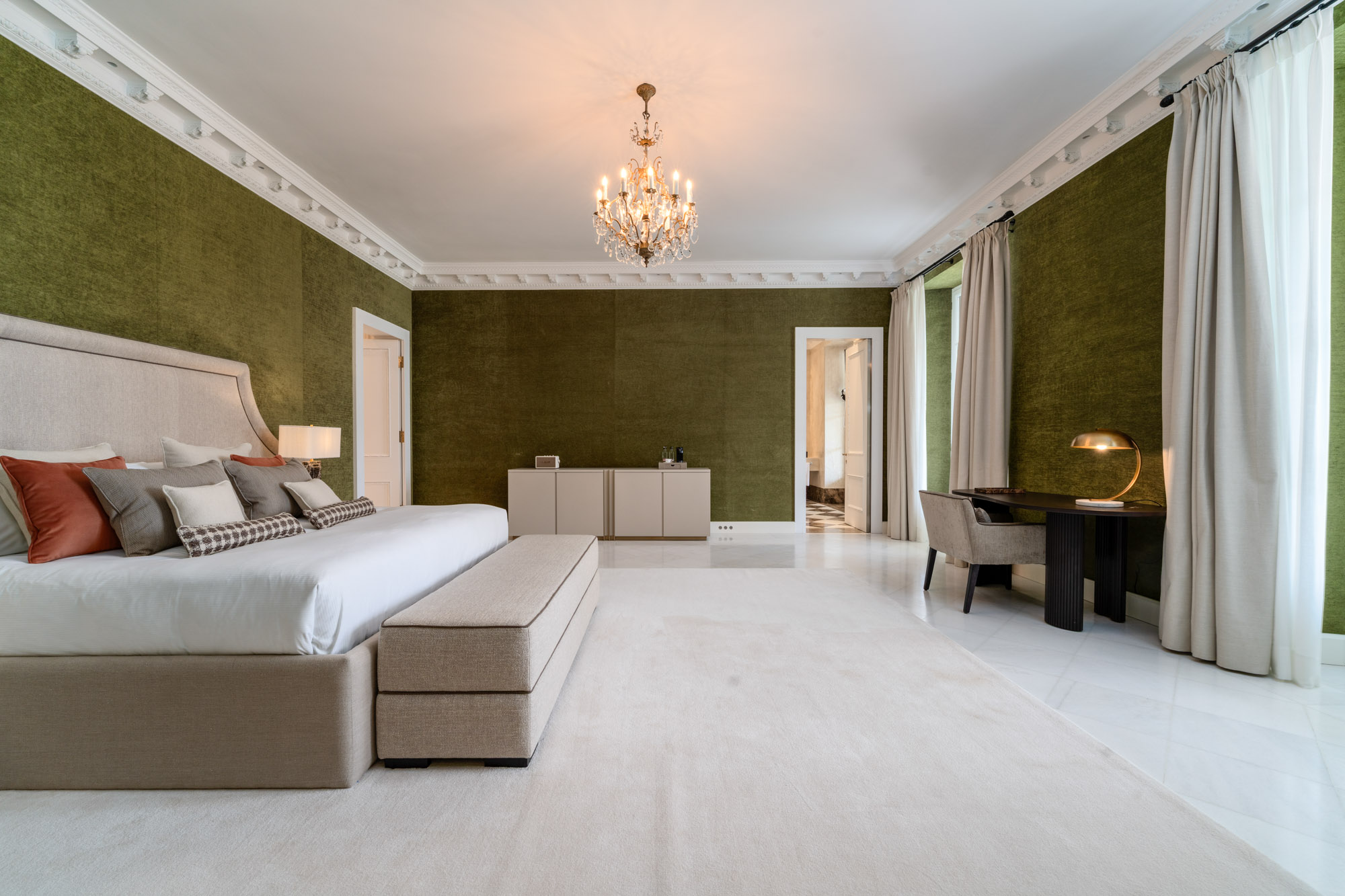 For seamless indoor-outdoor flow, these open directly onto a terrace lined with ornamental ponds, fountains and mature olive trees. While gold panelling and glittering chandeliers add a touch of opulence, the atmosphere remains calm – anchored by a soft palette of creams and dove greys.
