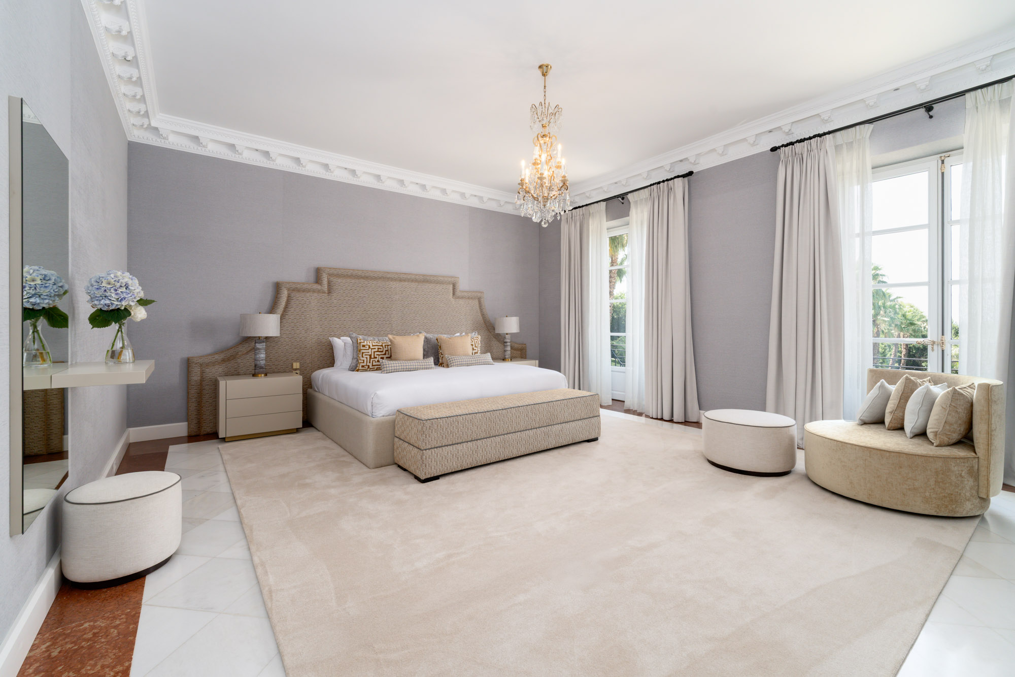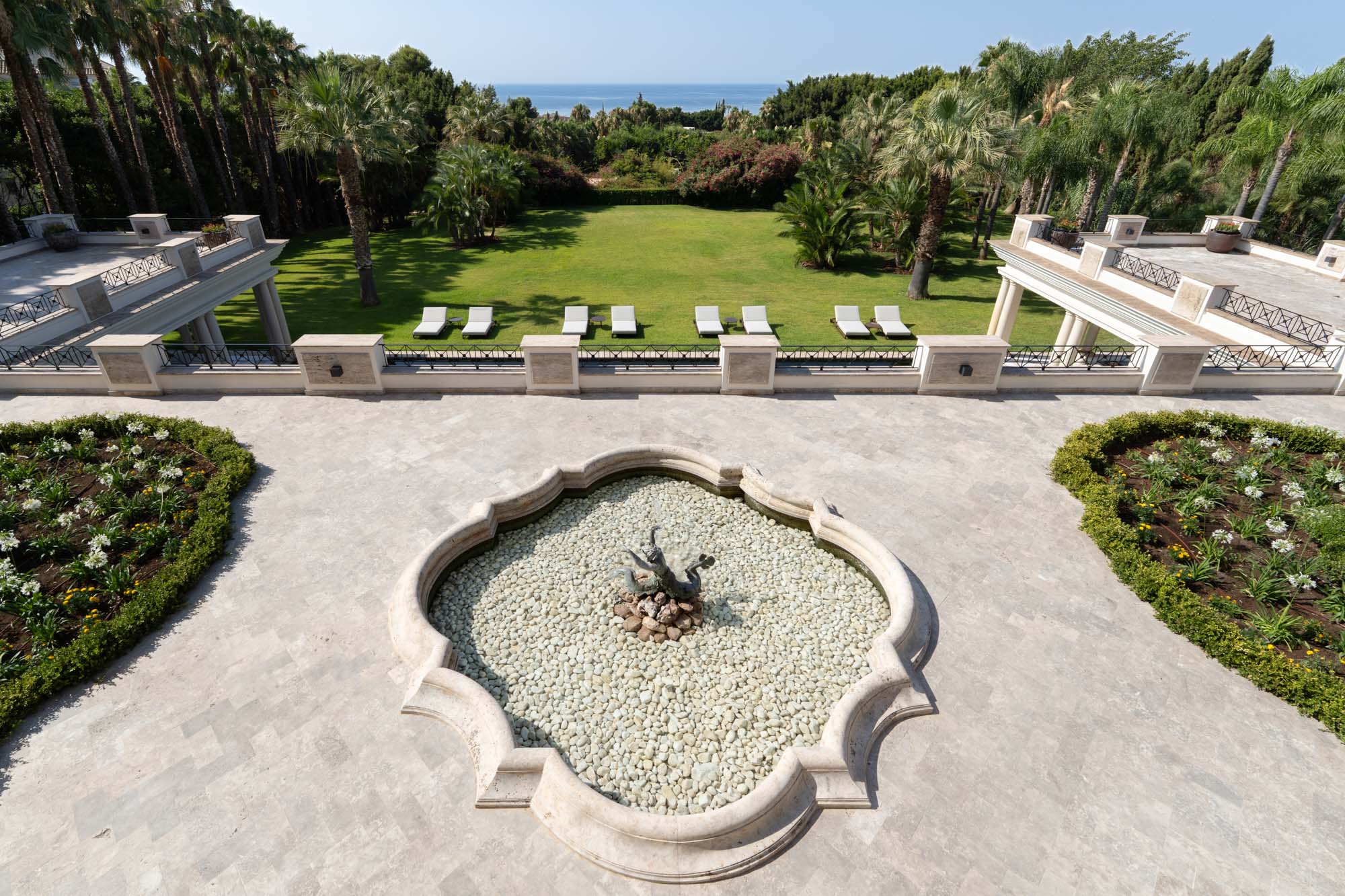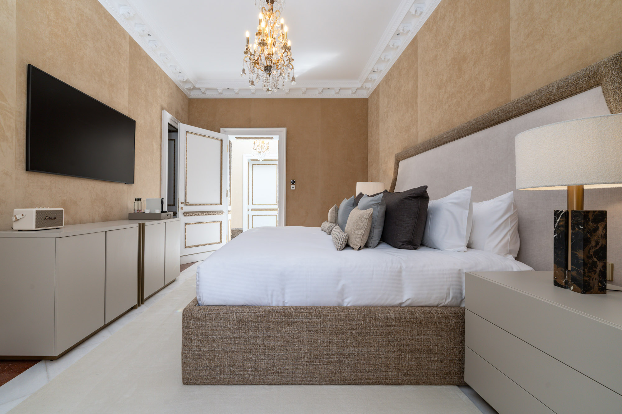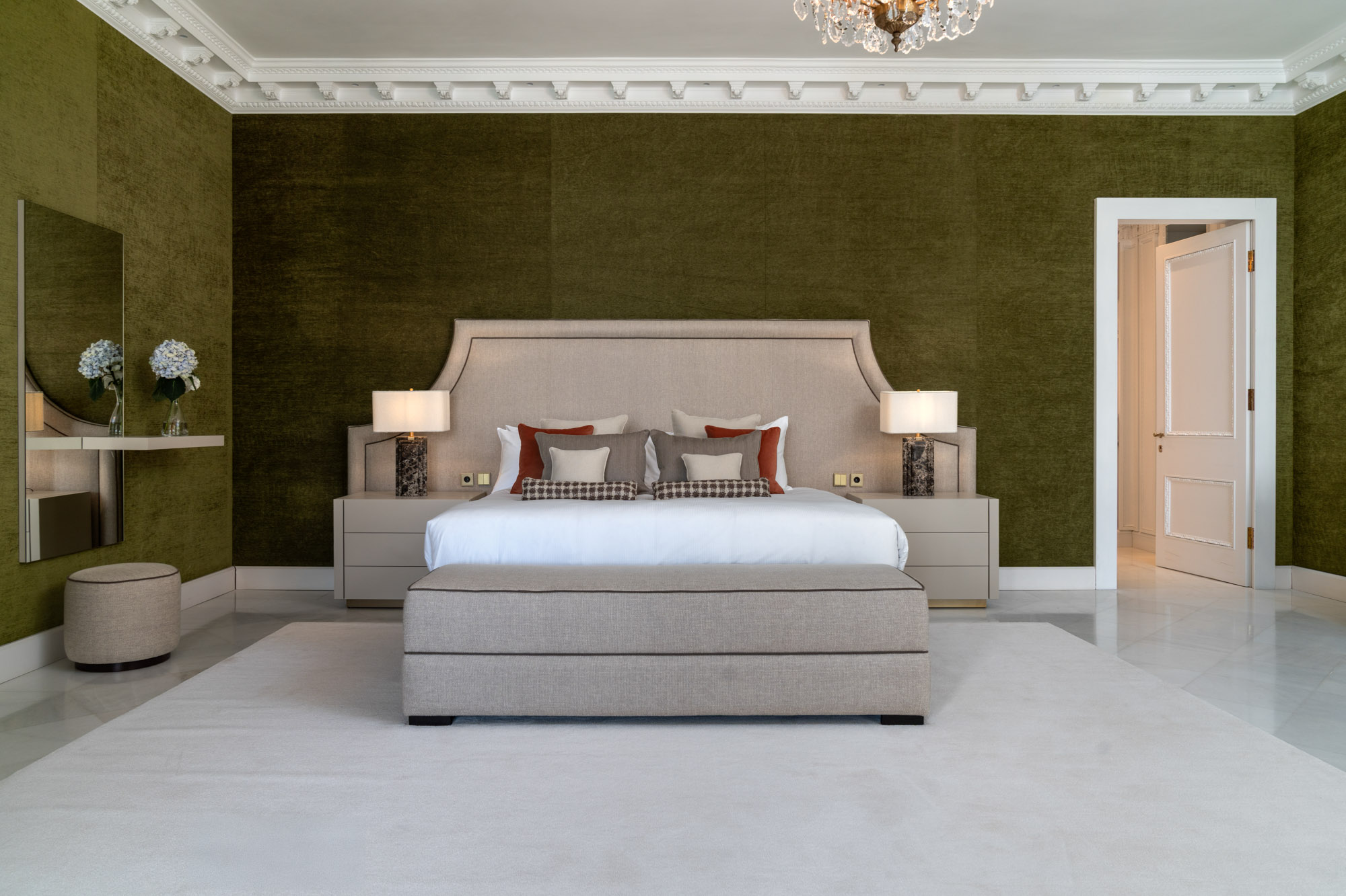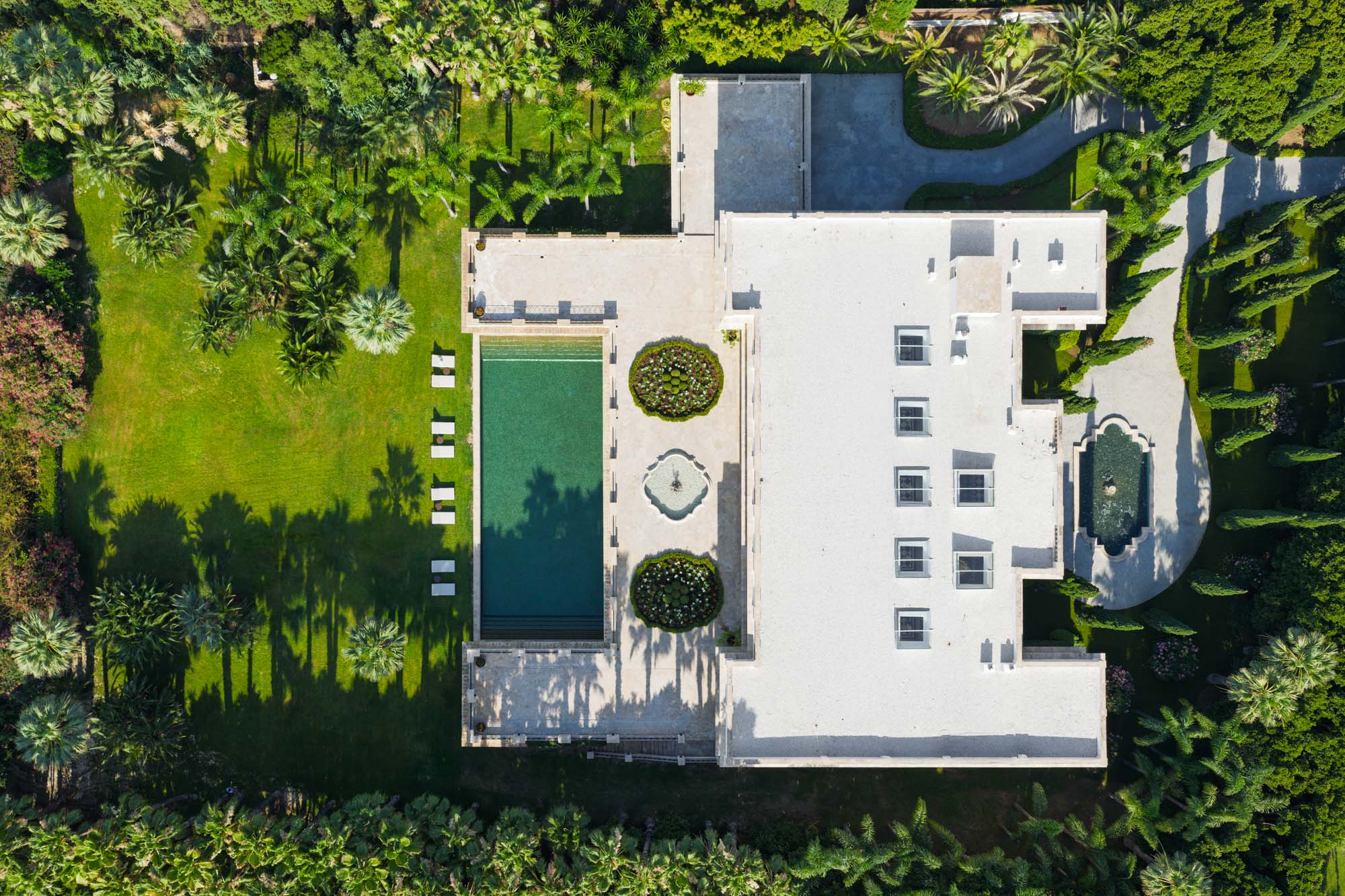 For seamless indoor-outdoor flow, these open directly onto a terrace lined with ornamental ponds, fountains and mature olive trees. While gold panelling and glittering chandeliers add a touch of opulence, the atmosphere remains calm – anchored by a soft palette of creams and dove greys.