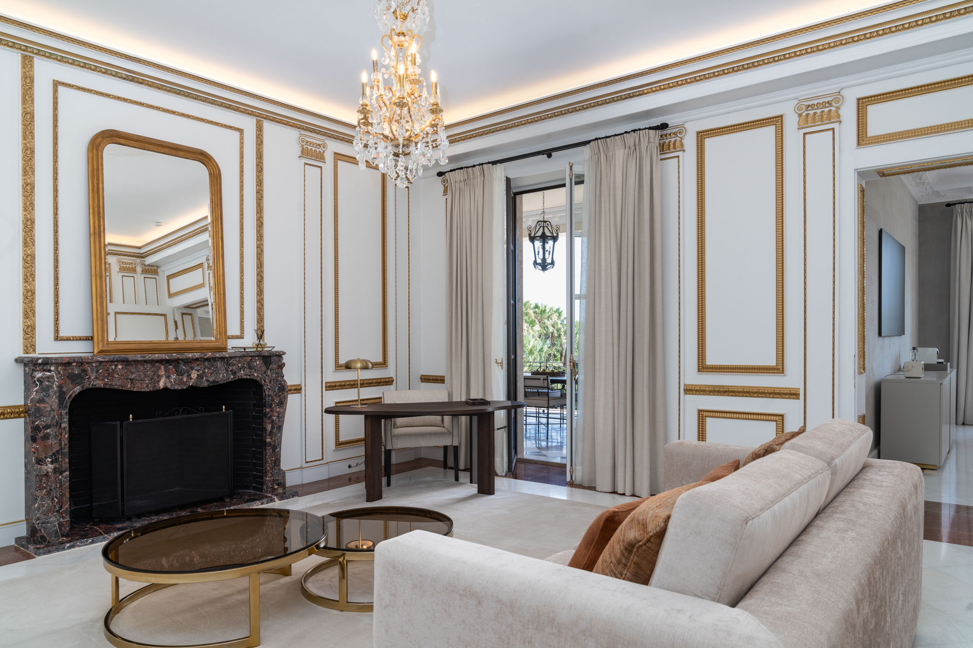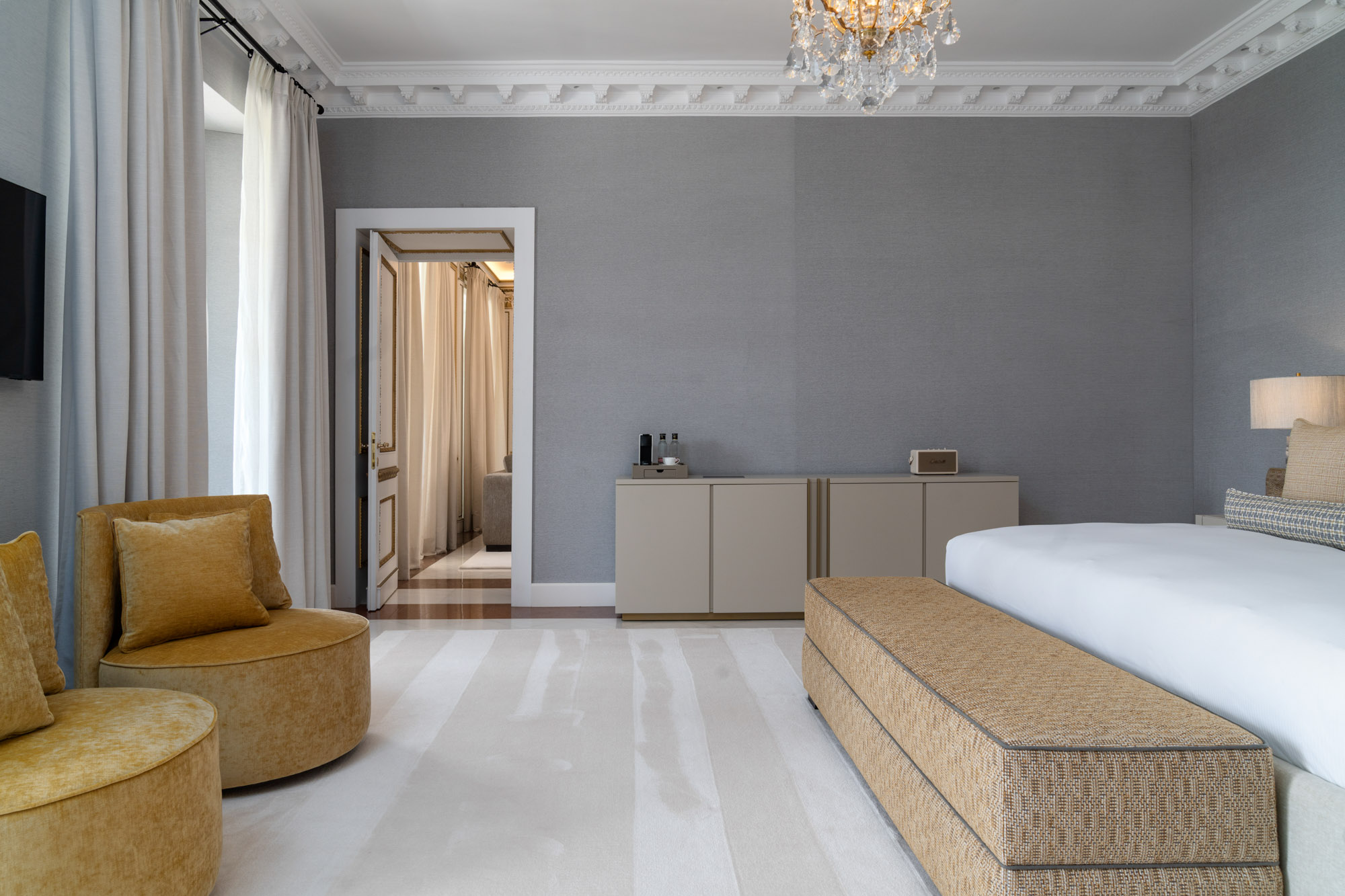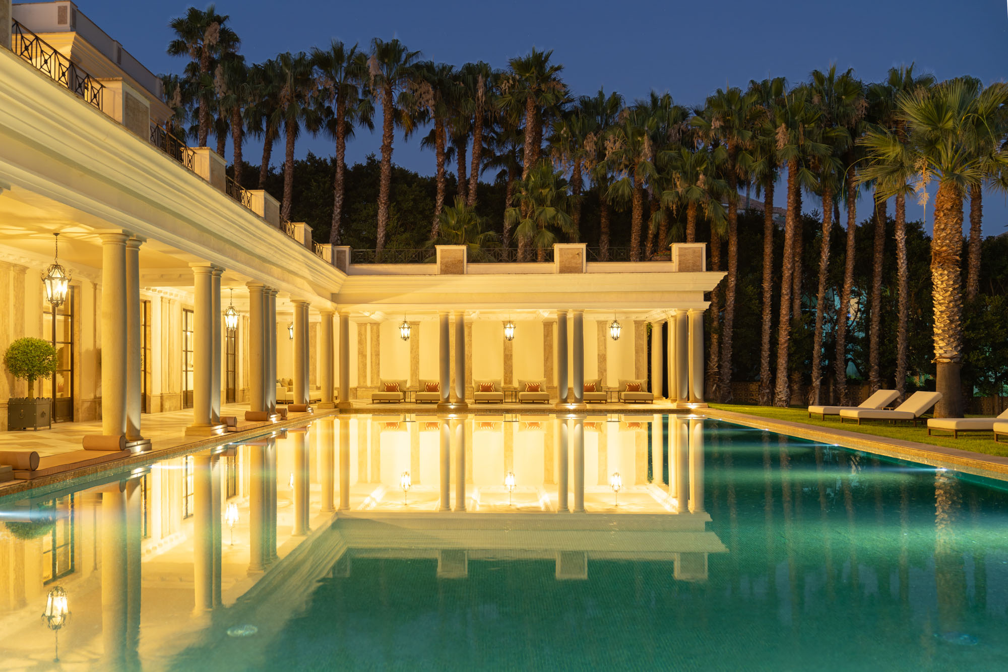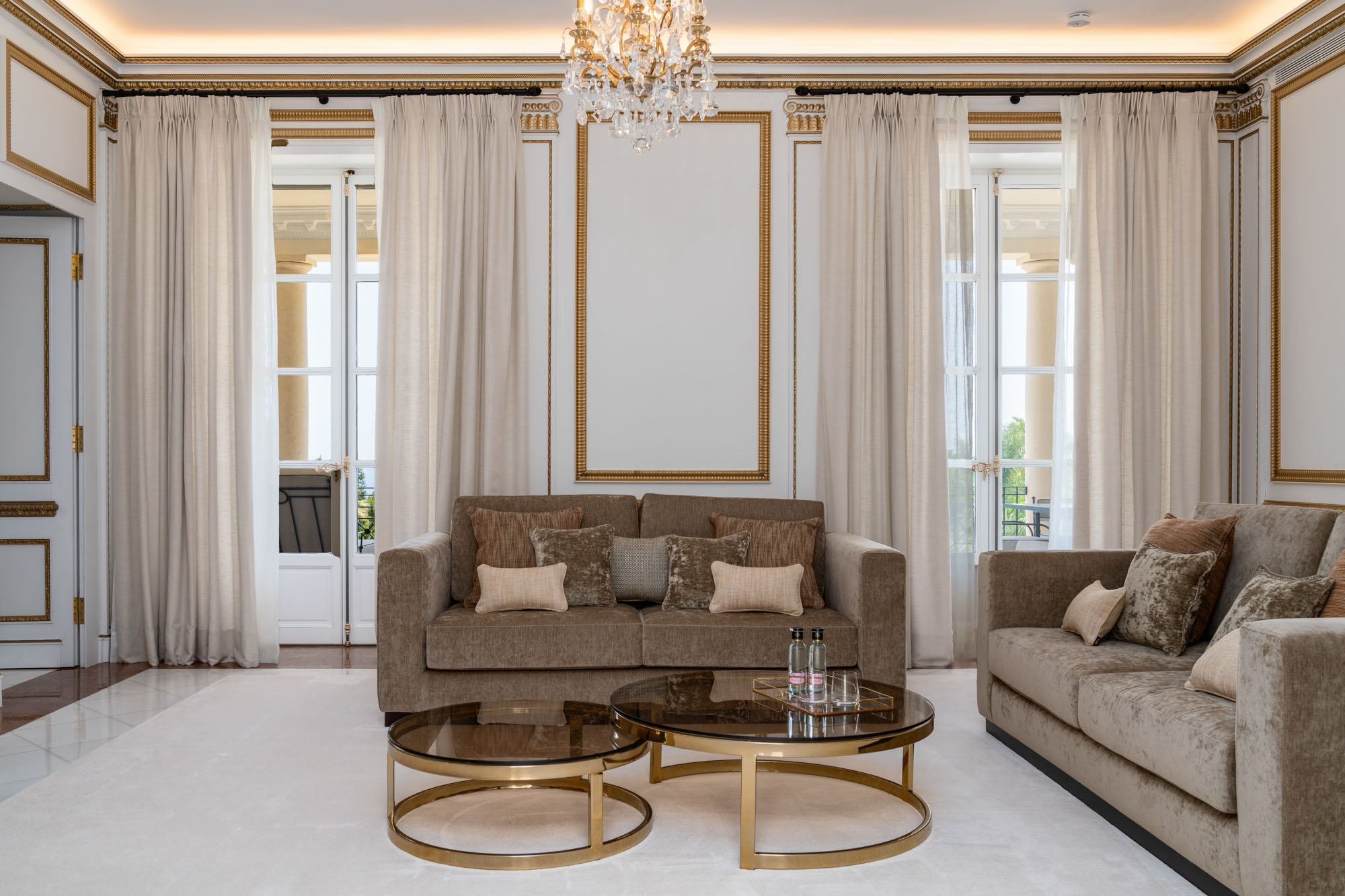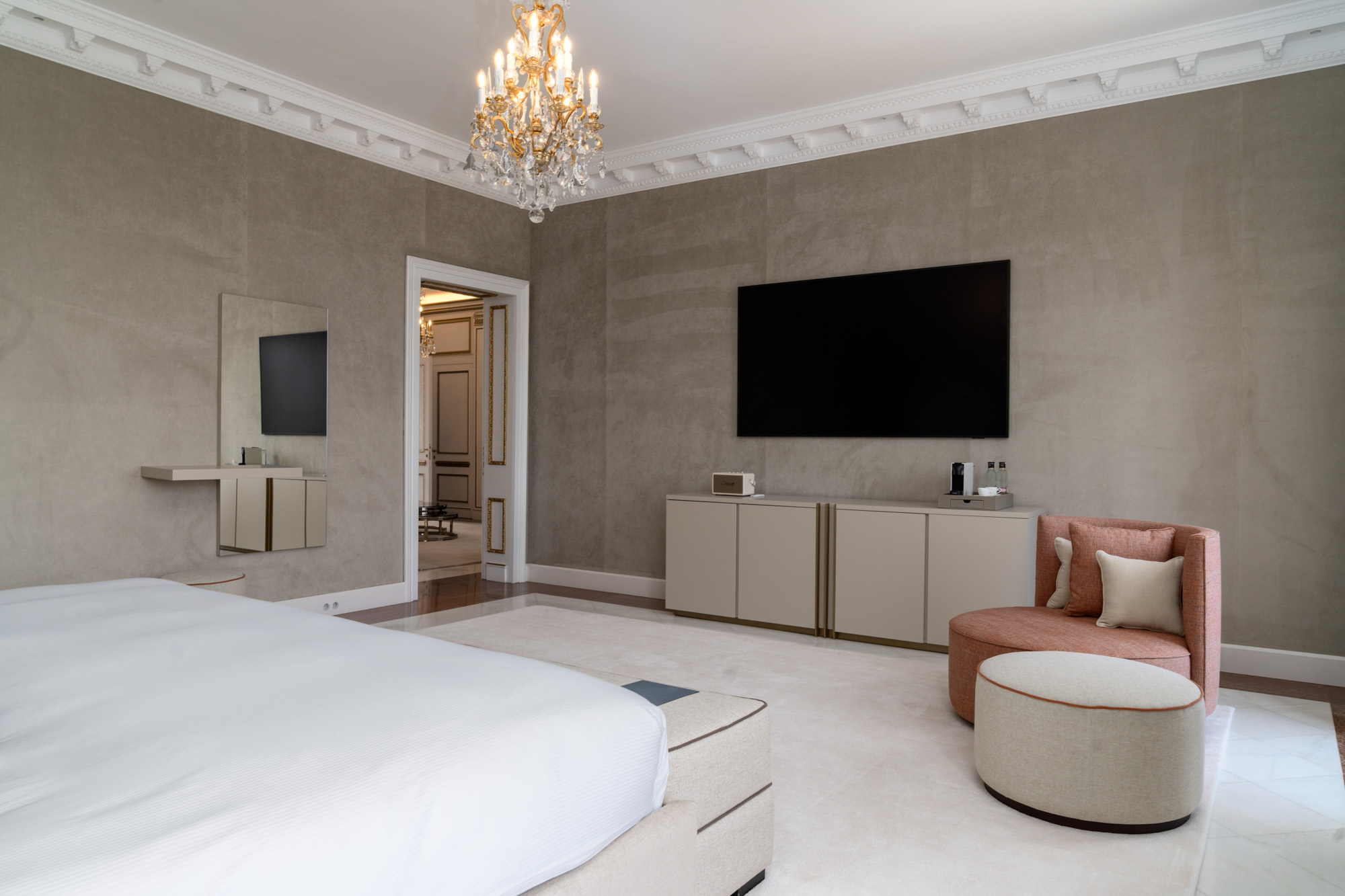 For seamless indoor-outdoor flow, these open directly onto a terrace lined with ornamental ponds, fountains and mature olive trees. While gold panelling and glittering chandeliers add a touch of opulence, the atmosphere remains calm – anchored by a soft palette of creams and dove greys.