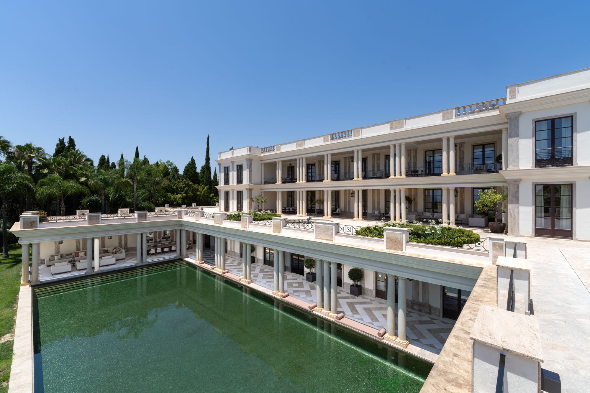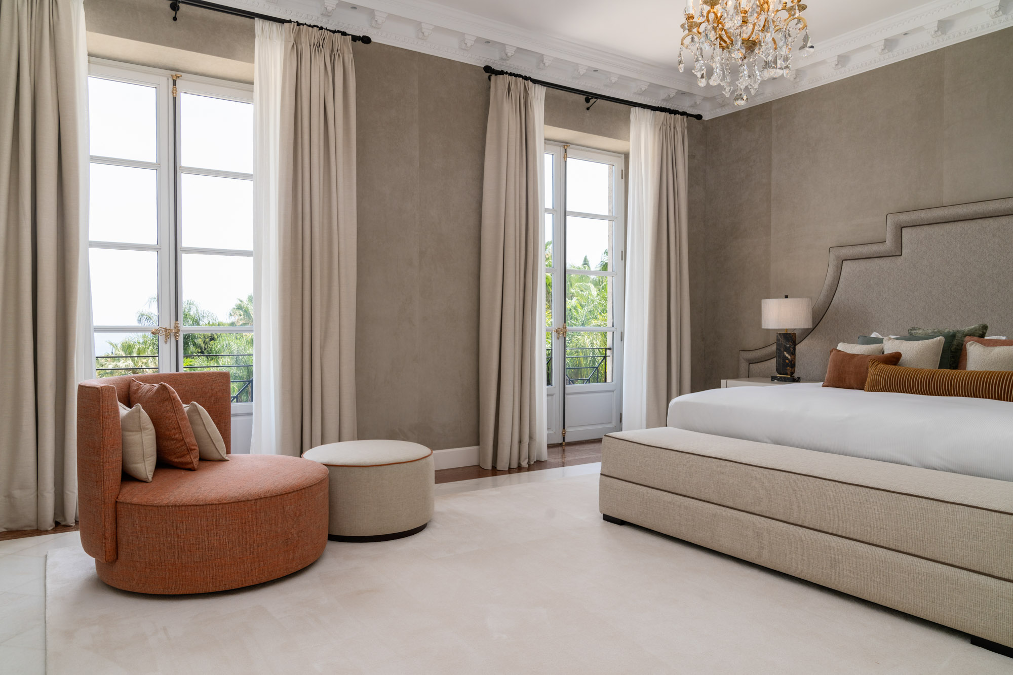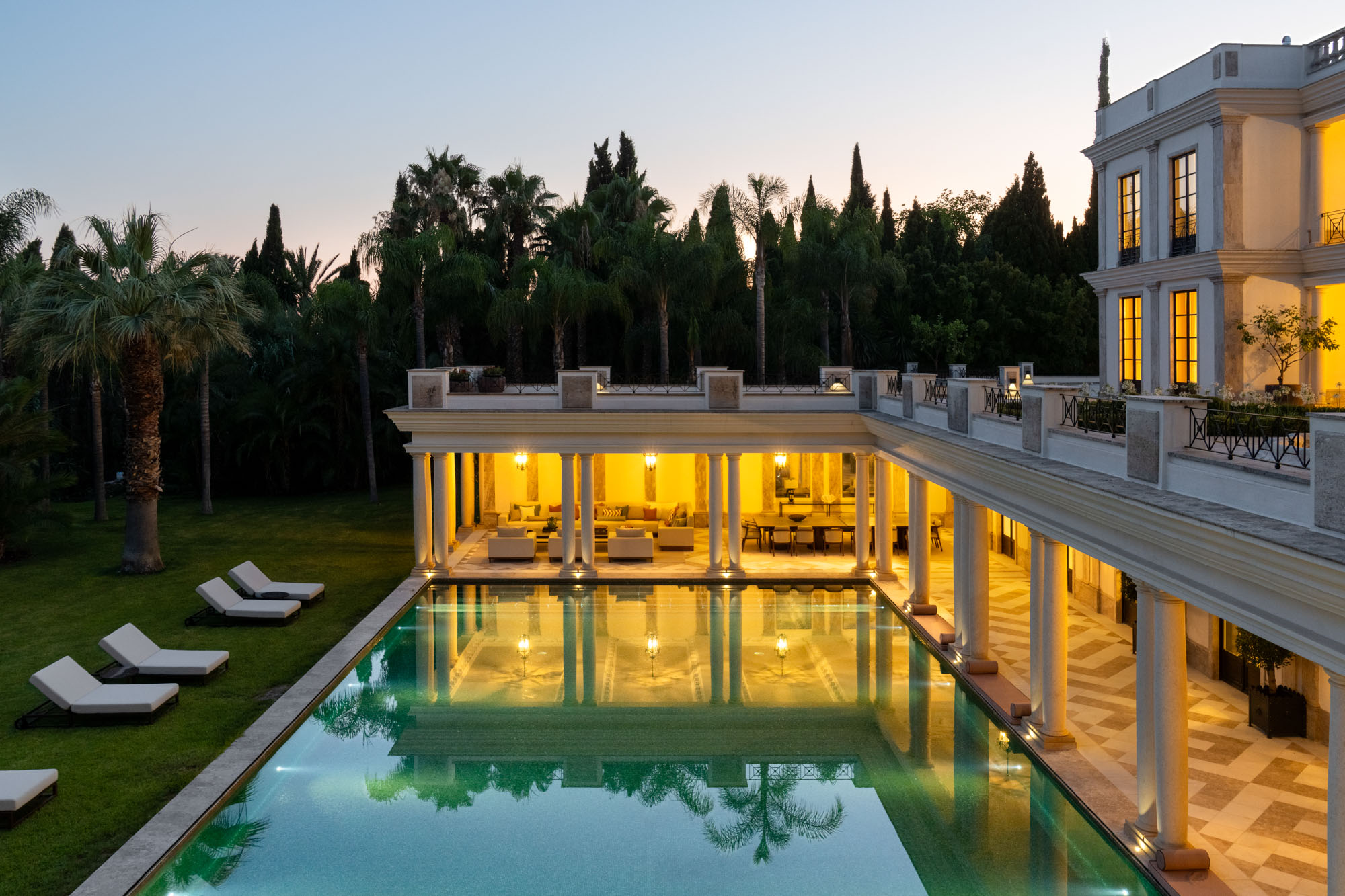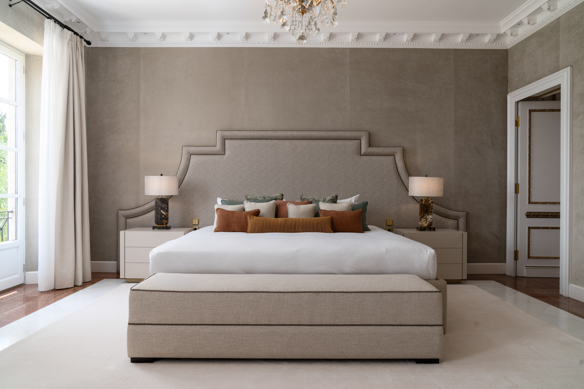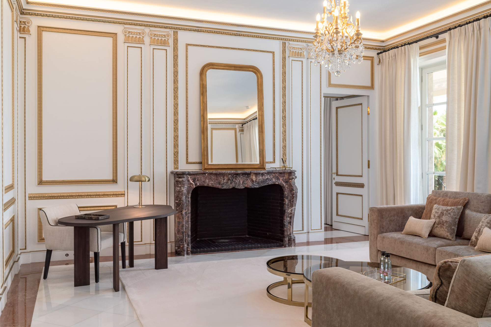 For seamless indoor-outdoor flow, these open directly onto a terrace lined with ornamental ponds, fountains and mature olive trees. While gold panelling and glittering chandeliers add a touch of opulence, the atmosphere remains calm – anchored by a soft palette of creams and dove greys.