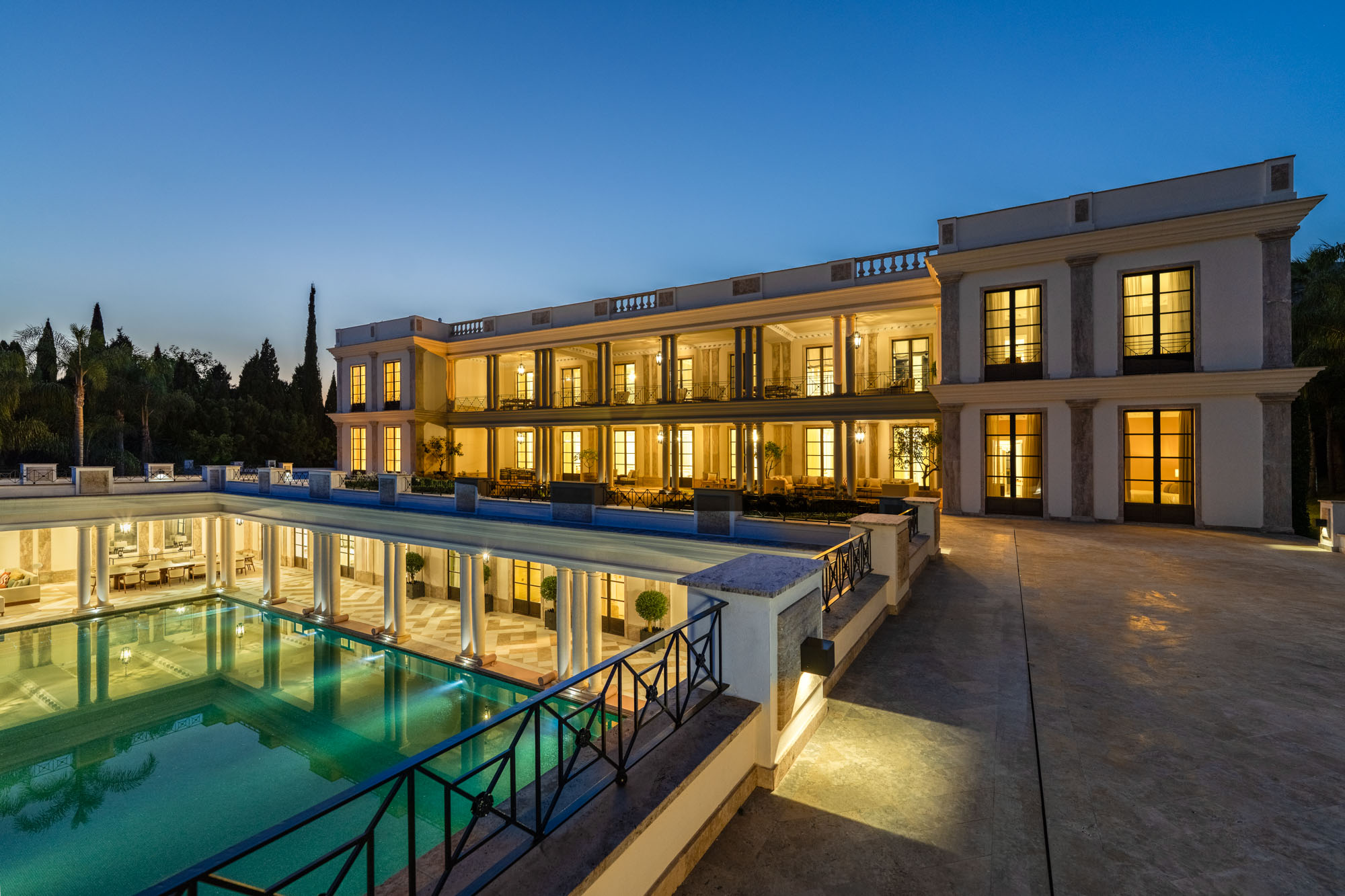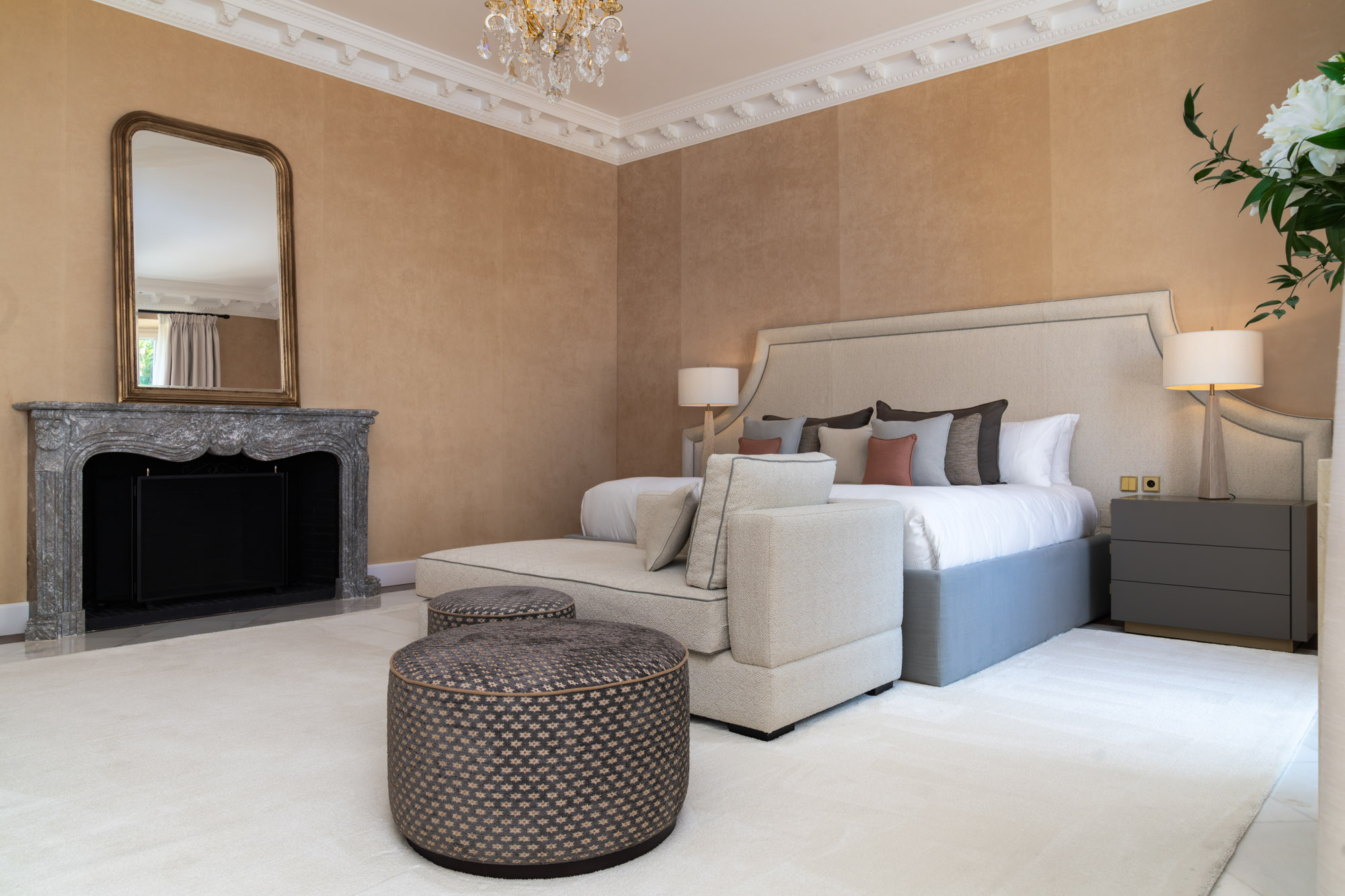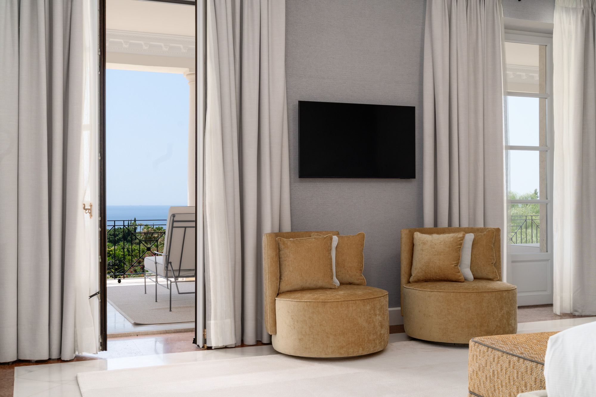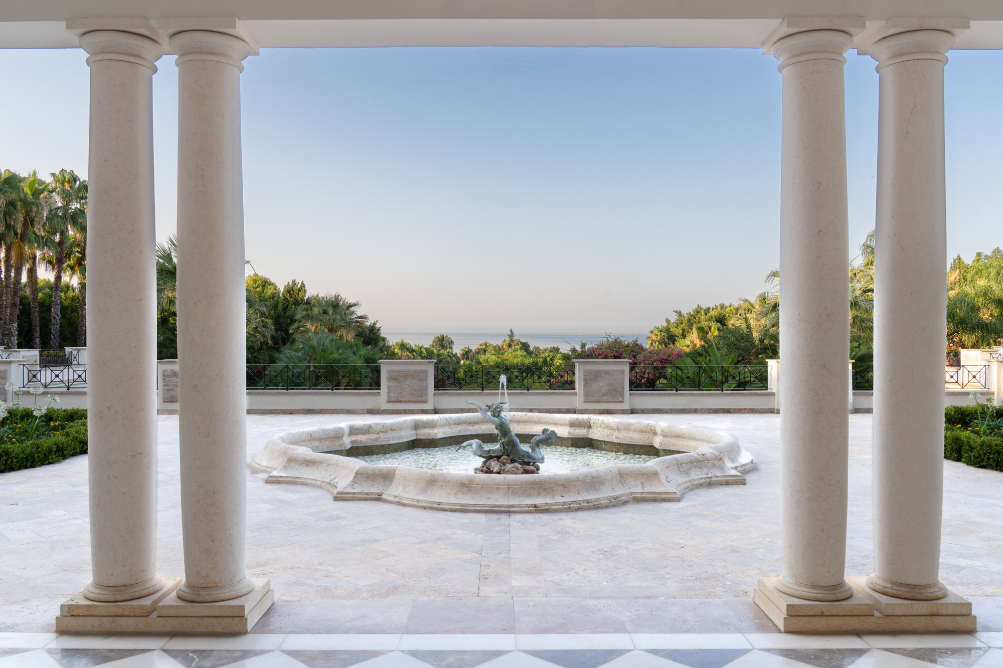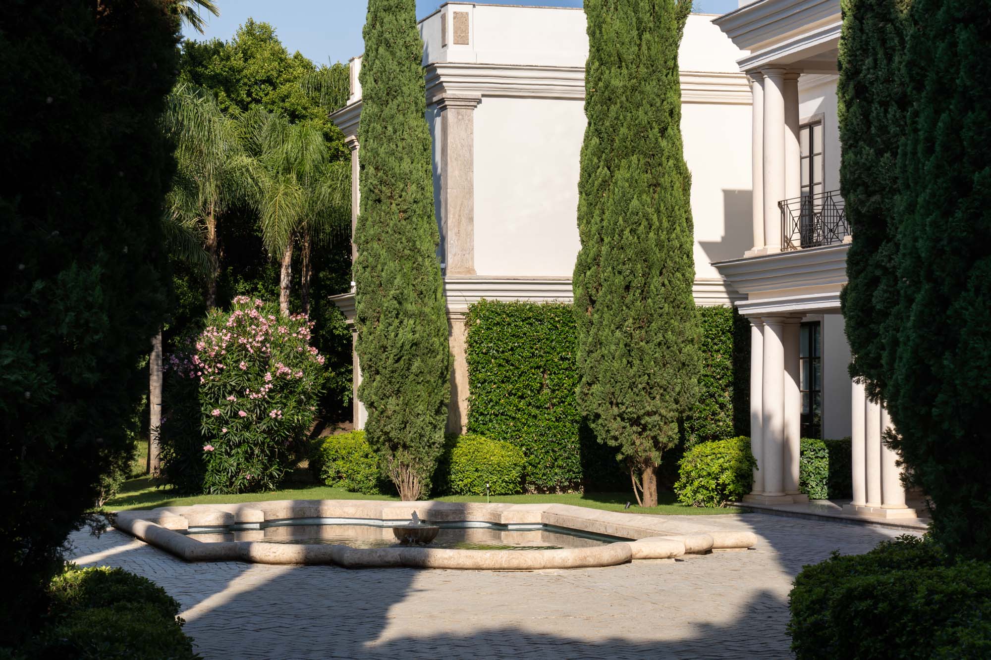 For seamless indoor-outdoor flow, these open directly onto a terrace lined with ornamental ponds, fountains and mature olive trees. While gold panelling and glittering chandeliers add a touch of opulence, the atmosphere remains calm – anchored by a soft palette of creams and dove greys.