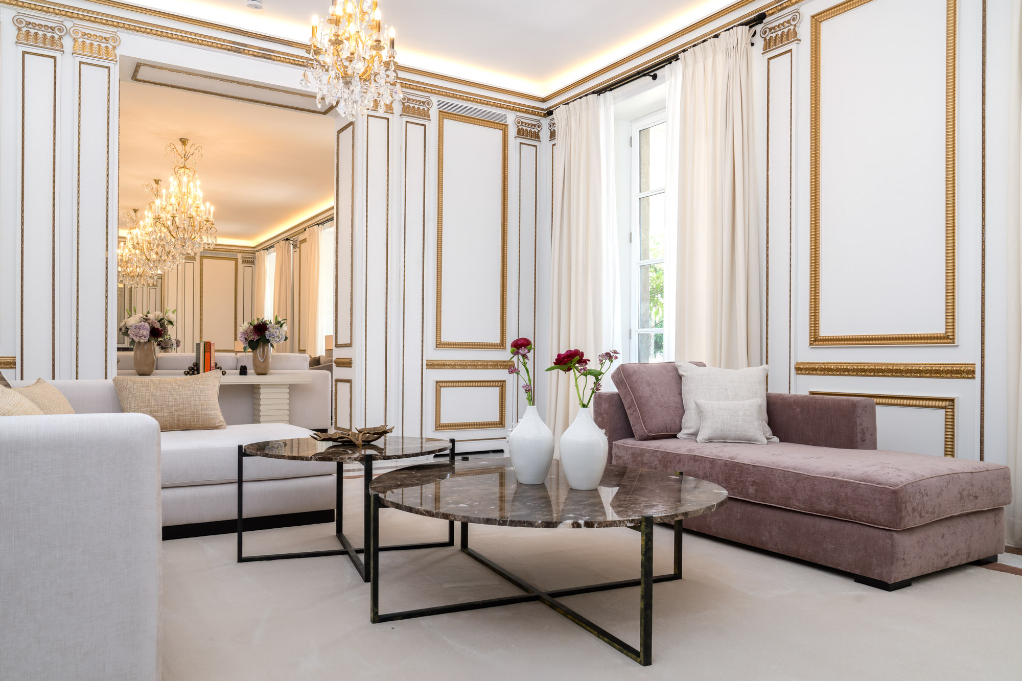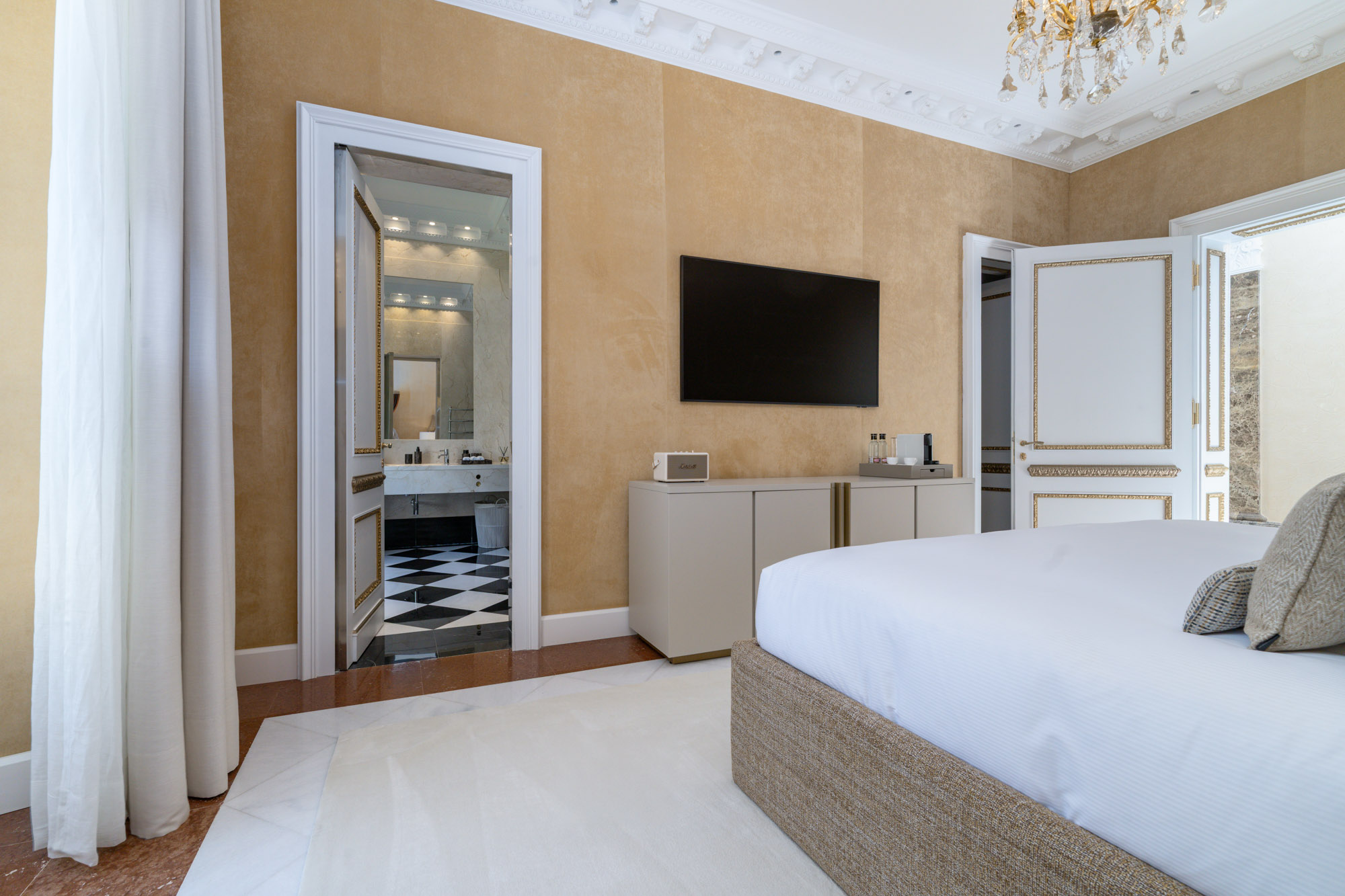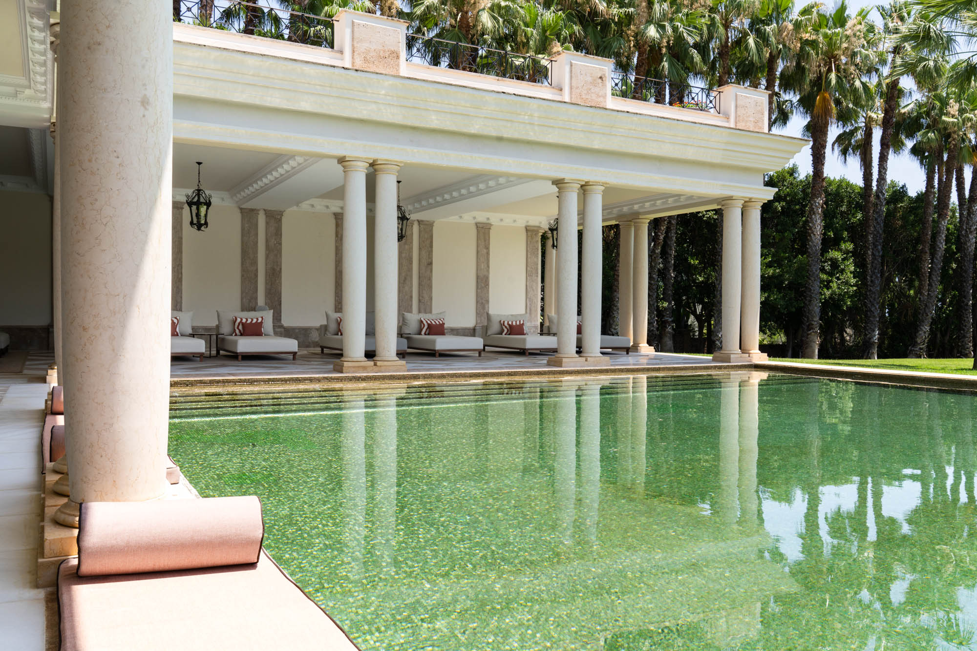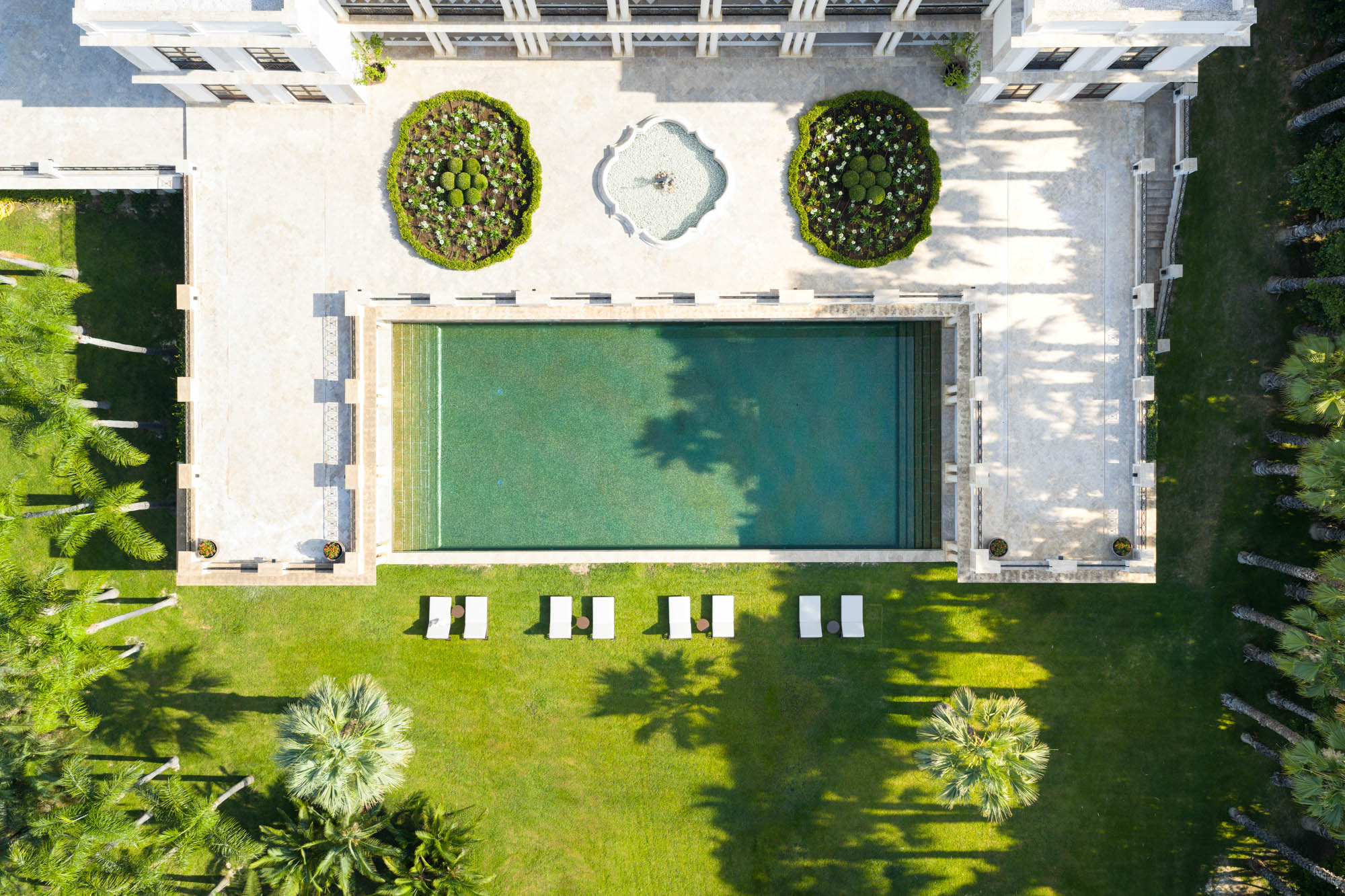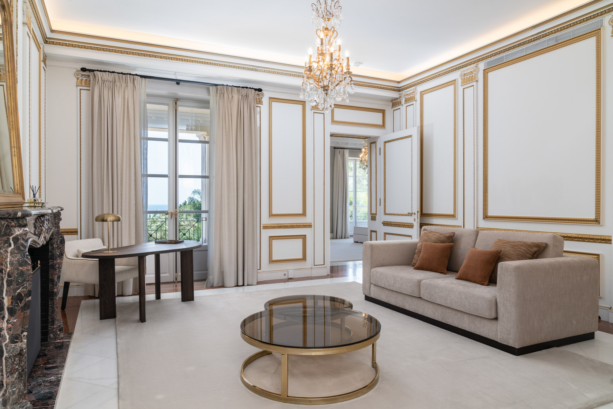 For seamless indoor-outdoor flow, these open directly onto a terrace lined with ornamental ponds, fountains and mature olive trees. While gold panelling and glittering chandeliers add a touch of opulence, the atmosphere remains calm – anchored by a soft palette of creams and dove greys.