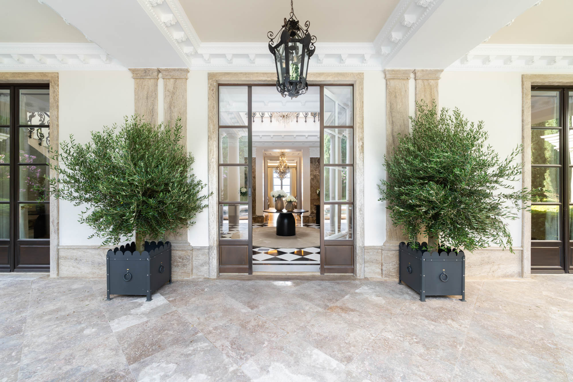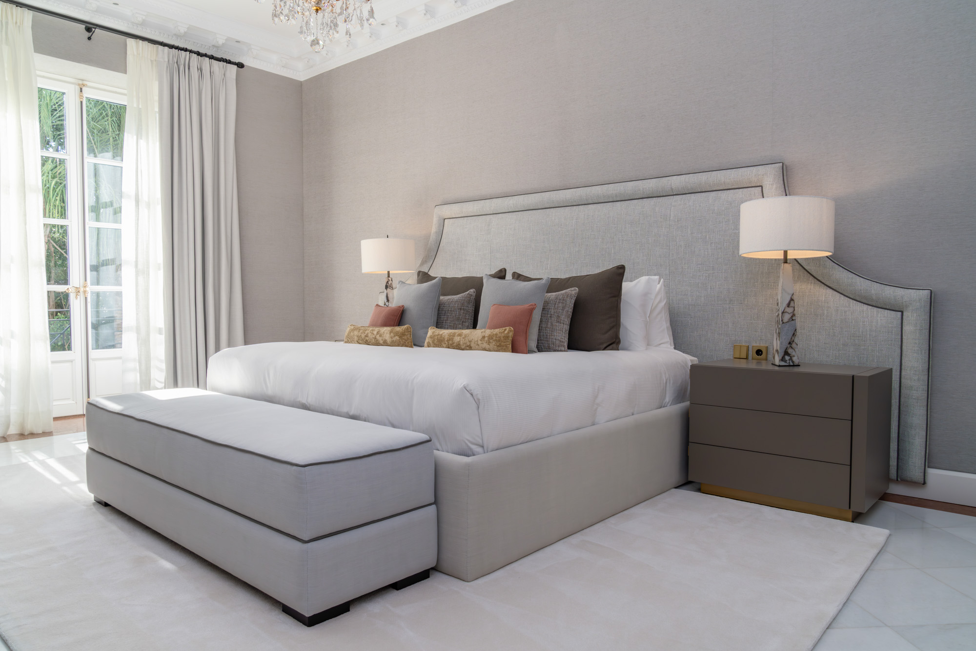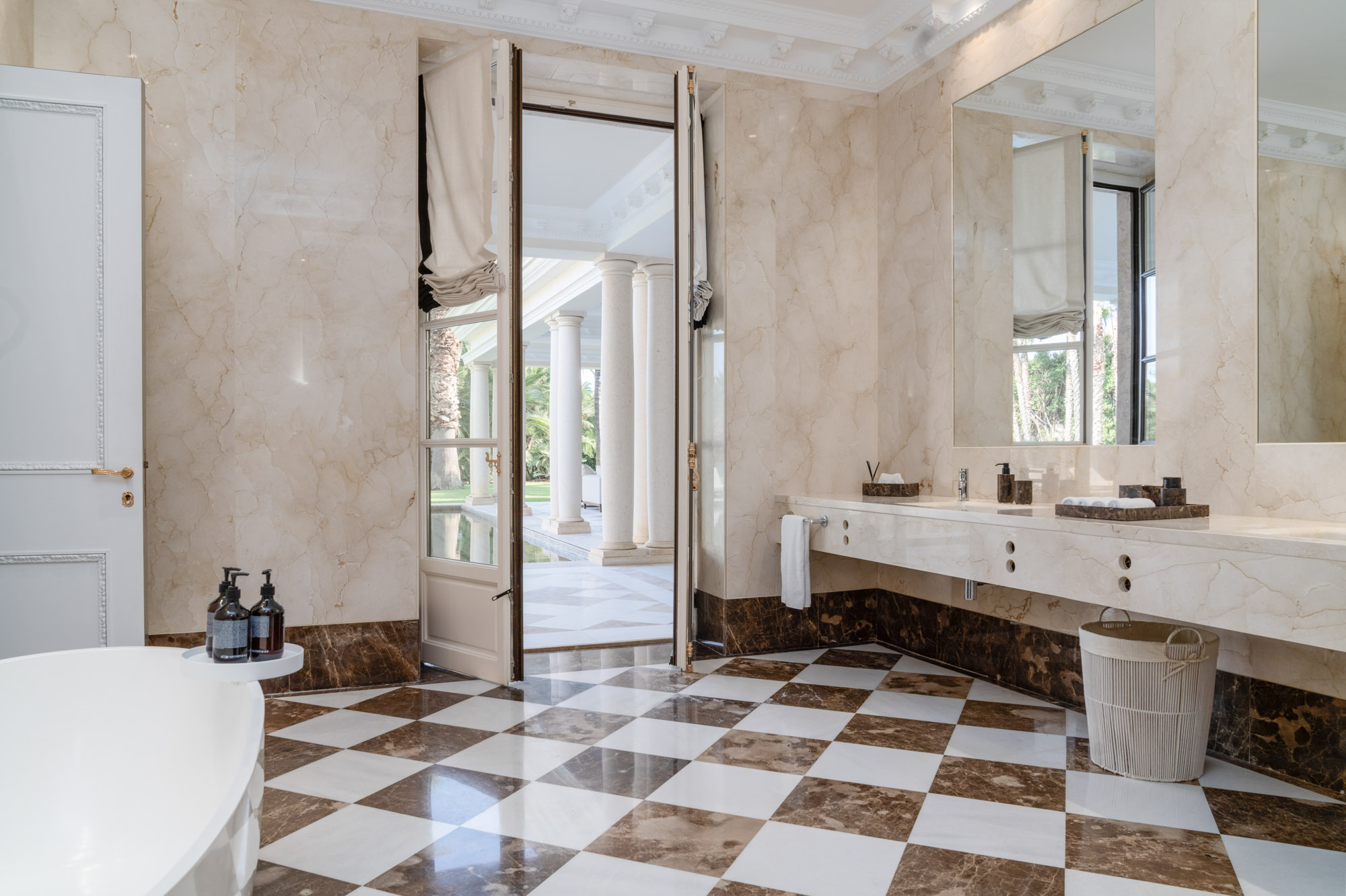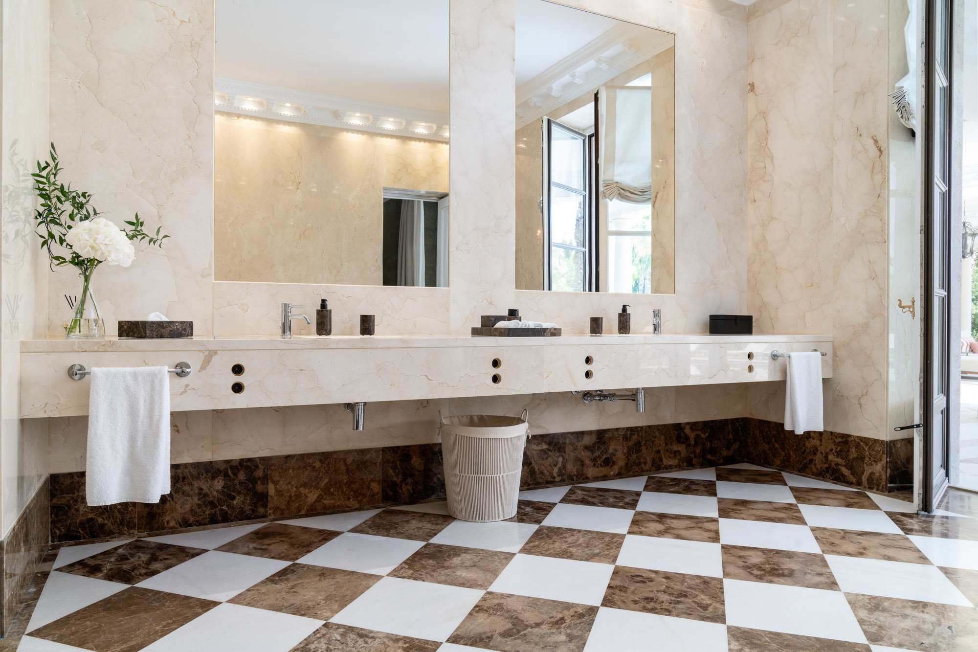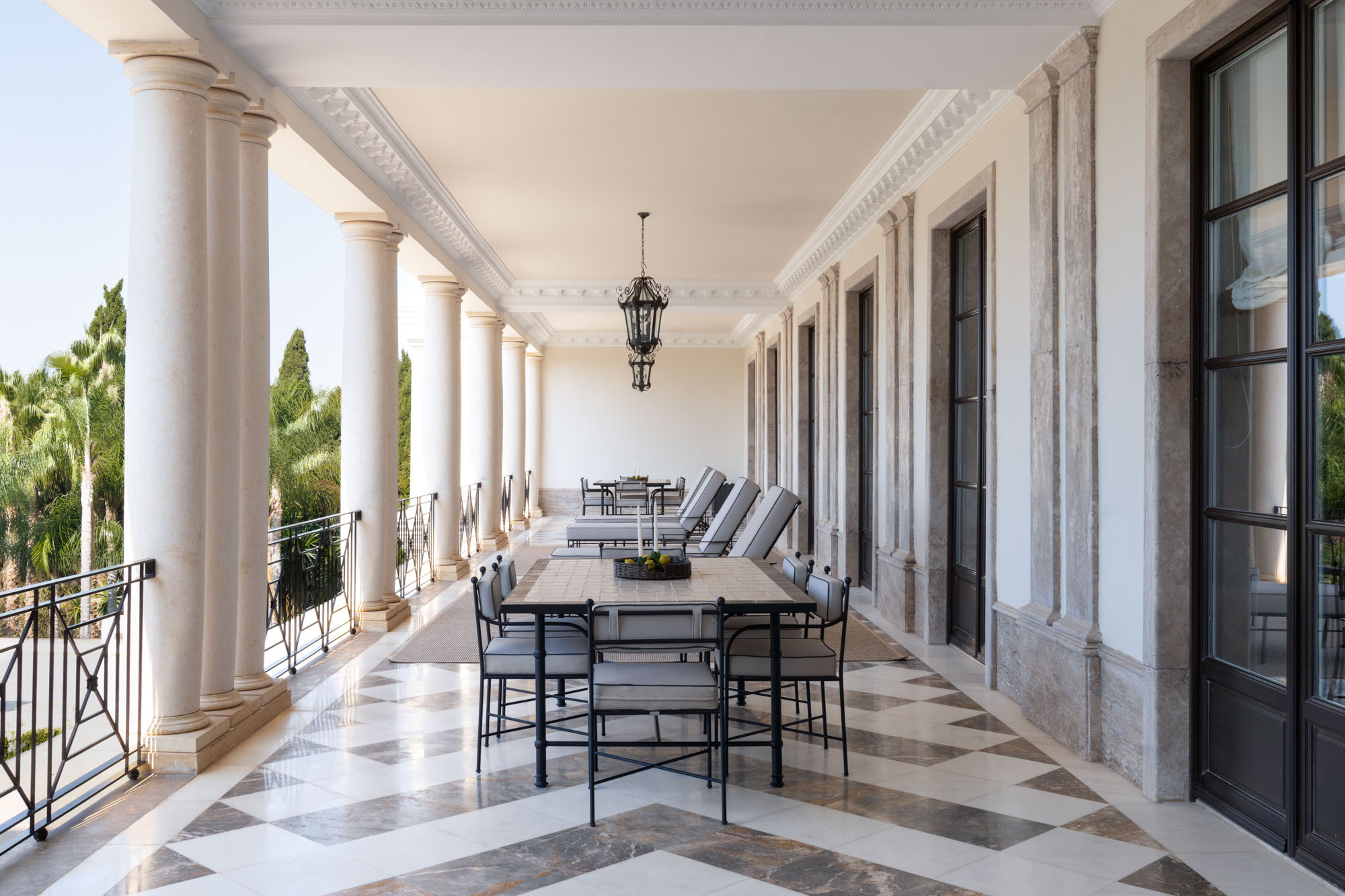 For seamless indoor-outdoor flow, these open directly onto a terrace lined with ornamental ponds, fountains and mature olive trees. While gold panelling and glittering chandeliers add a touch of opulence, the atmosphere remains calm – anchored by a soft palette of creams and dove greys.