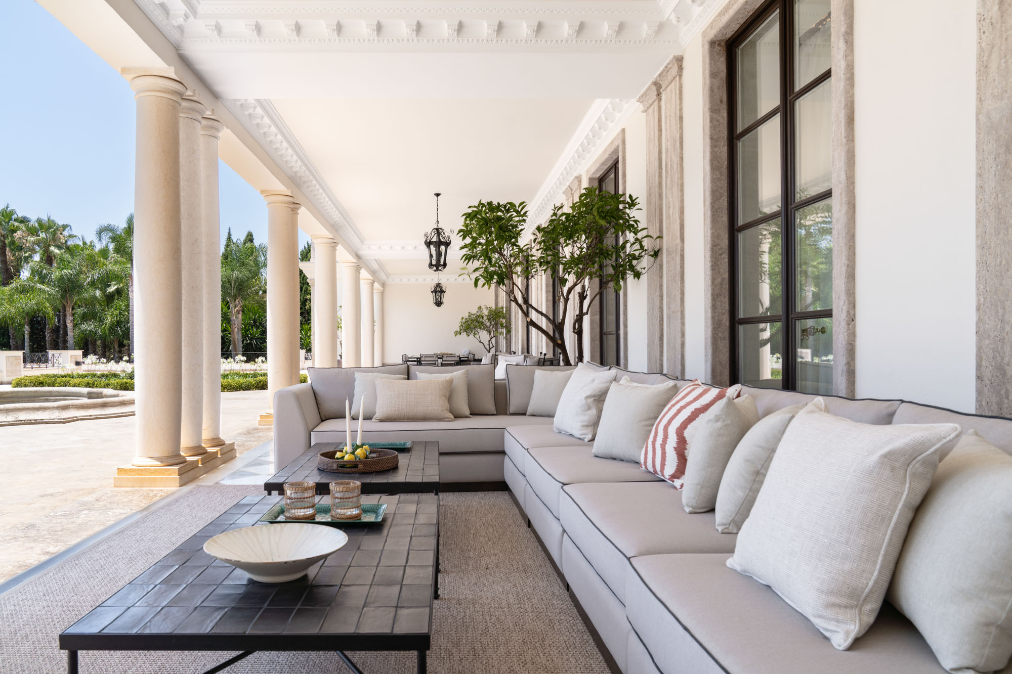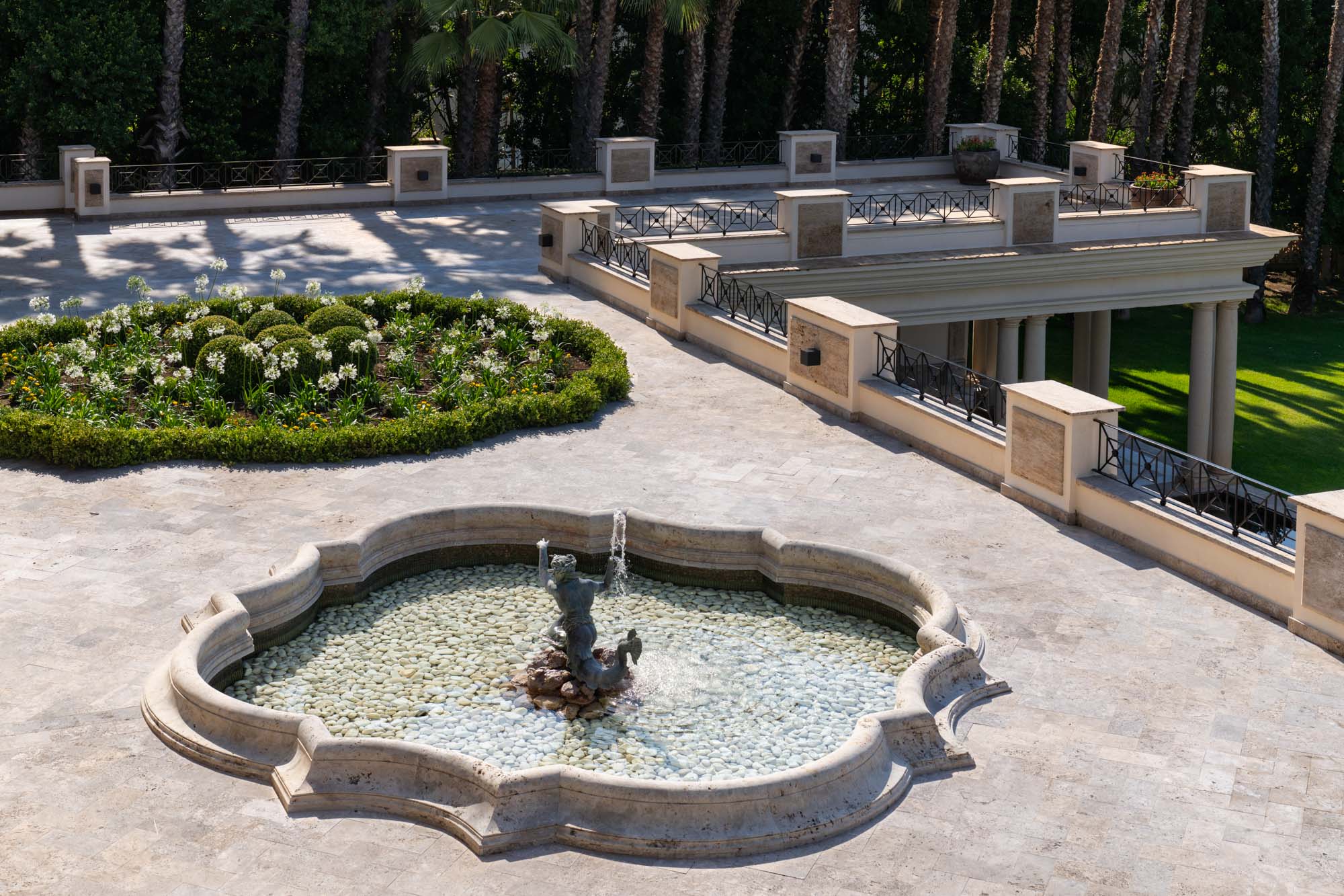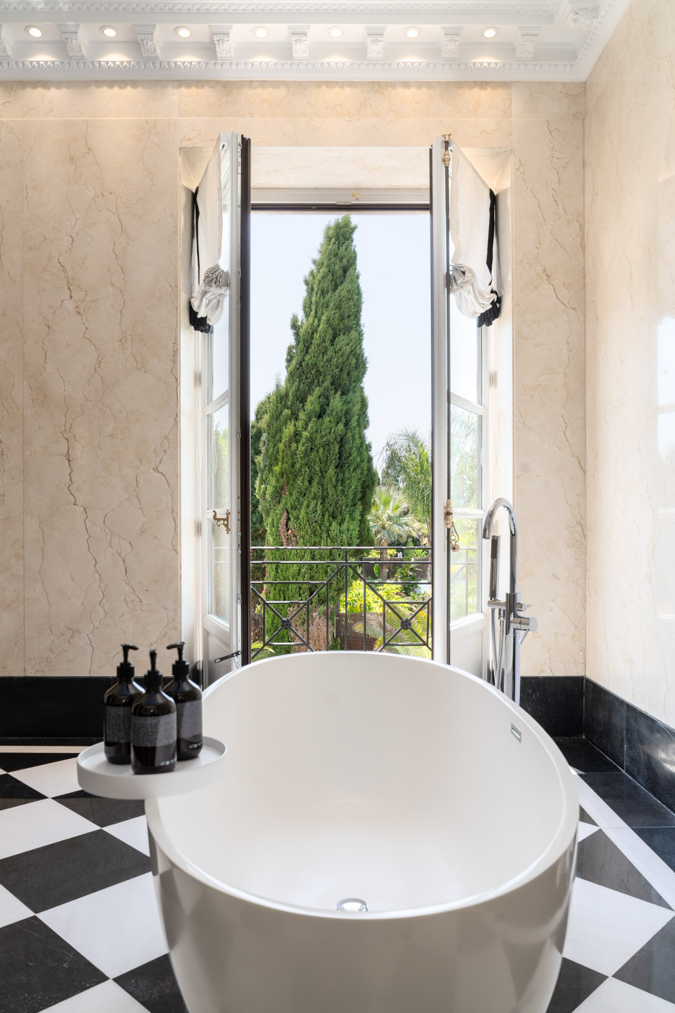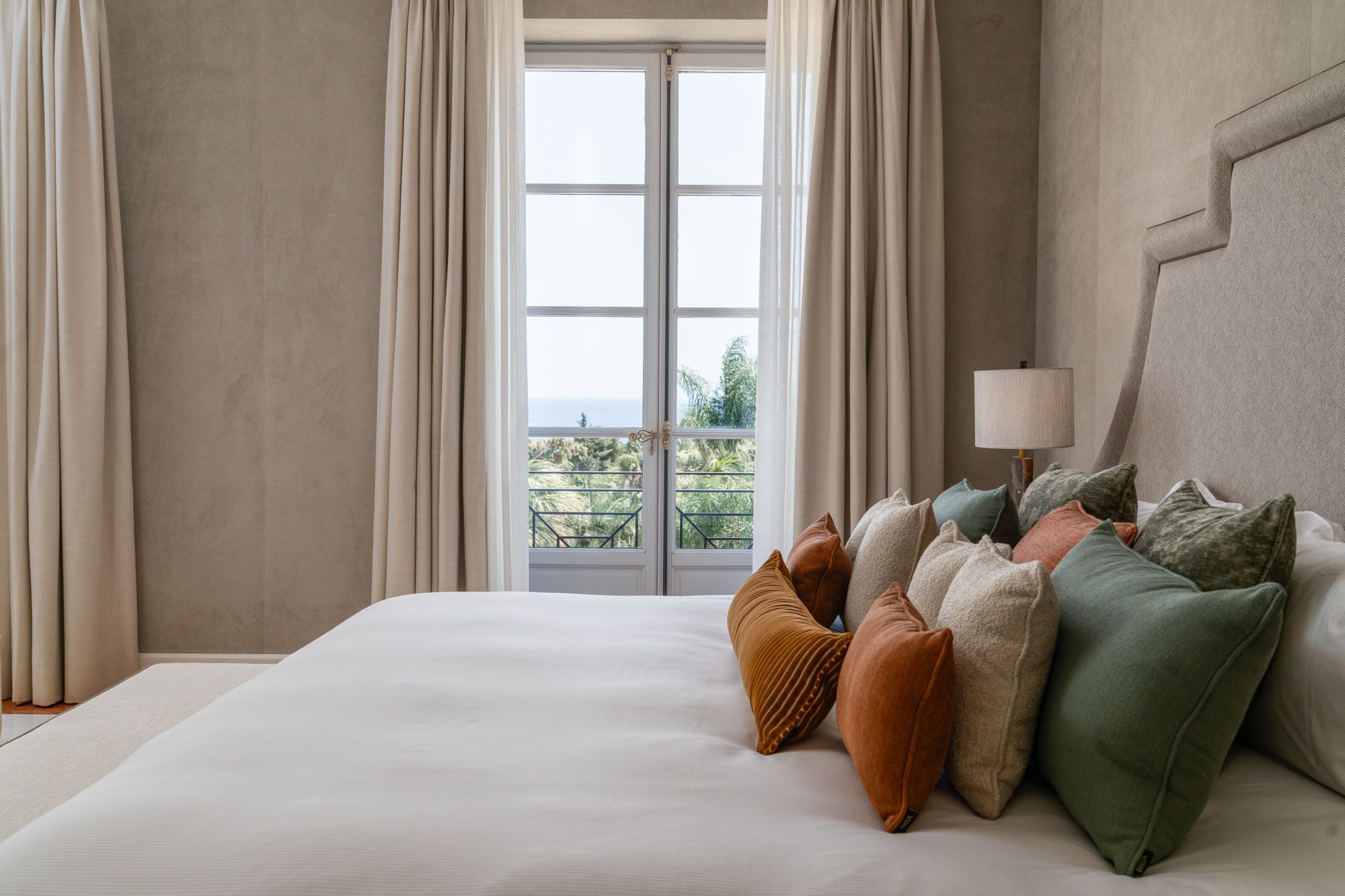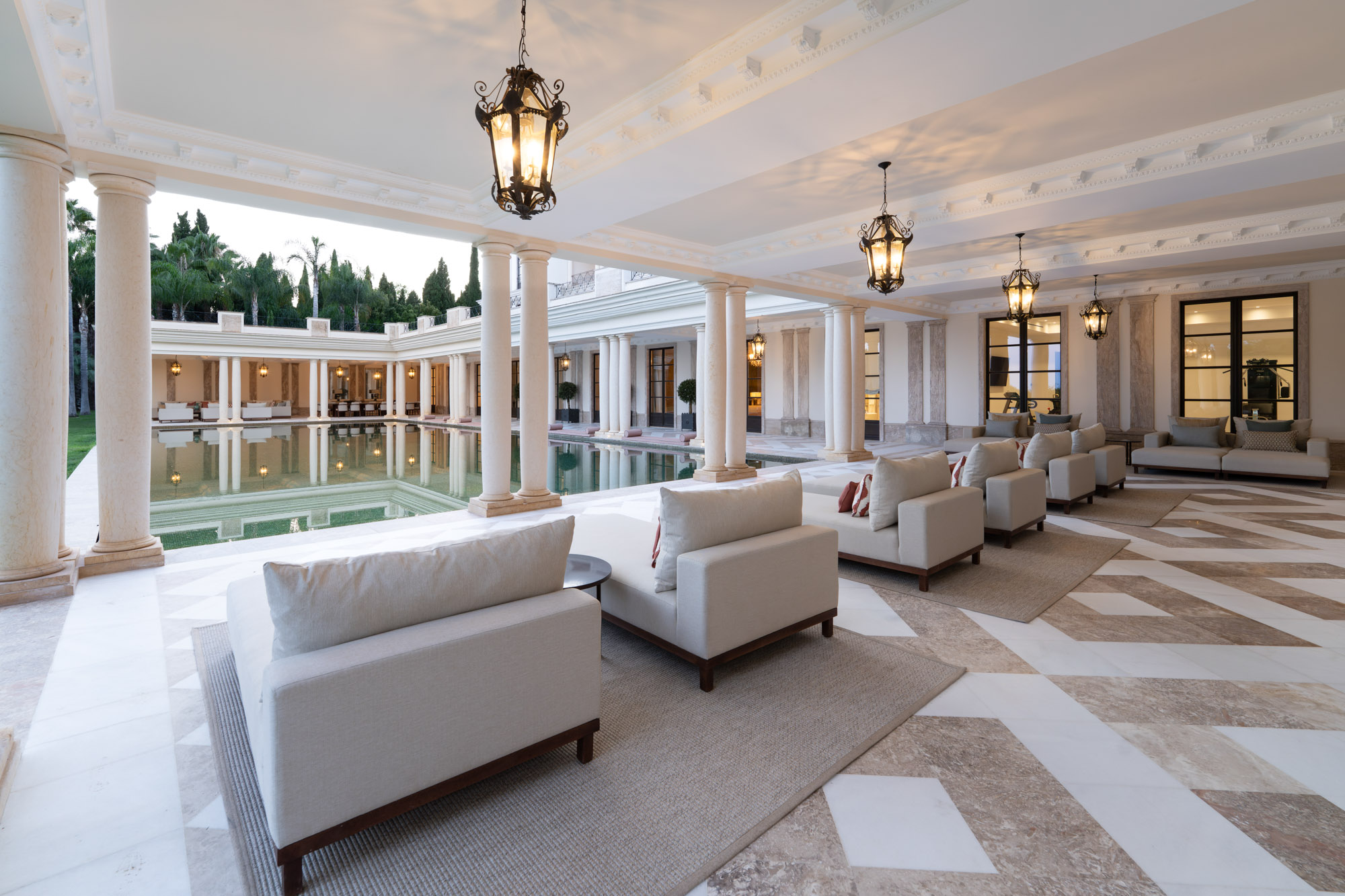 For seamless indoor-outdoor flow, these open directly onto a terrace lined with ornamental ponds, fountains and mature olive trees. While gold panelling and glittering chandeliers add a touch of opulence, the atmosphere remains calm – anchored by a soft palette of creams and dove greys.