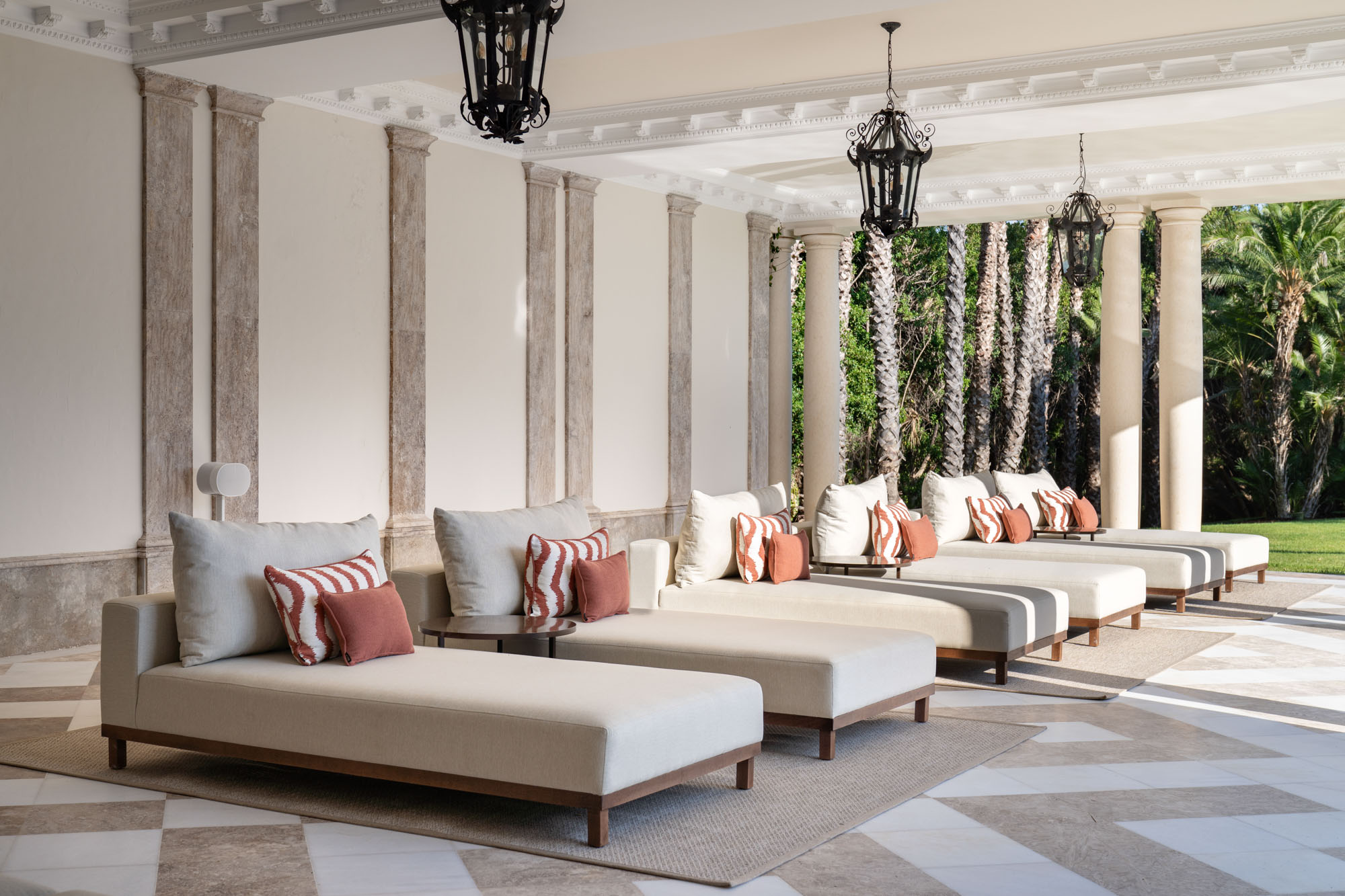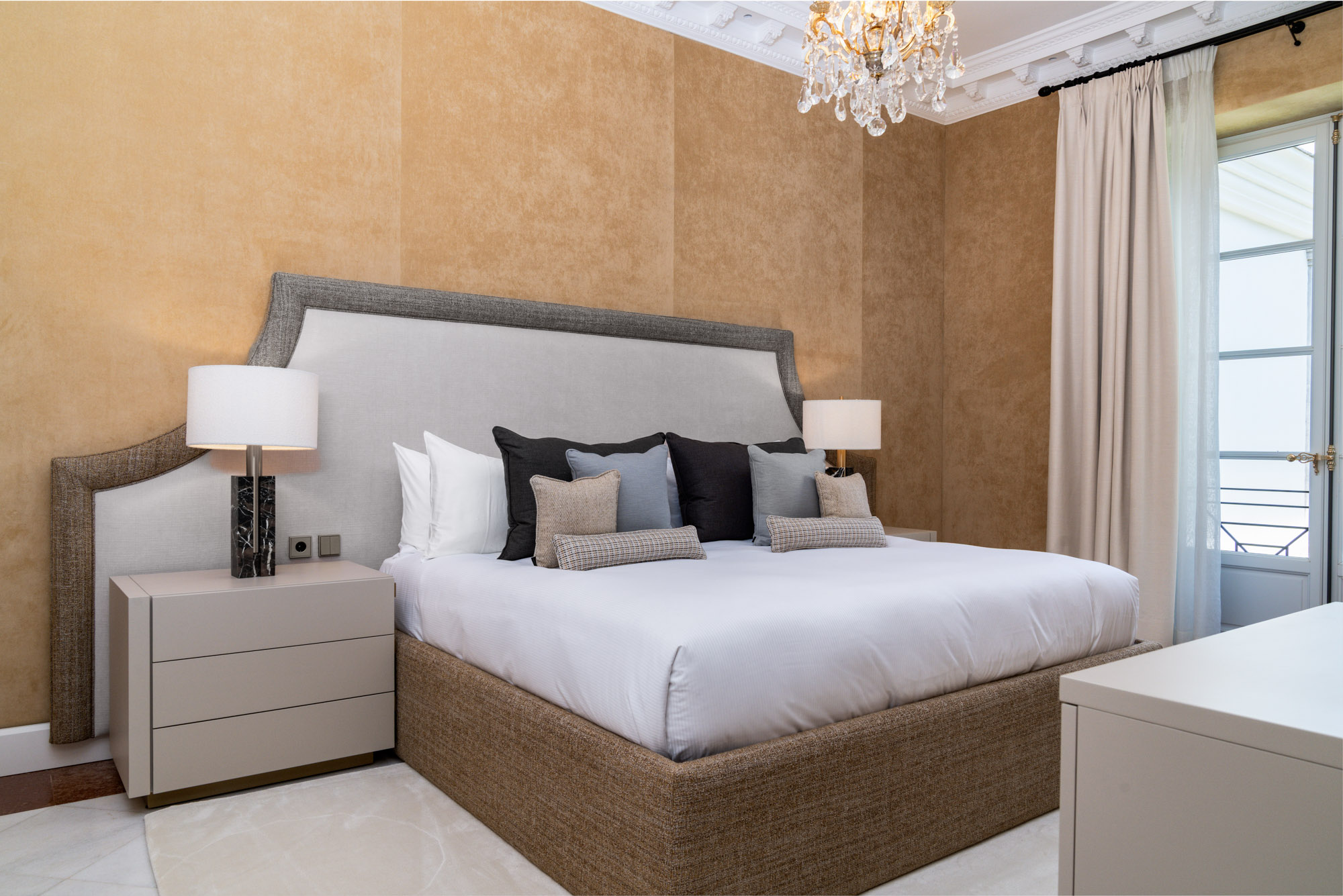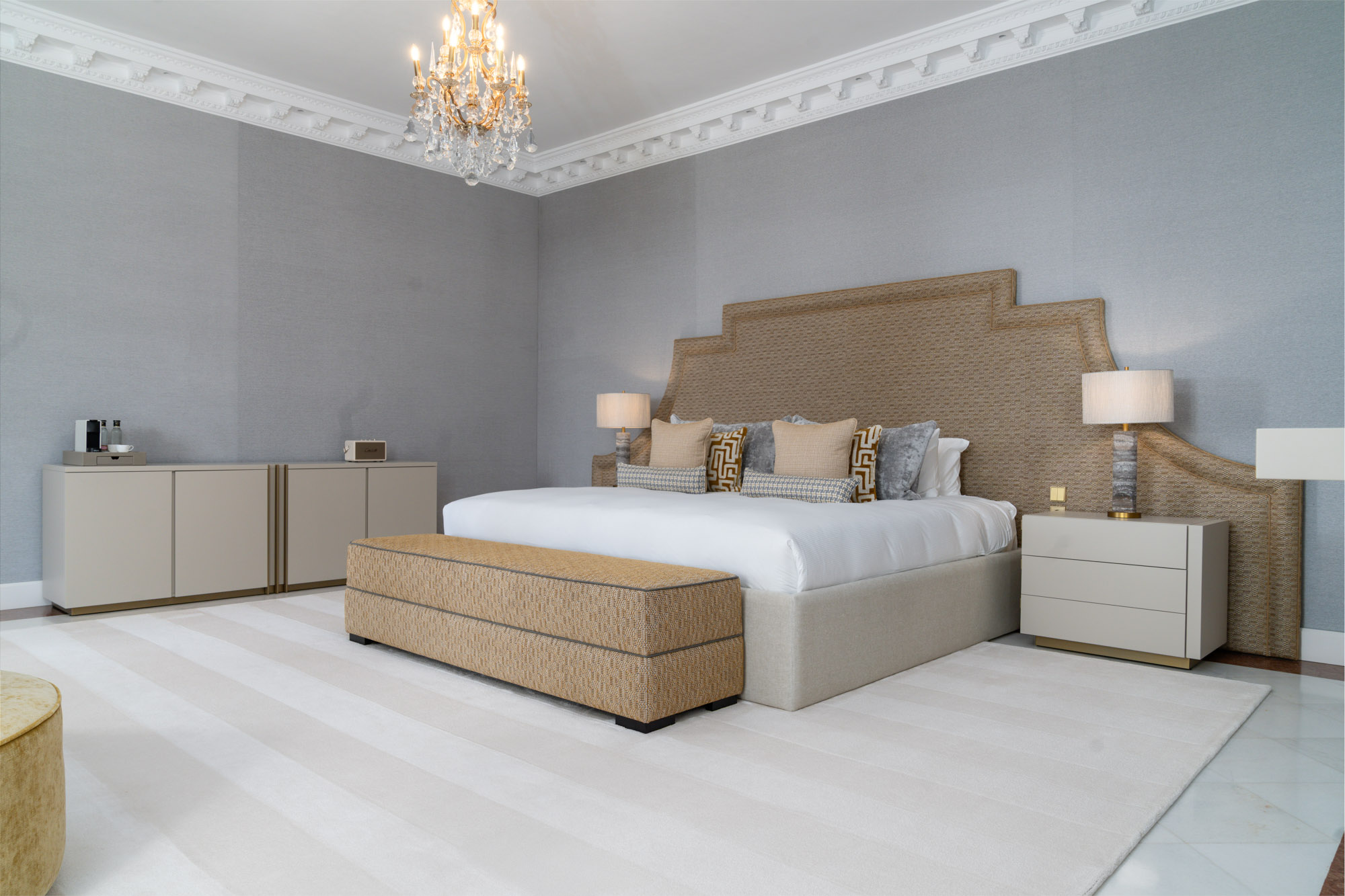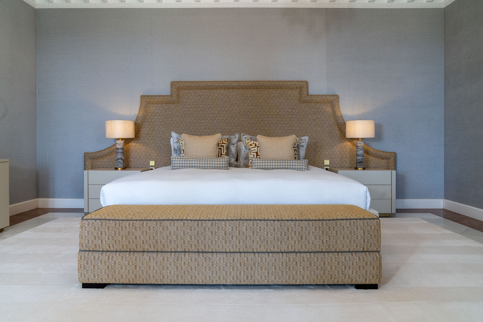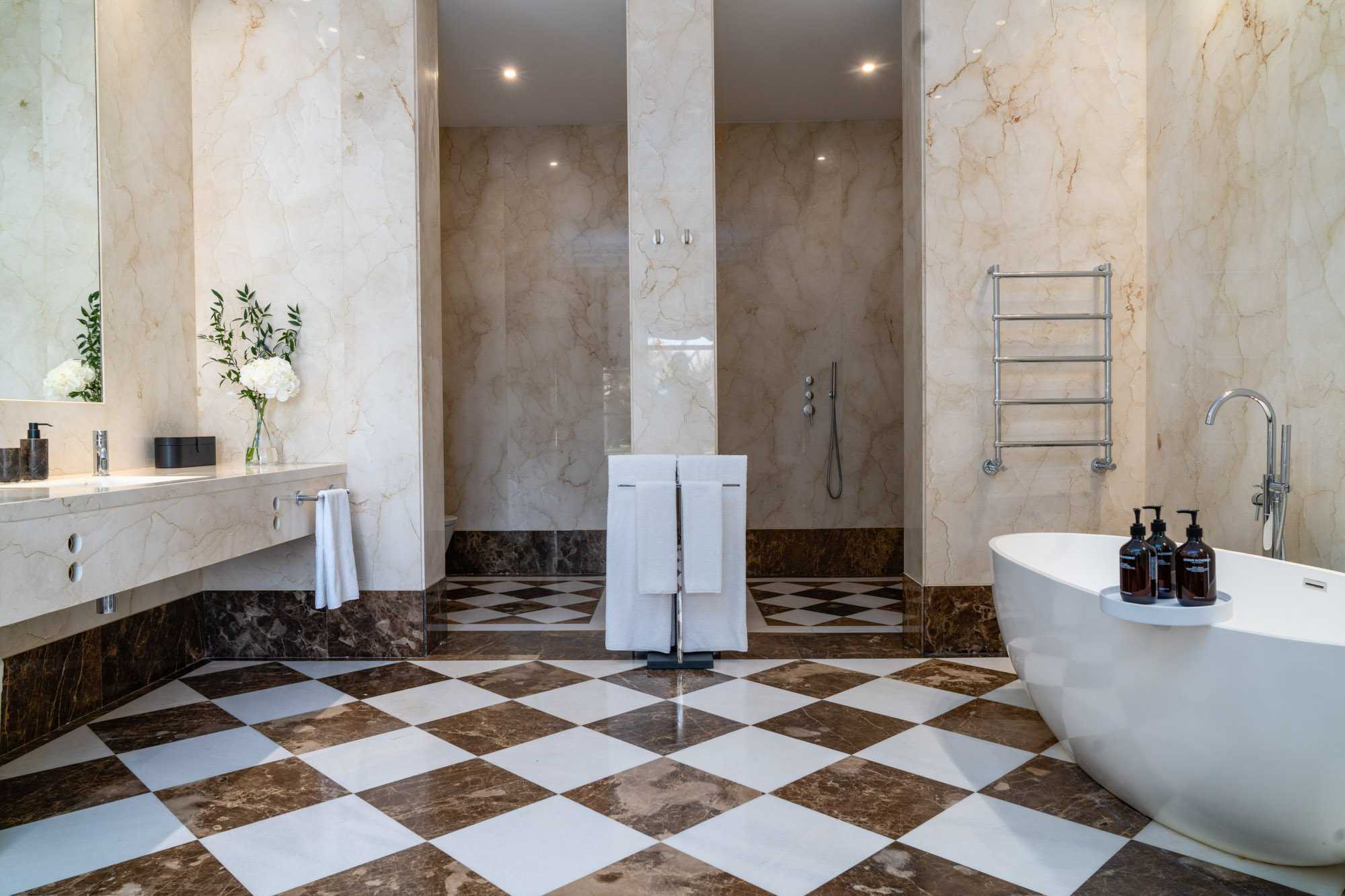 For seamless indoor-outdoor flow, these open directly onto a terrace lined with ornamental ponds, fountains and mature olive trees. While gold panelling and glittering chandeliers add a touch of opulence, the atmosphere remains calm – anchored by a soft palette of creams and dove greys.