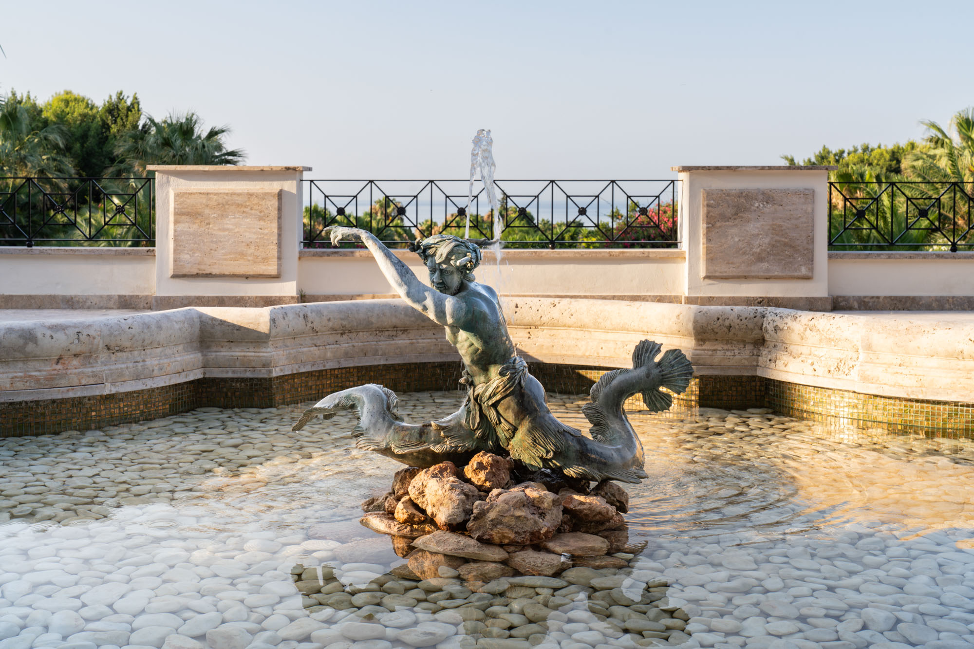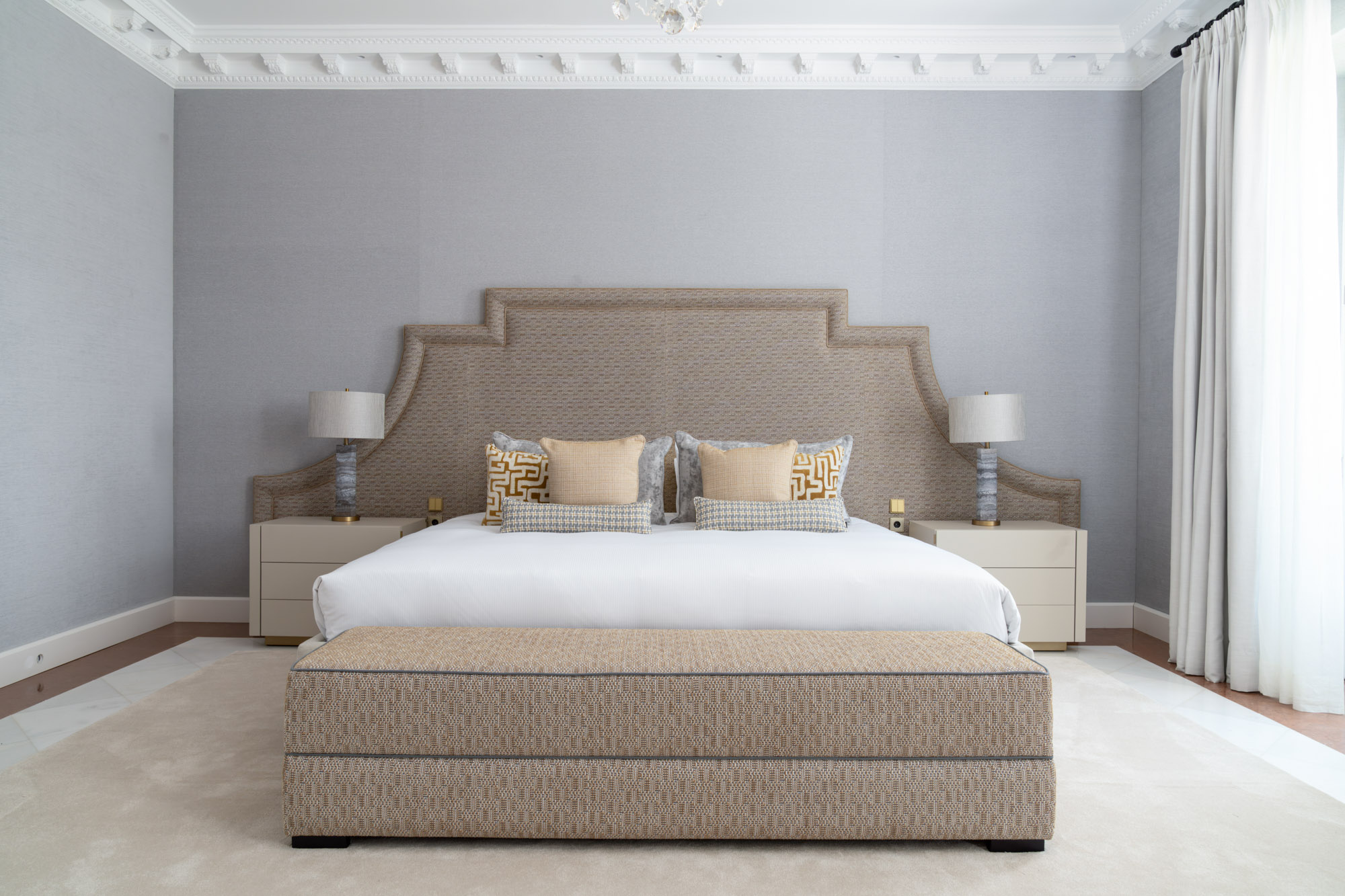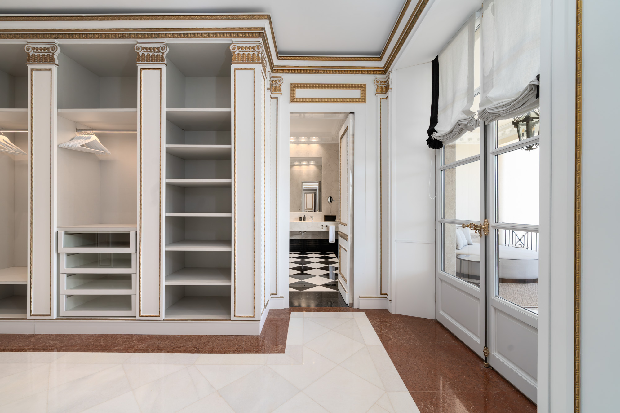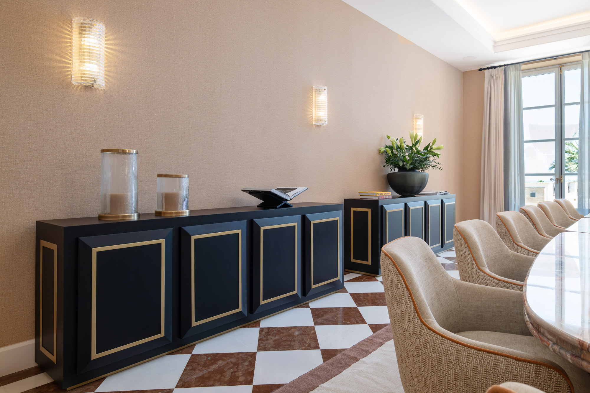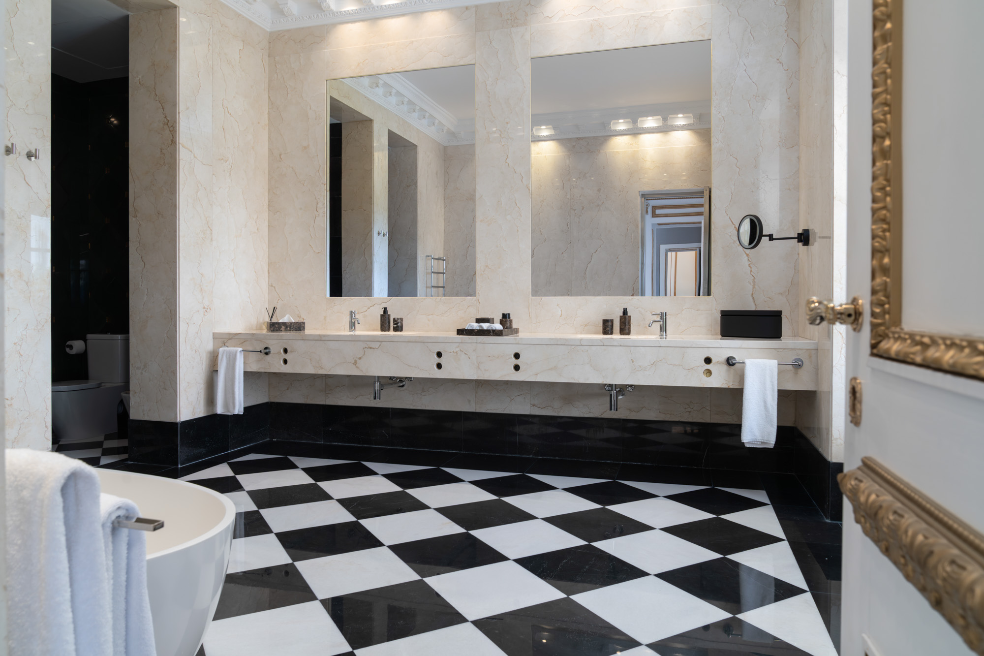 For seamless indoor-outdoor flow, these open directly onto a terrace lined with ornamental ponds, fountains and mature olive trees. While gold panelling and glittering chandeliers add a touch of opulence, the atmosphere remains calm – anchored by a soft palette of creams and dove greys.