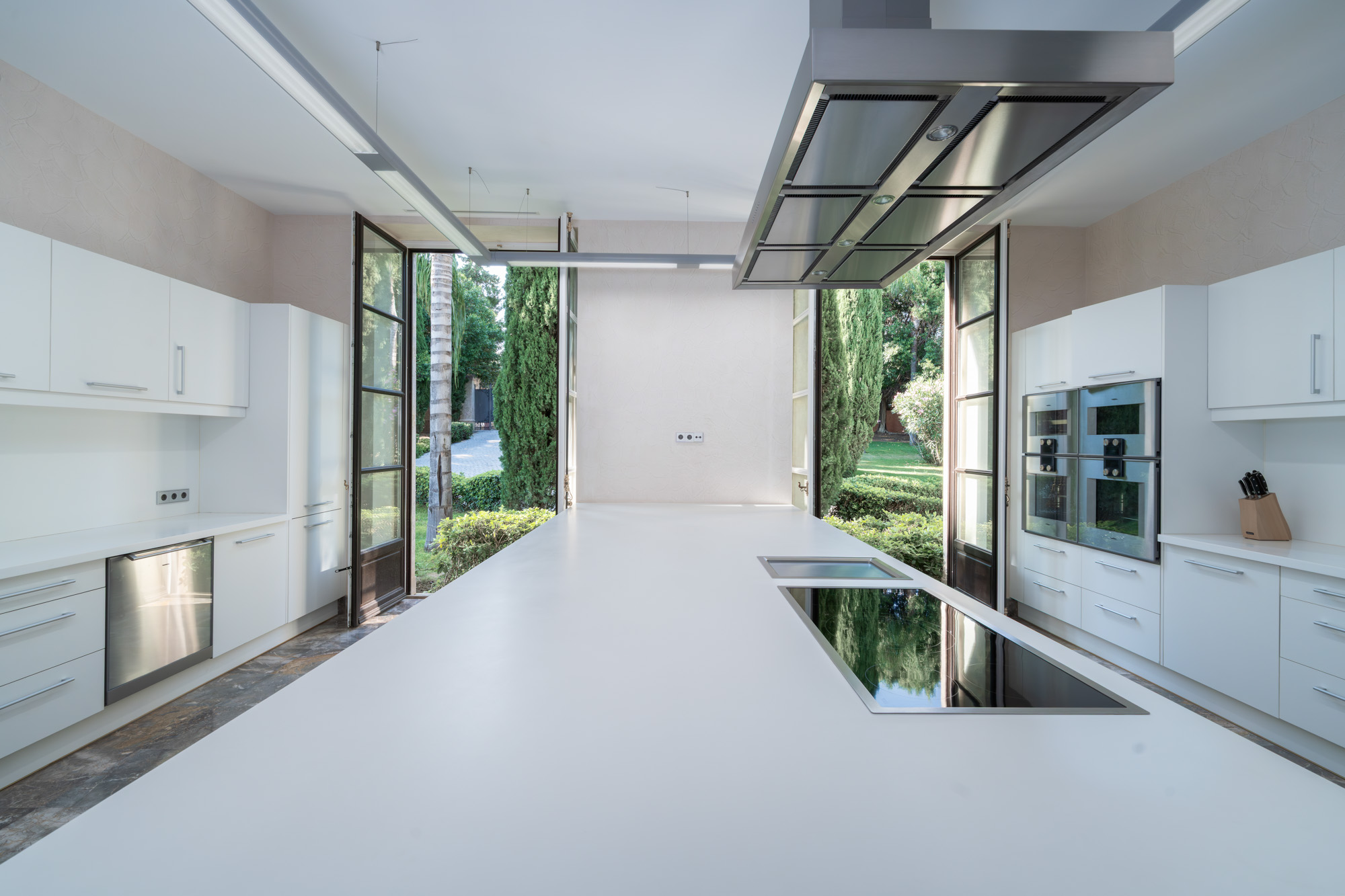 The main living space at Villa Cristaux stretches along one wing of the ground floor and is flooded with natural light, thanks to double-height windowed doors.