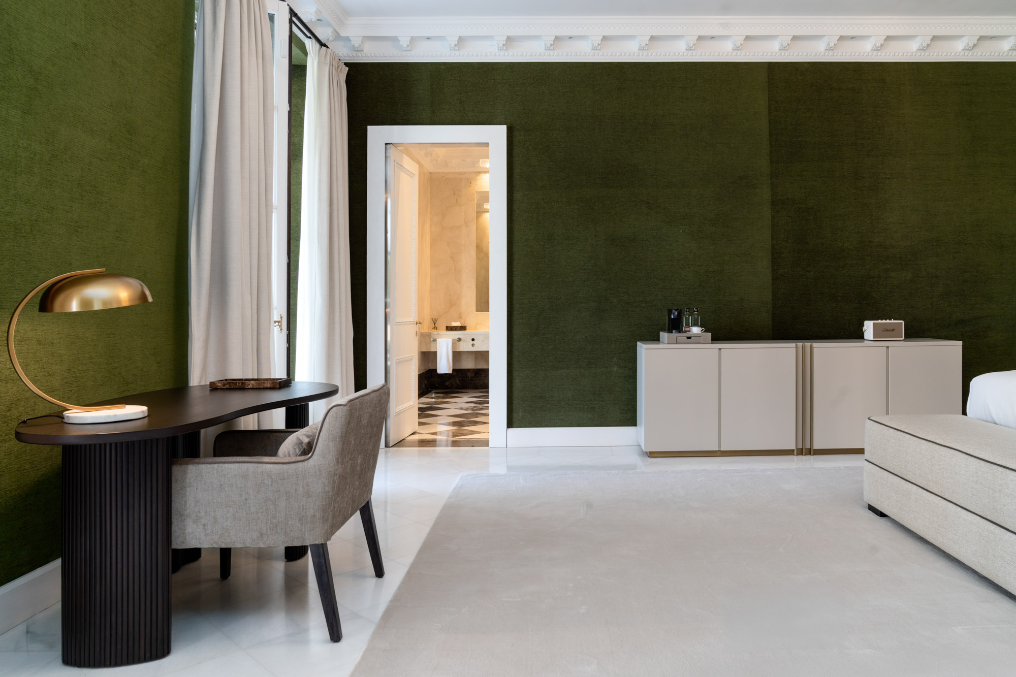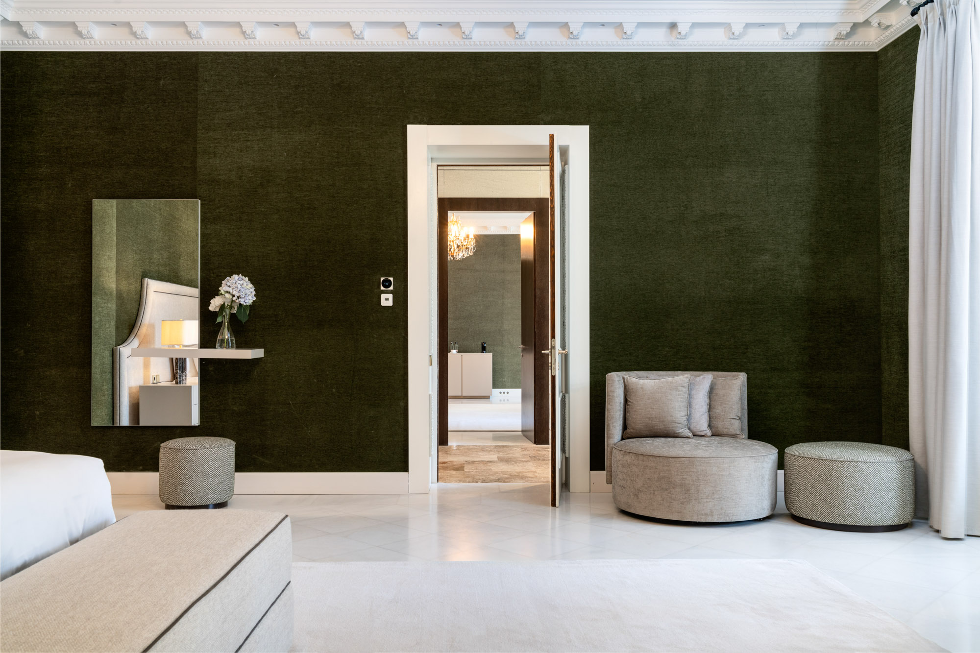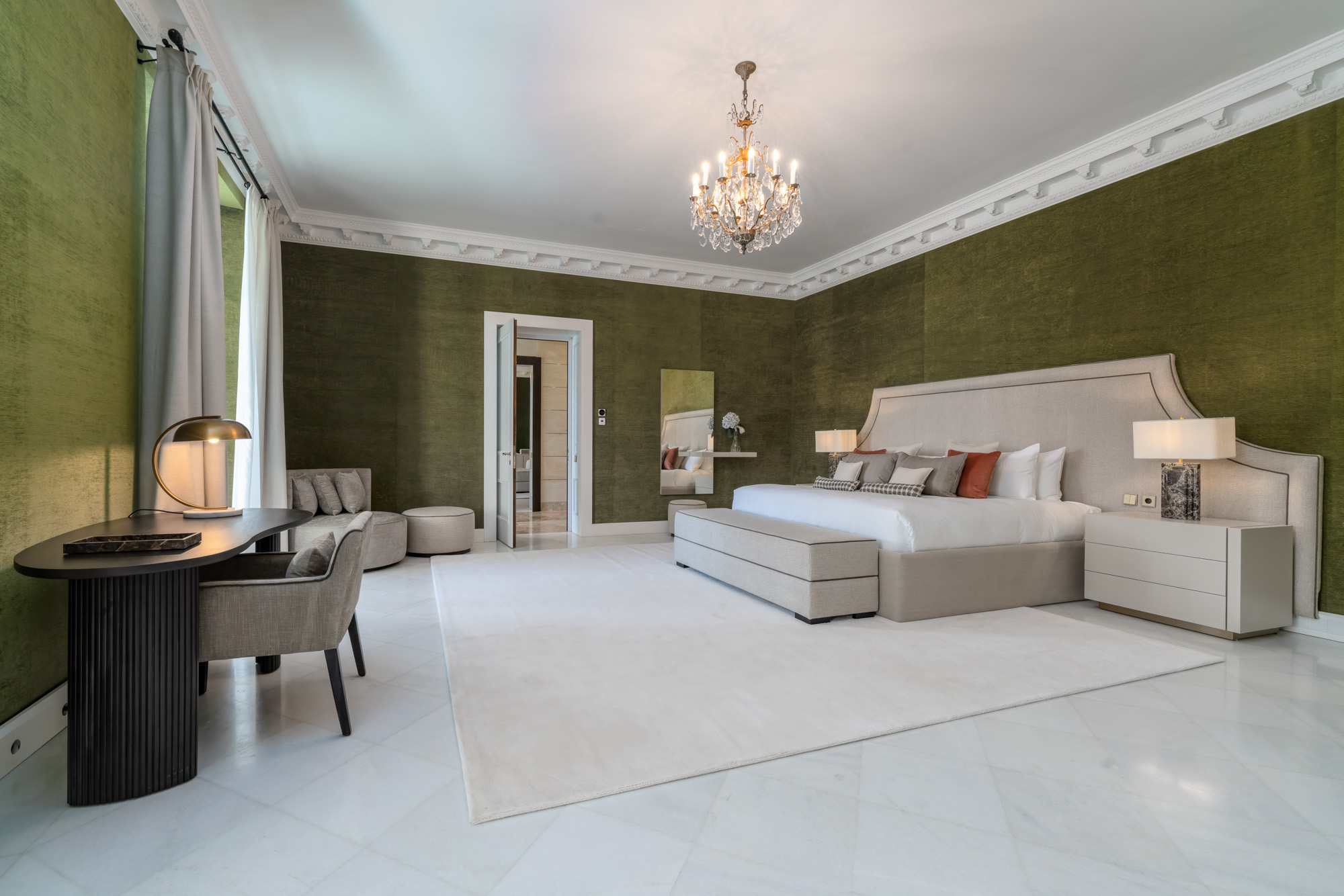 Guest Bedroom 7: Located on the ground floor, poolside, this suite features a 220cm x 200cm custom-made bed, a dressing room, and a daybed upholstered in dove grey velvet. French doors open directly onto the garden terrace, with forest green tones inside echoing the surrounding landscape. The en-suite bathroom mirrors the standard of the upper suites but is finished in coffee-brown marble. Includes a freestanding tub, walk-in shower, twin basins, and dressing area.