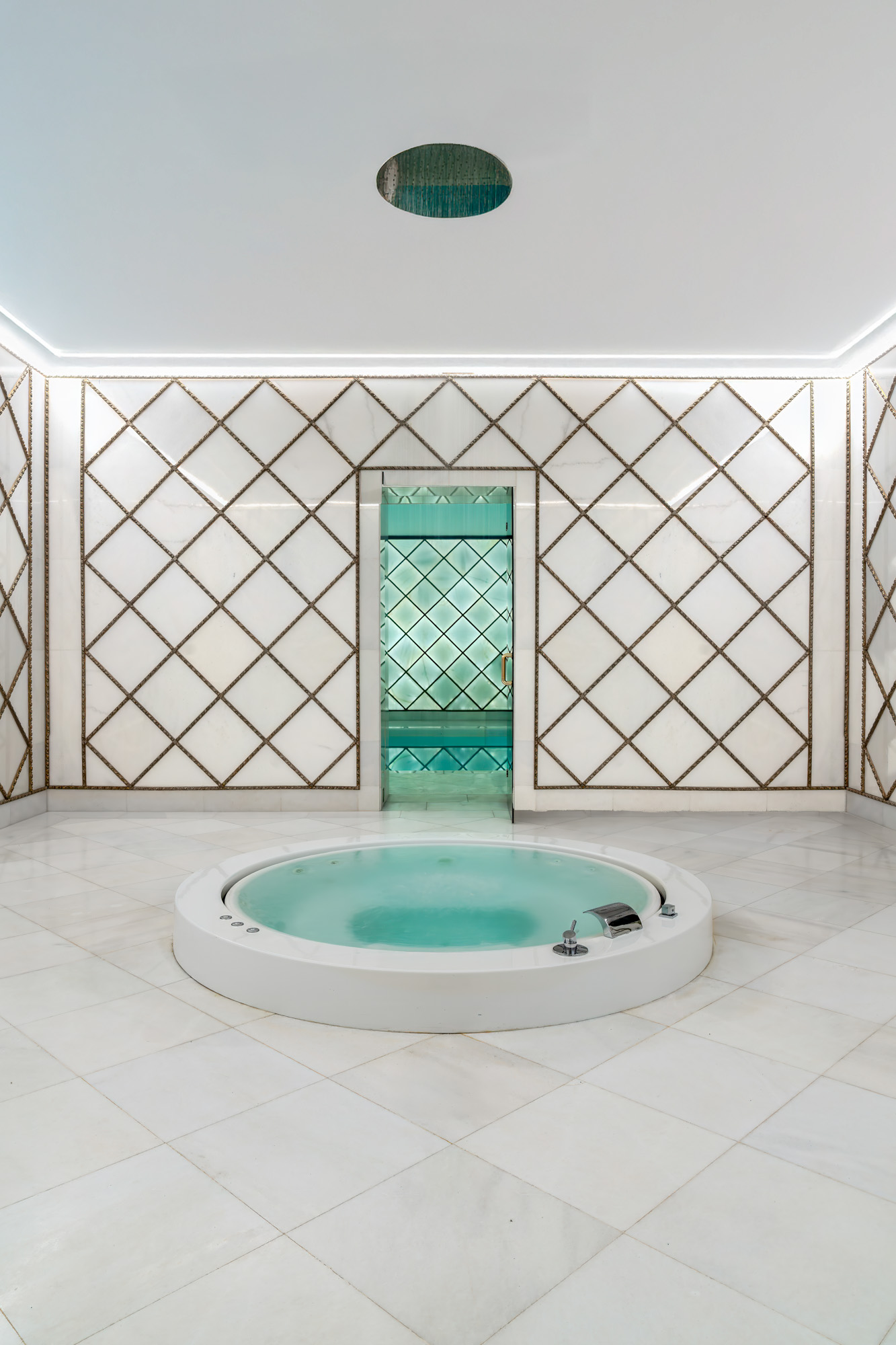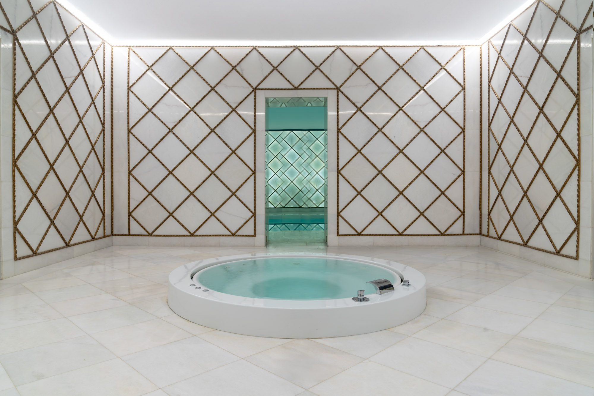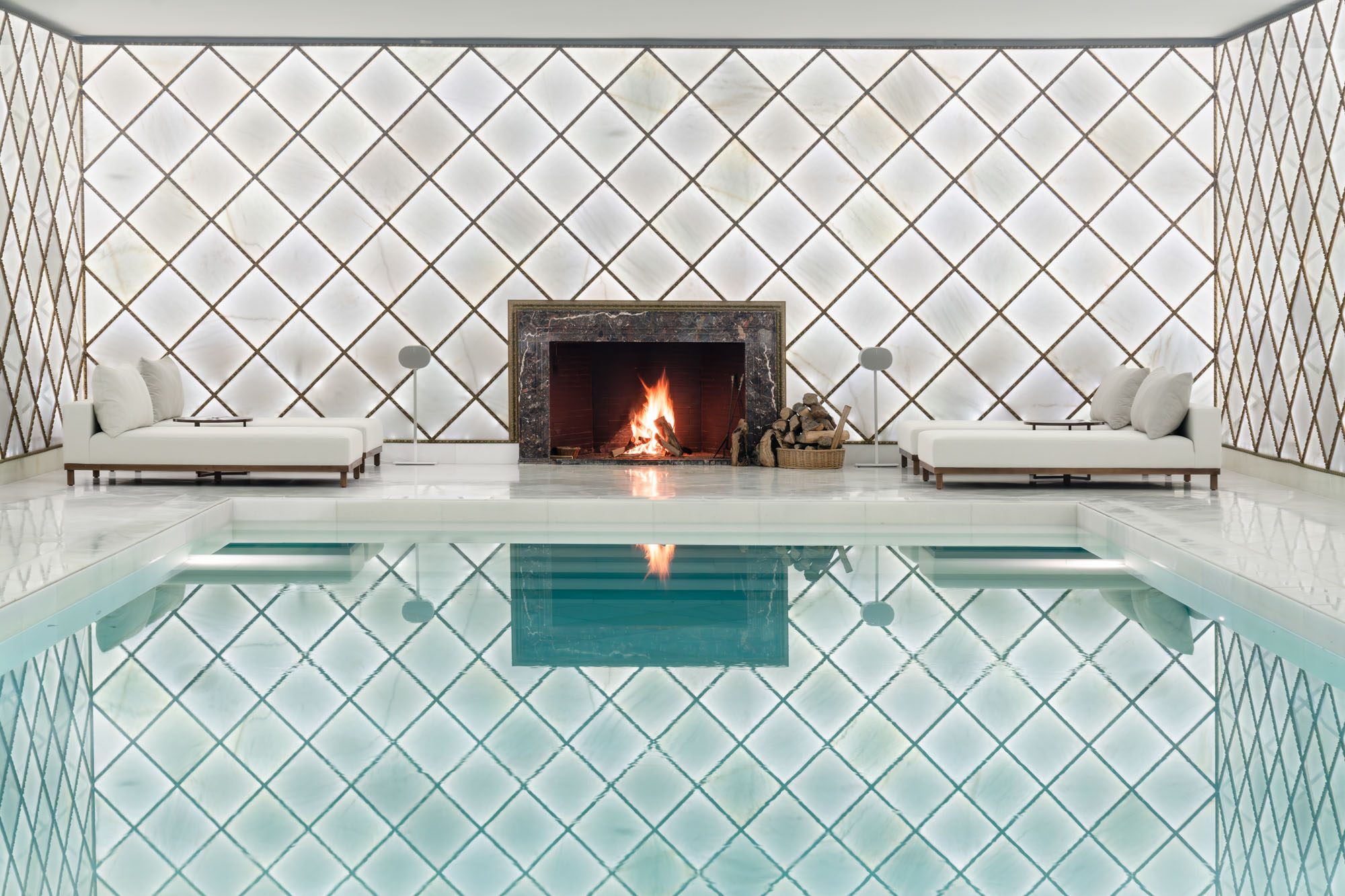 At its centre lies a show-stopping indoor pool, enveloped in smooth white marble, softly backlit to create an almost ethereal glow – the effect of which is both dramatic and deeply calming.