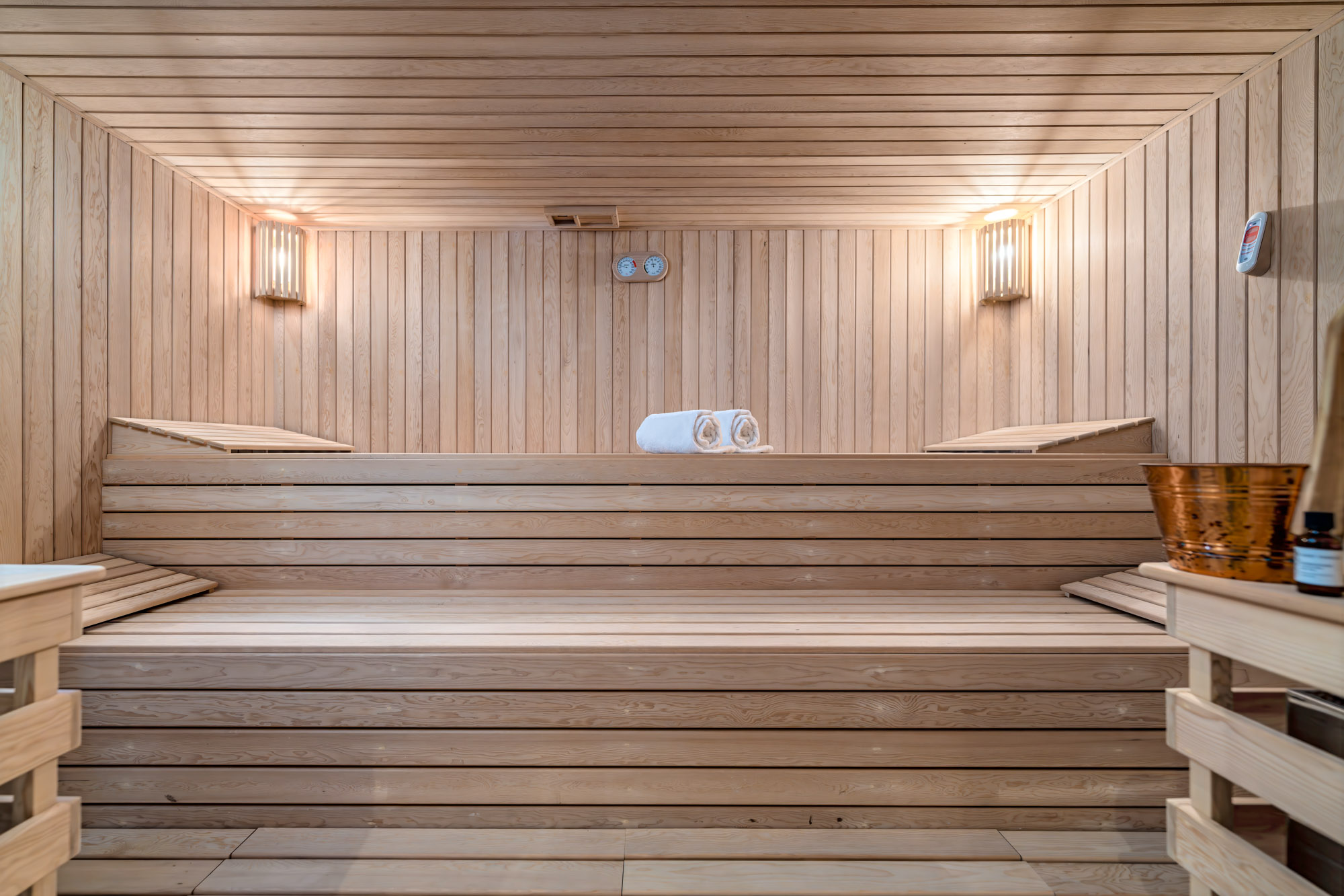 The wellness wing includes an indoor pool, treatment room, sauna, and massage suite, with a Technogym fitness space on hand for PT sessions or small-group training.